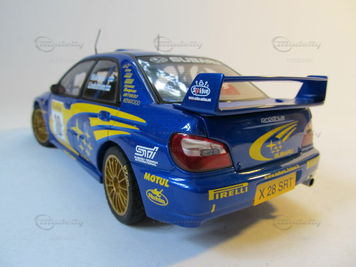 The model by AUTOart Performance in a 1/18 scale stands out with its meticulous reproduction of the original design. The distinctive blue paint with yellow stars and stripes, symbolizing the Subaru logo, is perfectly realized in this miniature. The gold-colored wheels catch the eye at first glance, another characteristic design element of the WRC model. The detailed sponsor stickers, including Pirelli, Kenwood, and Prodrive, give the miniature additional realism and authenticity.