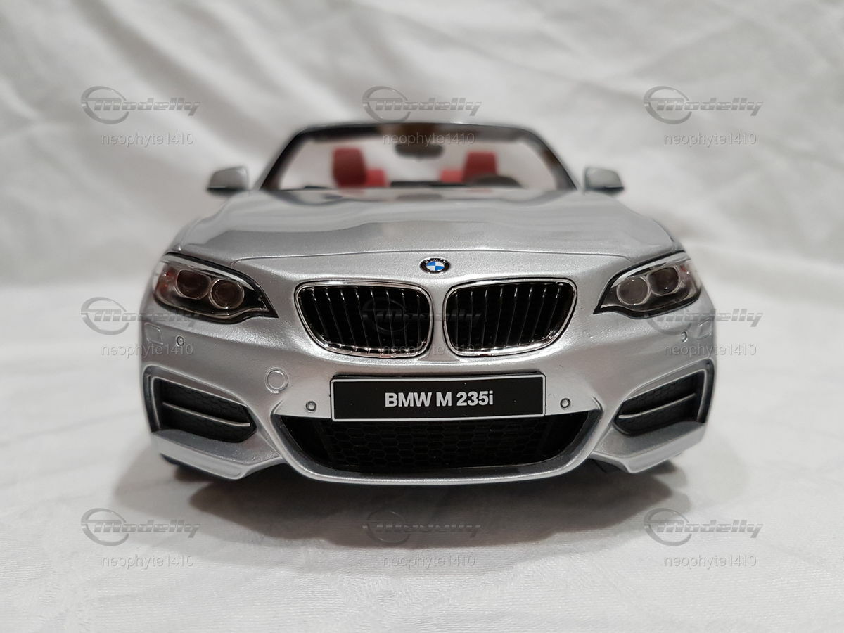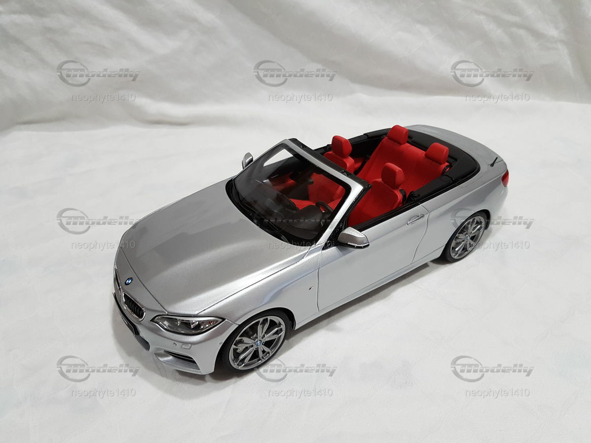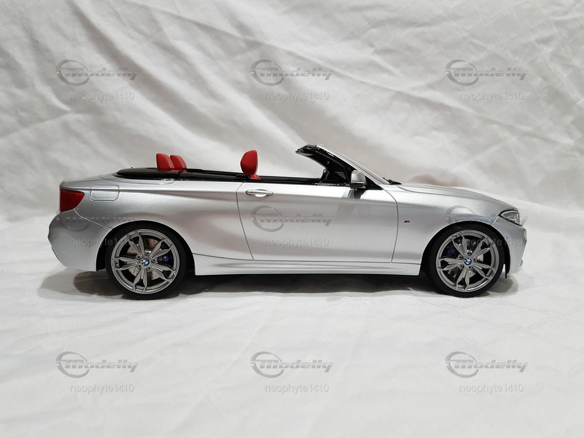 The model of the BMW M235i Cabrio (F23) showcased here is crafted by GT Spirit in a 1/18 scale. This model car is an exact replica of the original and boasts impressive details. The silver metallic finish mirrors the elegant look of the original. The red sport seats and detailed dashboard are replicated down to the smallest detail, making the model particularly authentic. Collector "neophyte1410" has added this miniature to their collection, and it's easy to see why. The realistic representation, especially the fine lines and M badges, showcases the quality for which GT Spirit is renowned. The brake calipers and wheels are faithfully reproduced, adding to the impressive image.
