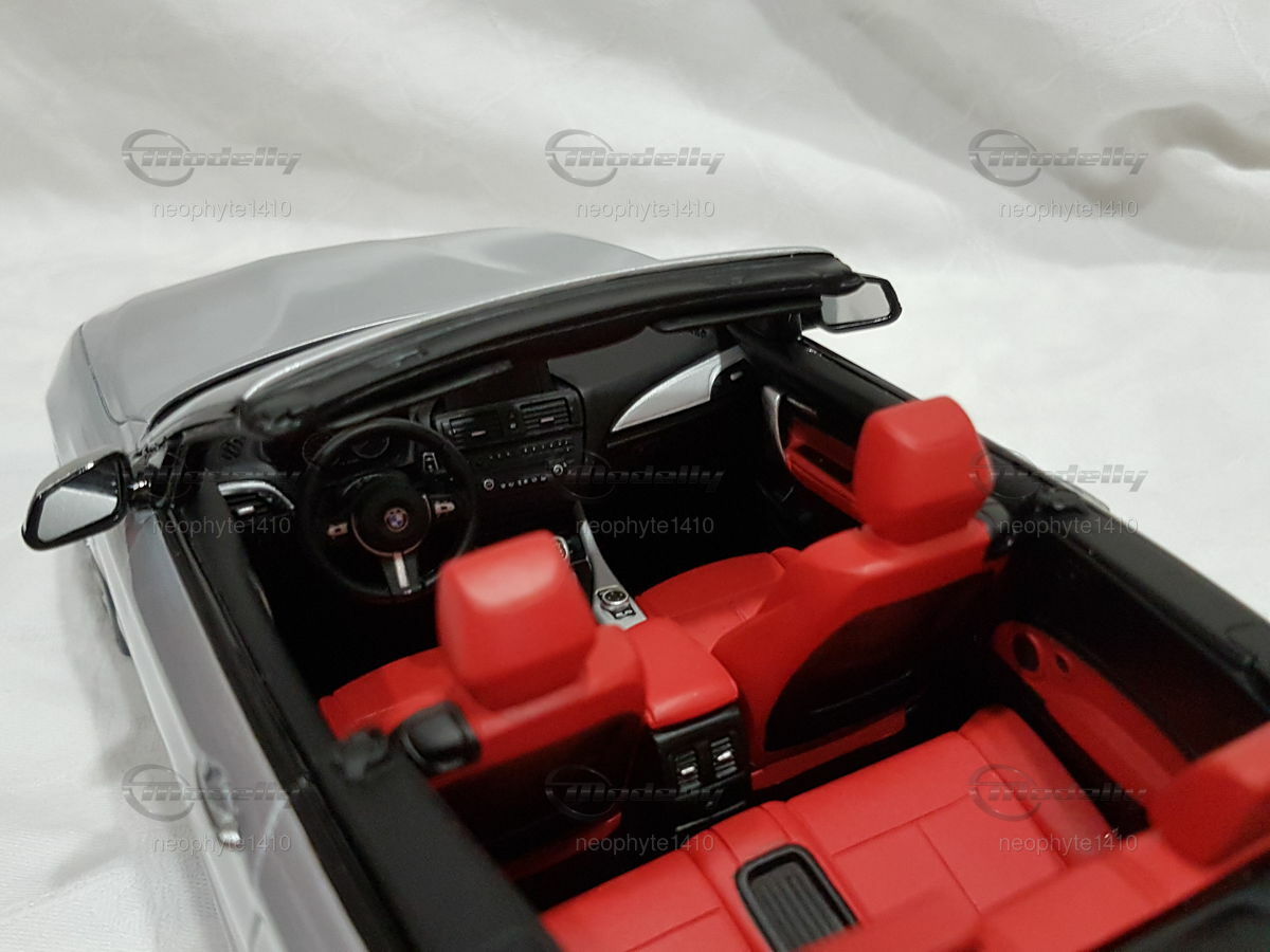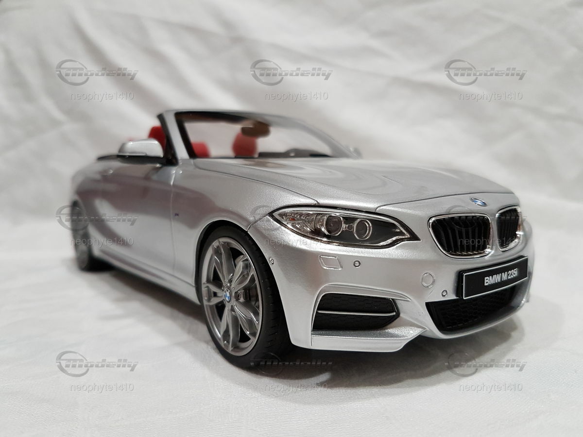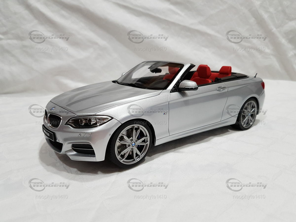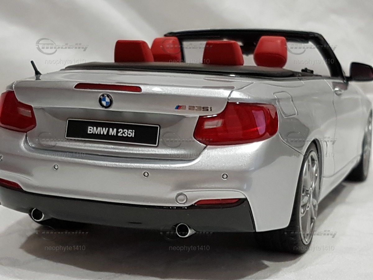 The model of the BMW M235i Cabrio (F23) showcased here is crafted by GT Spirit in a 1/18 scale. This model car is an exact replica of the original and boasts impressive details. The silver metallic finish mirrors the elegant look of the original. The red sport seats and detailed dashboard are replicated down to the smallest detail, making the model particularly authentic. Collector "neophyte1410" has added this miniature to their collection, and it's easy to see why. The realistic representation, especially the fine lines and M badges, showcases the quality for which GT Spirit is renowned. The brake calipers and wheels are faithfully reproduced, adding to the impressive image.