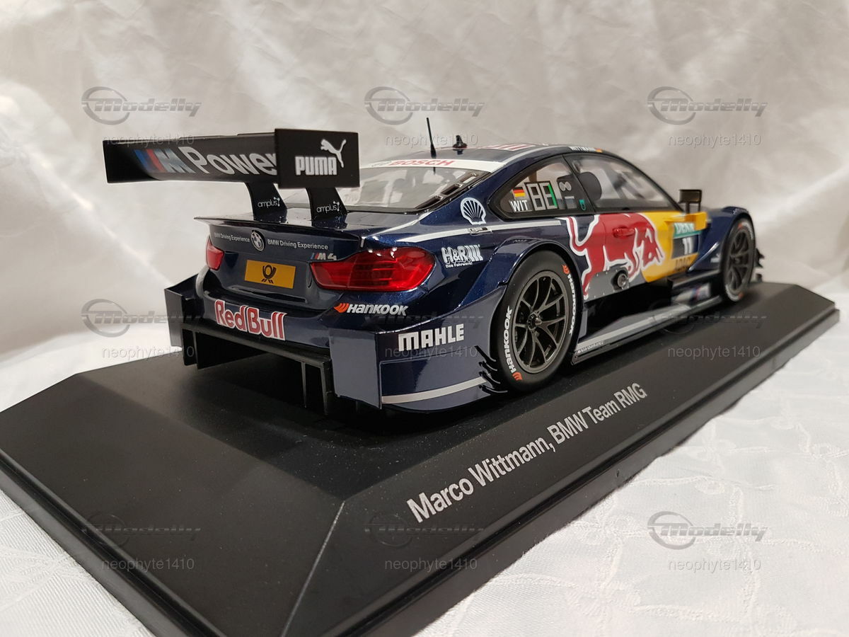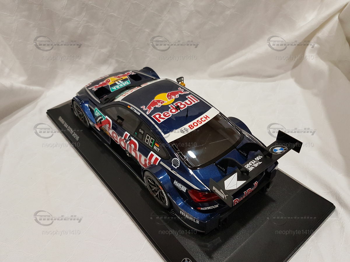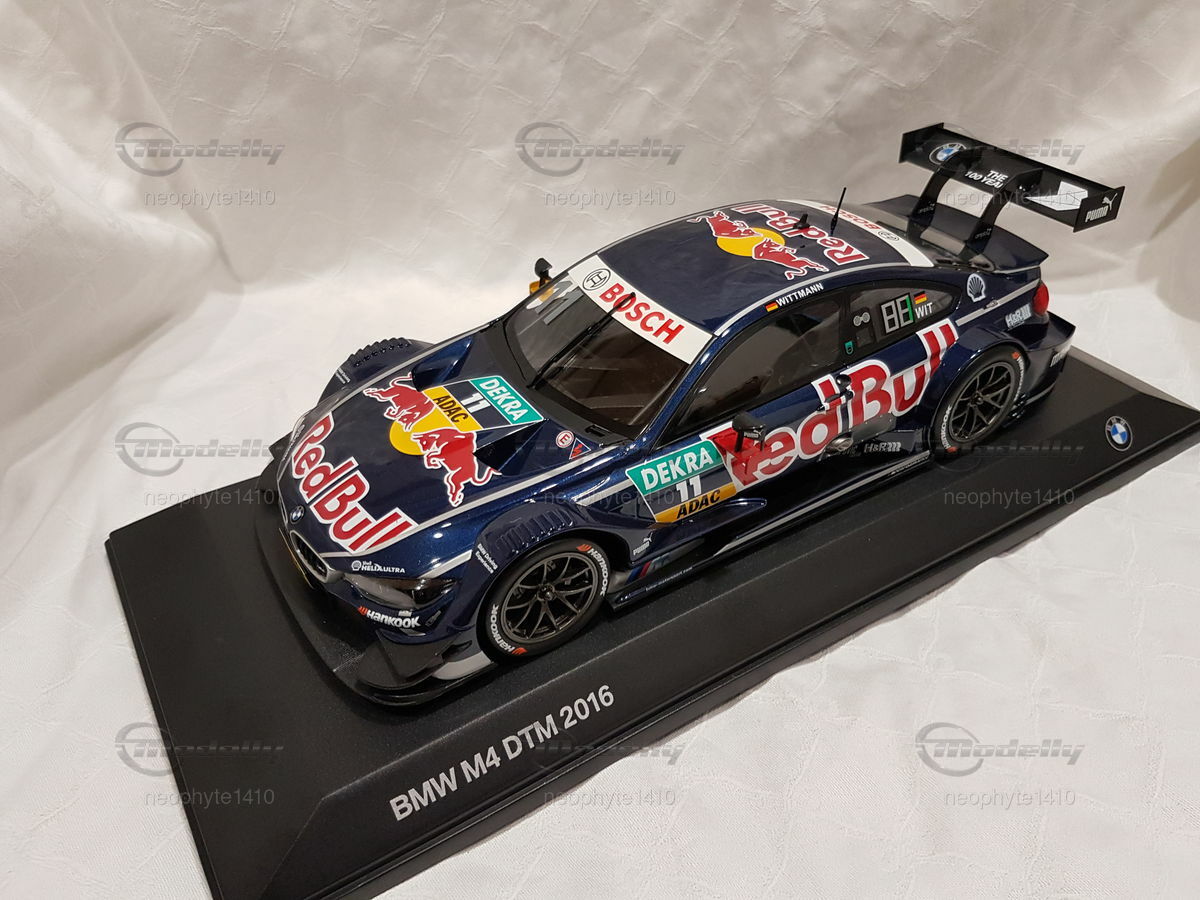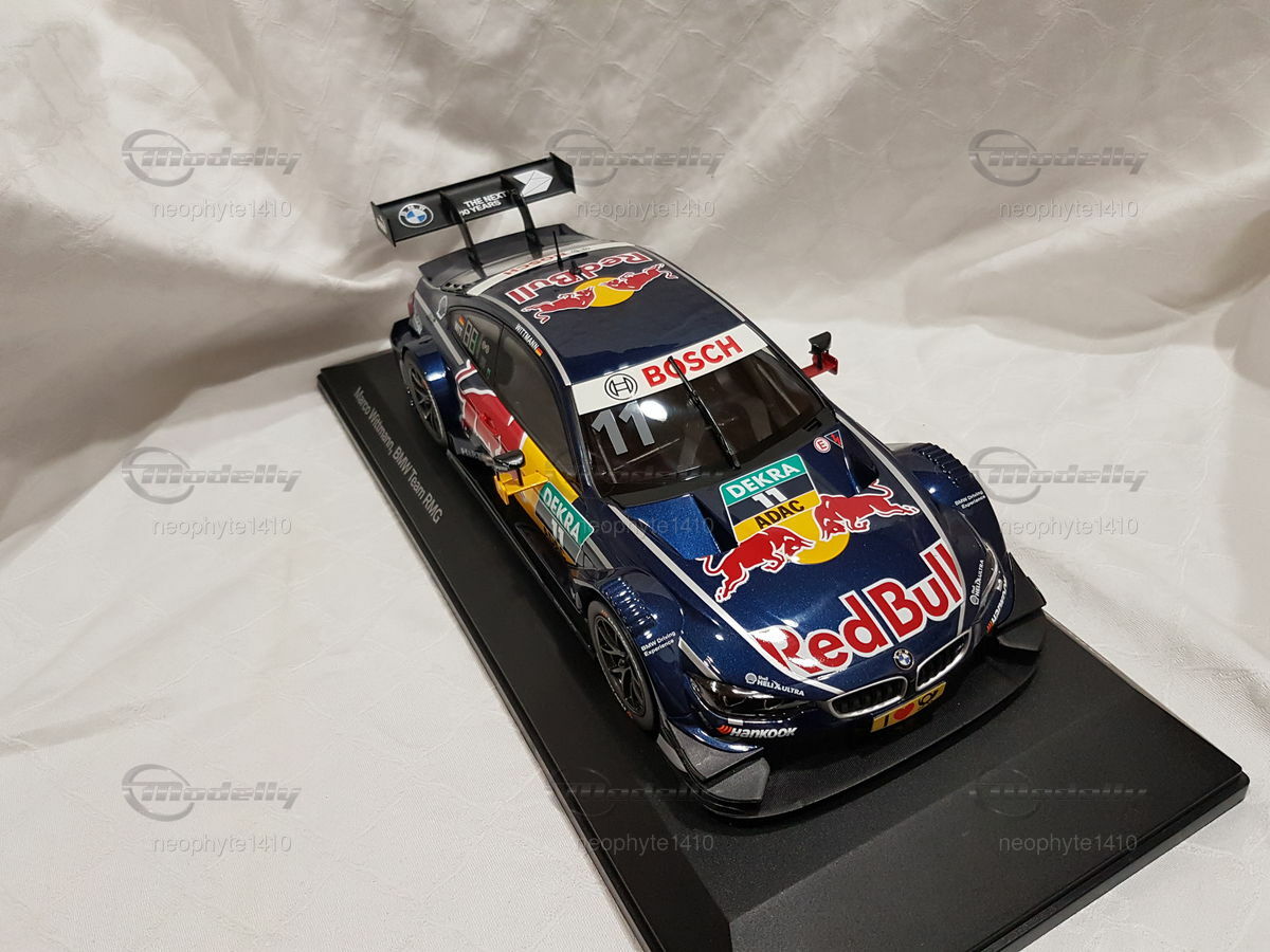The model car in 1/18 scale, which you see in front of you, is based on the BMW M4 DTM from the year 2016. The original version of the vehicle comes from the F82 generation, which was built from 2014 to 2020. The DTM racing car from 2016 was driven by the BMW Team RMG and piloted by Marco Wittmann, who also secured the DTM championship title that year. The miniature is manufactured by Norev and is part of the collection of Modelly member "neophyte1410."