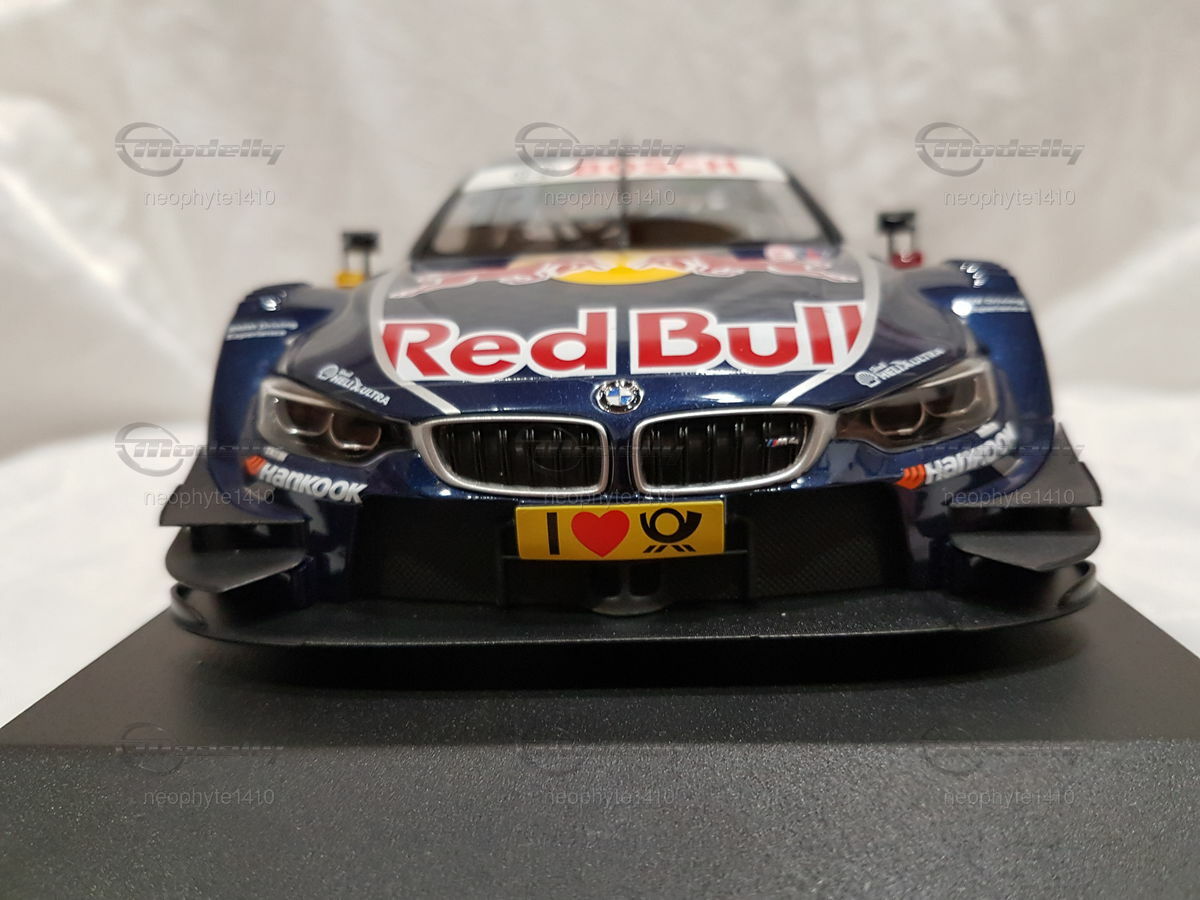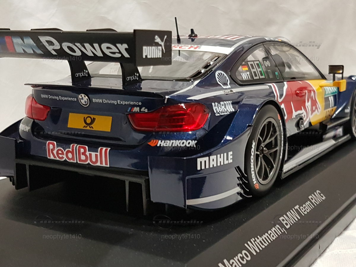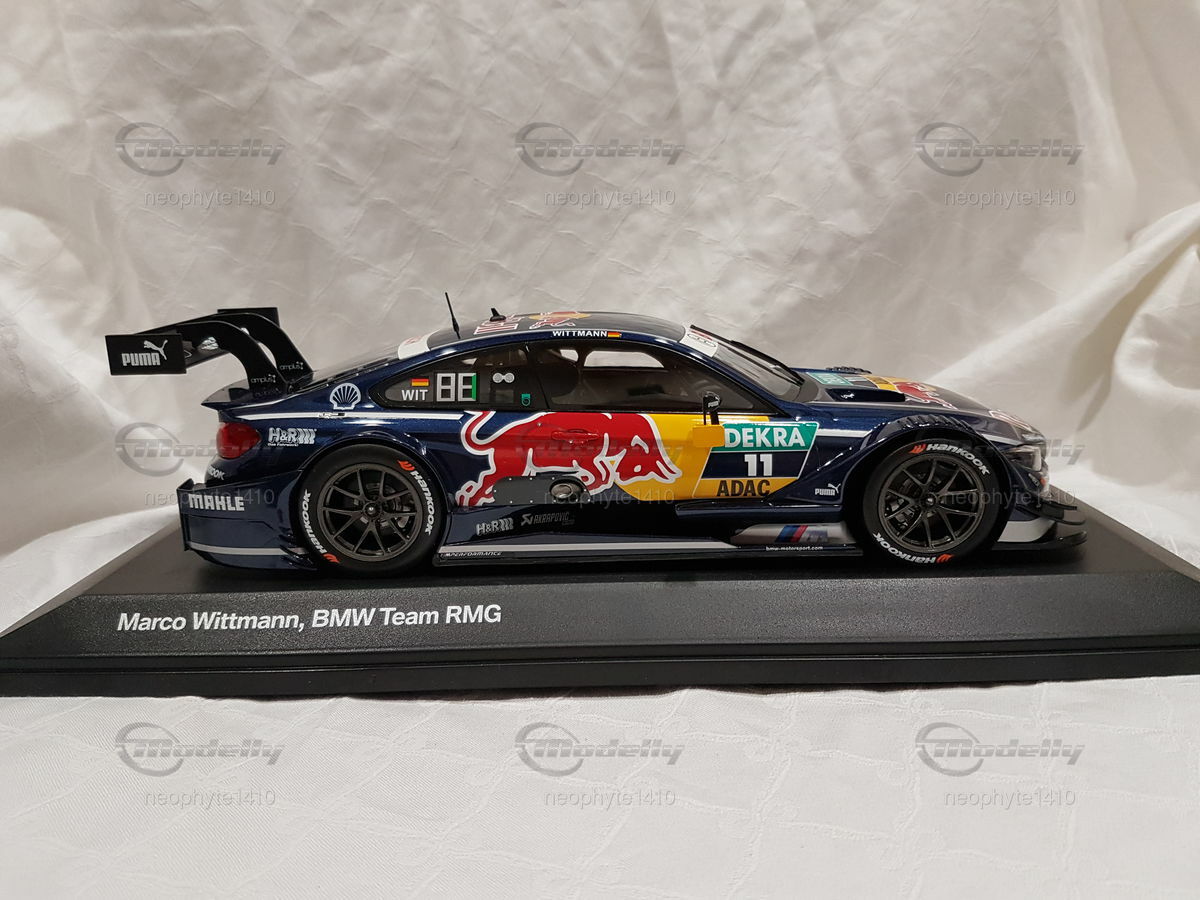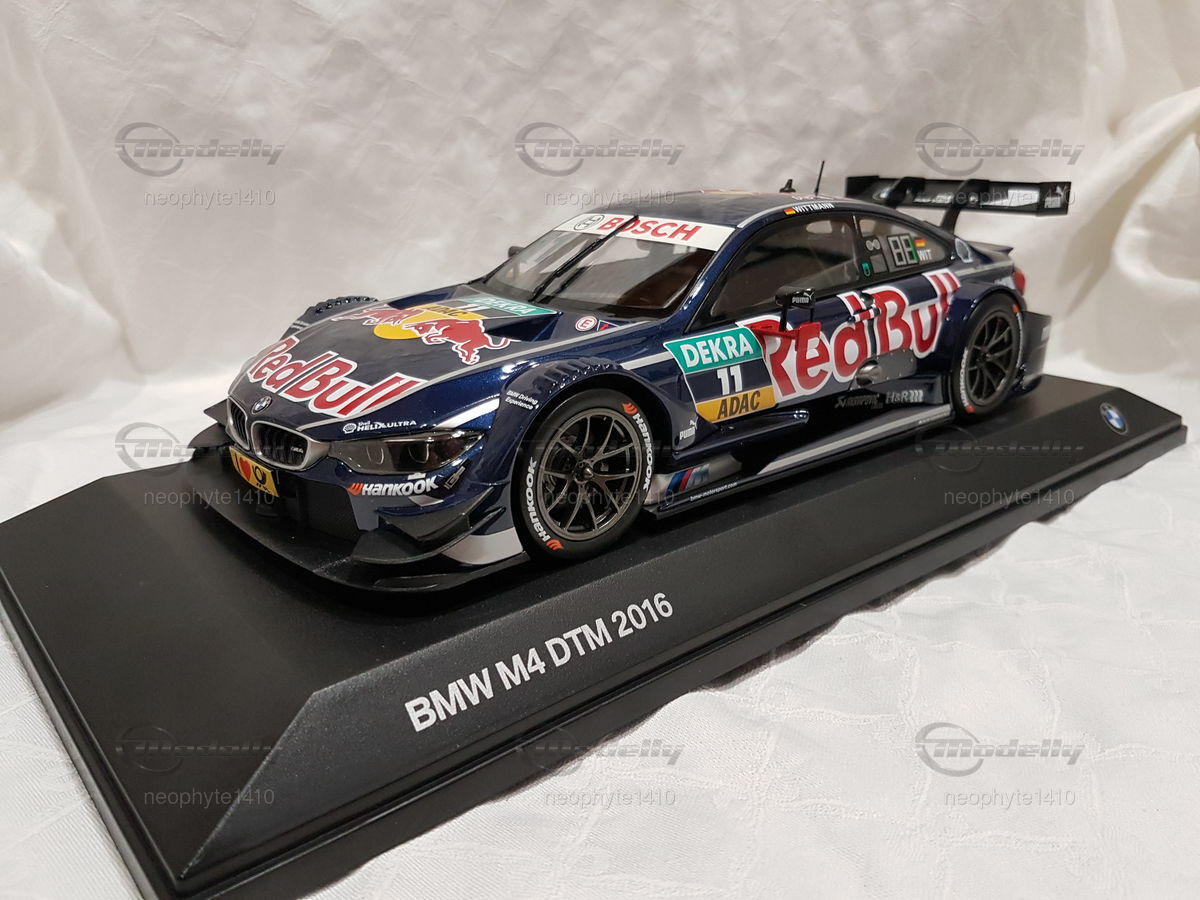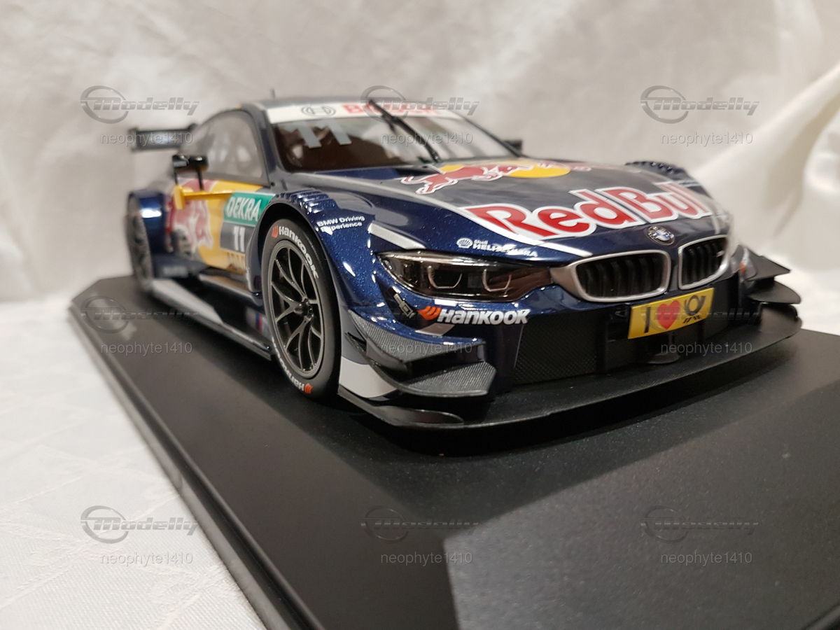 The model car in 1/18 scale, which you see in front of you, is based on the BMW M4 DTM from the year 2016. The original version of the vehicle comes from the F82 generation, which was built from 2014 to 2020. The DTM racing car from 2016 was driven by the BMW Team RMG and piloted by Marco Wittmann, who also secured the DTM championship title that year. The miniature is manufactured by Norev and is part of the collection of Modelly member "neophyte1410."
