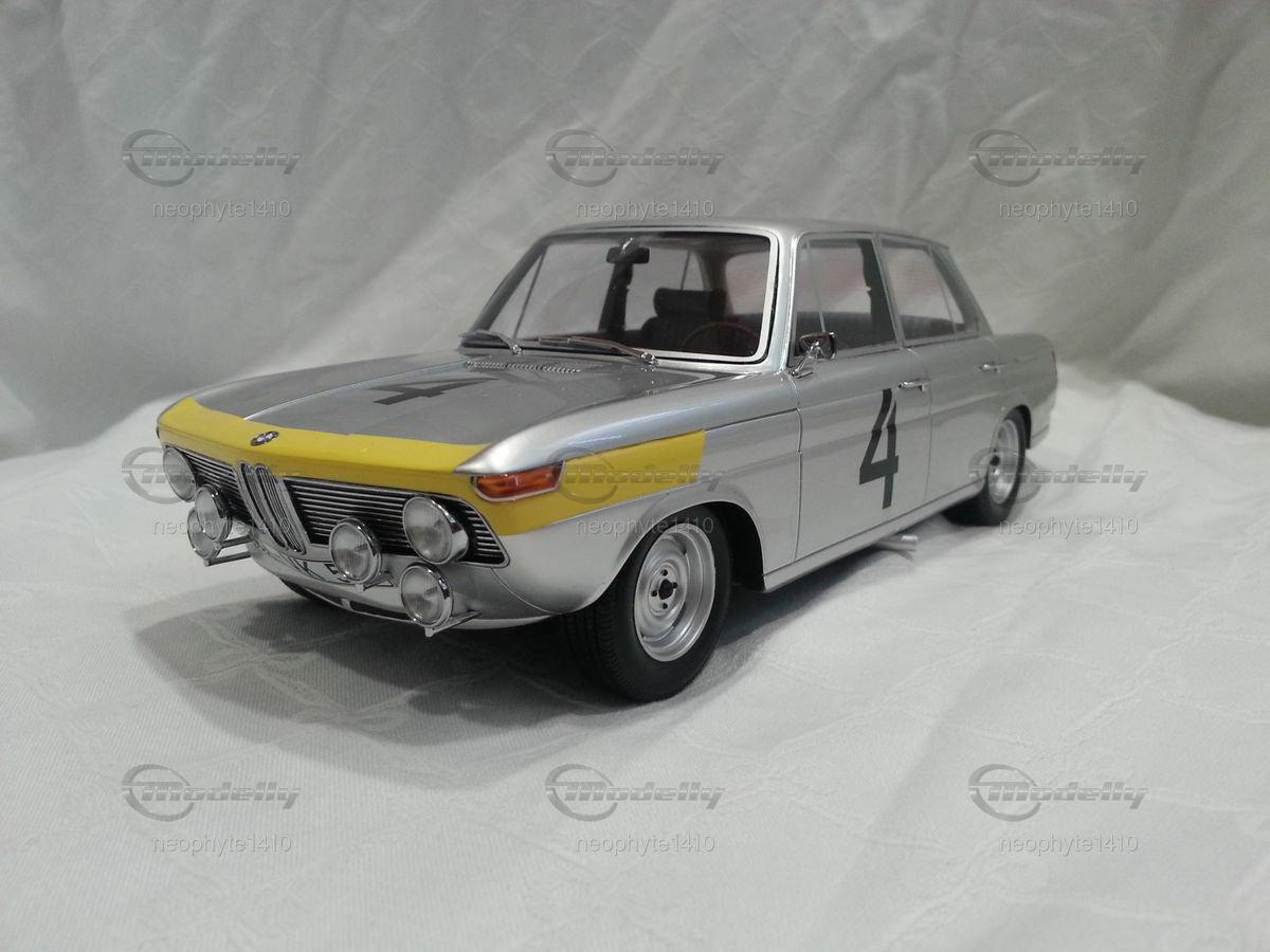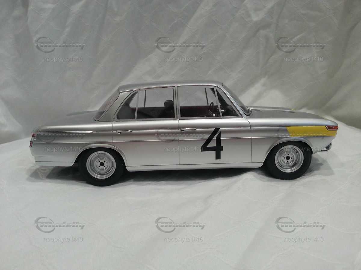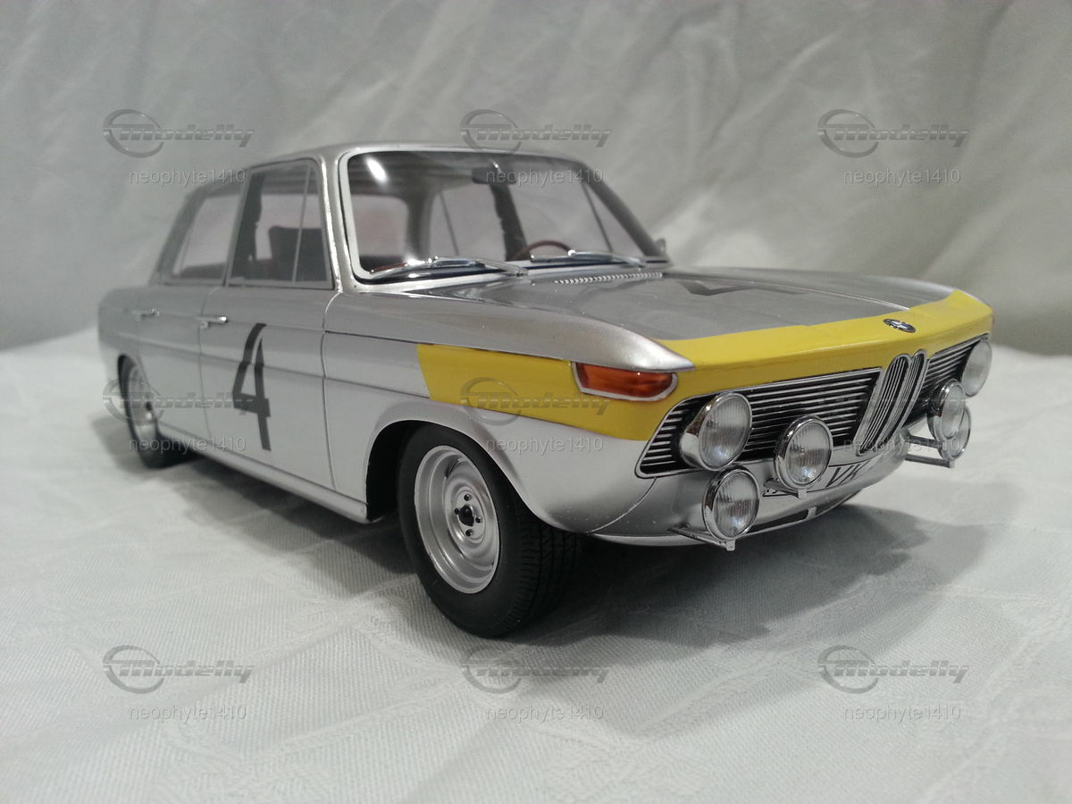 The design of the BMW 1800 TI was simple and functional yet elegant. The model featured in the photos from the collection of "neophyte1410" on Modelly showcases the typical livery of the Spa-Francorchamps 1965 winning car. The silver base color with yellow accents on the front fenders and hood stands out. This color scheme emphasizes the classic lines and aerodynamic shape of the car. Numerous sponsor logos, including prominent stickers from Castrol and Bosch, adorn the bodywork, adding realism to the model.