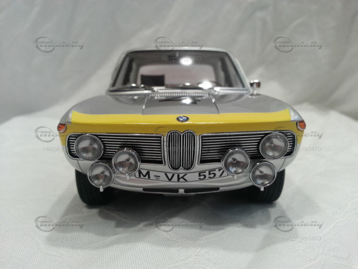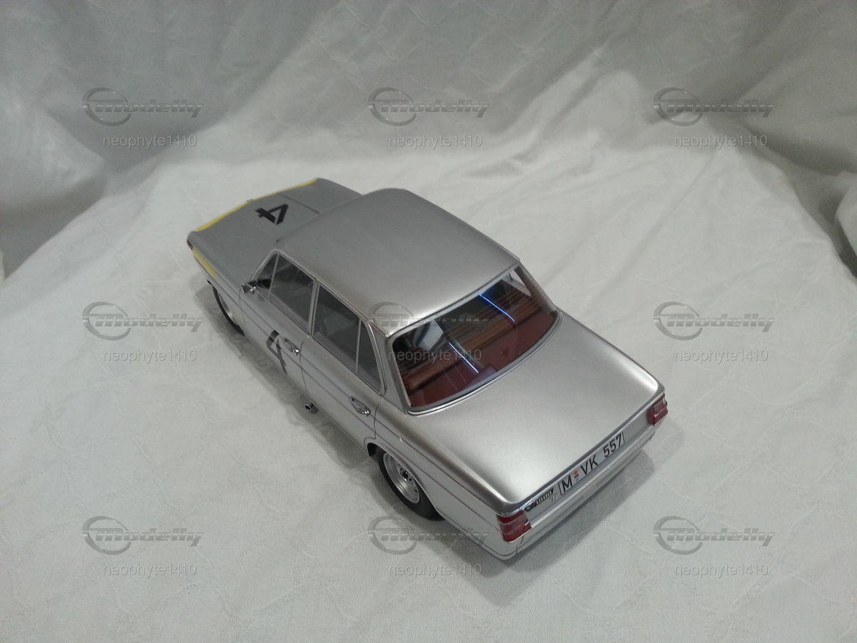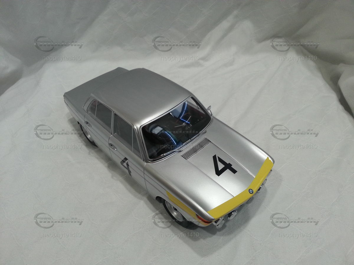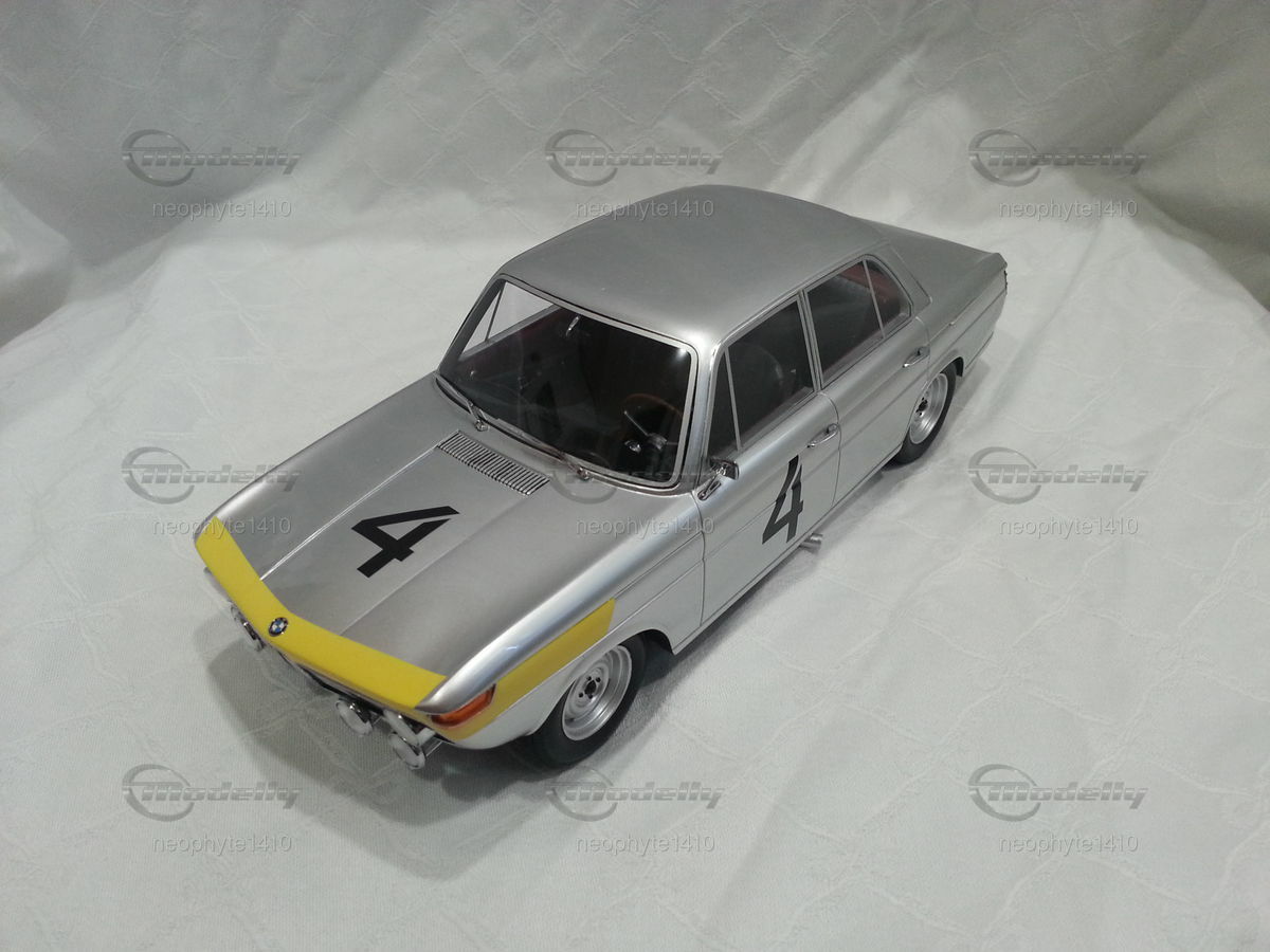 The design of the BMW 1800 TI was simple and functional yet elegant. The model featured in the photos from the collection of "neophyte1410" on Modelly showcases the typical livery of the Spa-Francorchamps 1965 winning car. The silver base color with yellow accents on the front fenders and hood stands out. This color scheme emphasizes the classic lines and aerodynamic shape of the car. Numerous sponsor logos, including prominent stickers from Castrol and Bosch, adorn the bodywork, adding realism to the model.