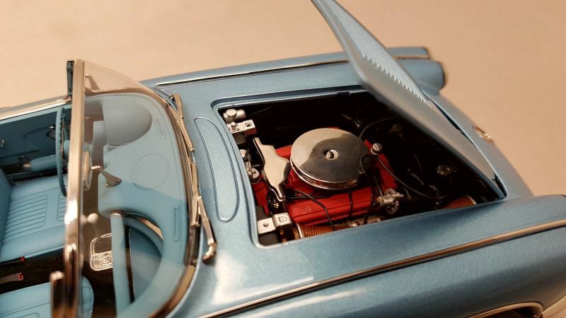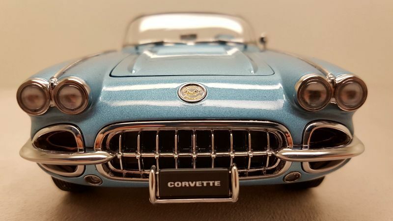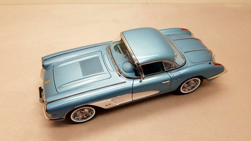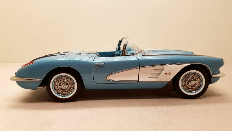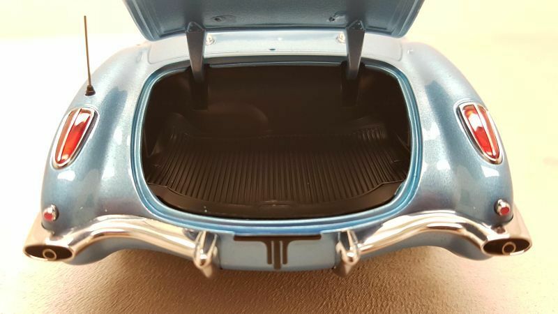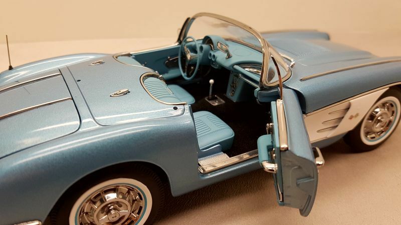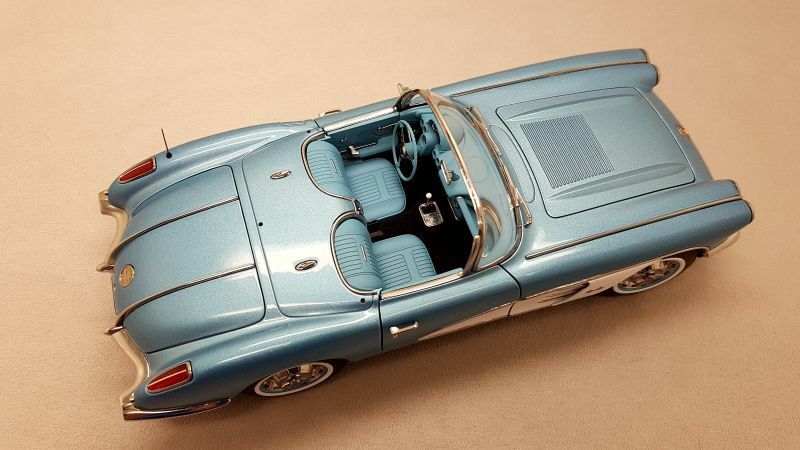 The model car presented here is a 1/18 scale replica, manufactured by AUTOart Millennium. The quality of this model car is remarkable as it is made from the durable diecast material, providing a realistic and sturdy representation. The model car is intricately detailed, showcasing the features of the original Corvette. The interior is faithfully reproduced, complete with authentic seats, an accurate dashboard, and a functioning steering wheel. The model belongs to the collection of Modelly member "Phat-T," giving the model car collection a special significance. The silver accents and light blue color scheme of the model are particularly striking, giving the car an elegant look.