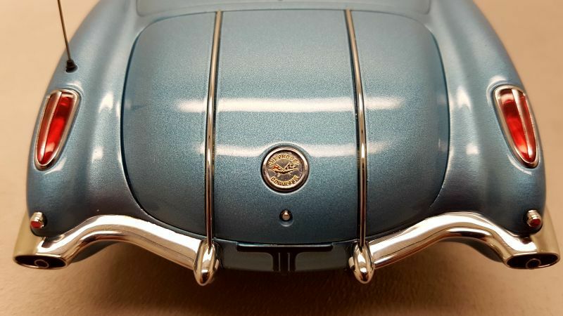 The model car captivates with its accurate color scheme and detailed reproduction of the shapes and lines of the Chevrolet Corvette C1. The white sidewall tires (if visible) and detailed chrome accents perfectly capture the elegance of the original. The painting in a light blue hue with white accents emphasizes the classic-sporty appearance. Particularly noteworthy are the delicate side mirrors and the attractively designed taillights. The AUTOart Millennium model in 1/18 scale is a gem for any collector and offers an unforgettable experience of model car collection with its attention to detail. In the presentation of the model, individual serial numbers and other small details can also be seen, making the collector's heart beat faster.