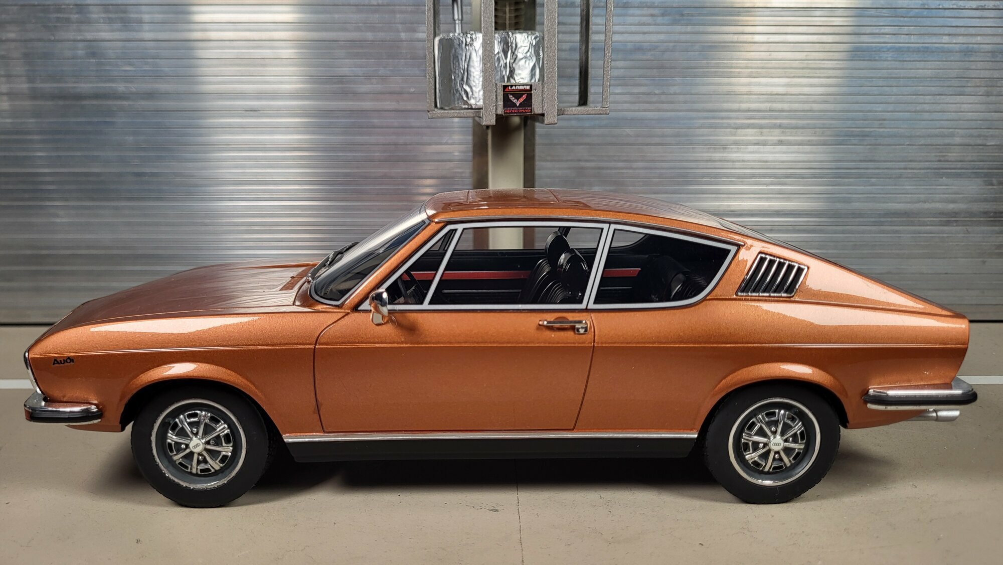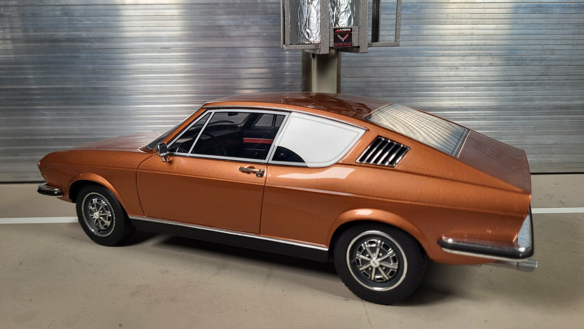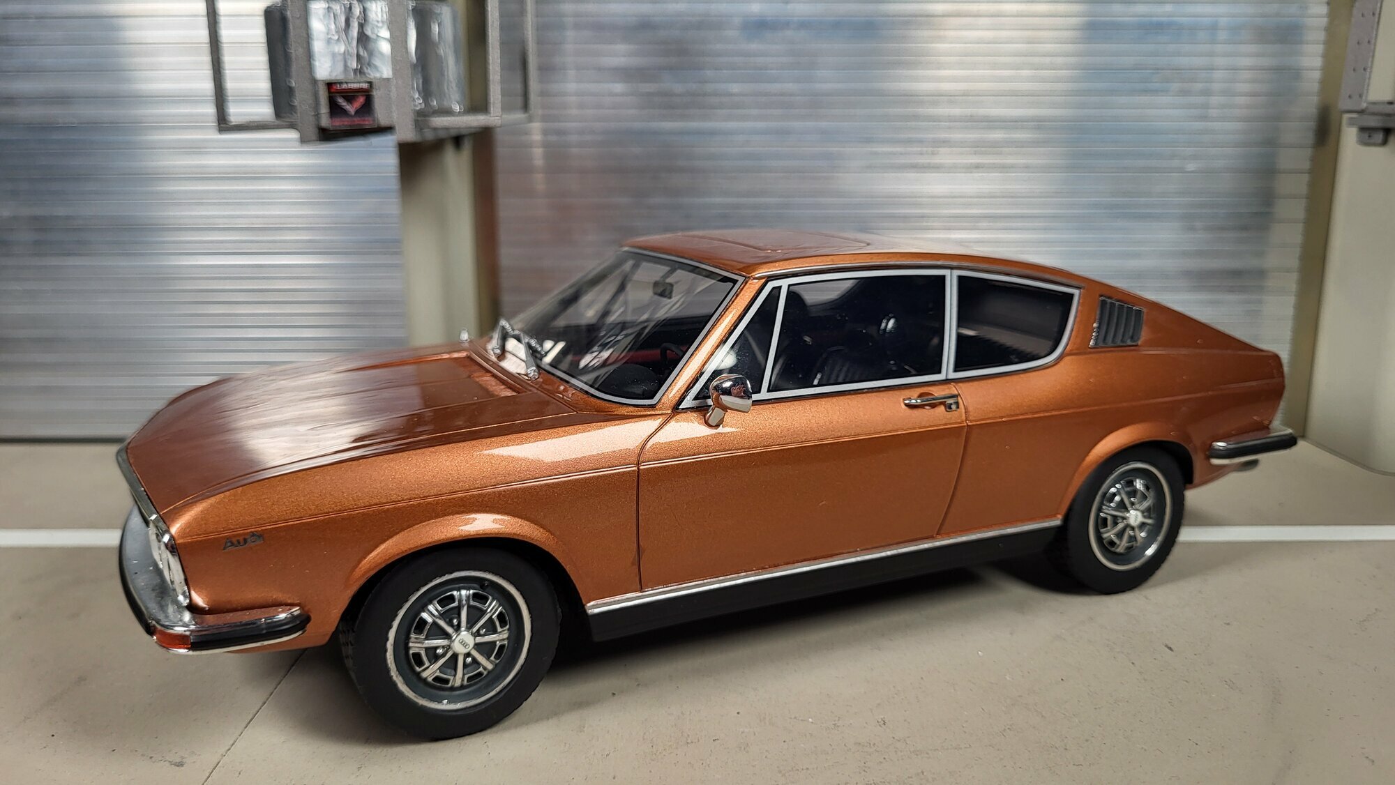 The model presented here is a 1/18 scale replica of the Audi 100 Coupé S, produced by BoS using high-quality resin material. This miniature is part of the collection of Modelly member "Phat-T" and impresses with its precise craftsmanship and accurate reproduction. The car is painted in an orange color, showcasing the striking lines and timeless elegant design of the original. Every detail, from the intricately crafted headlights to the faithfully replicated interior, matches the original. The paint finish exudes a warm, rich feel that accentuates the high-quality appearance. The sporty black-silver wheels complete the image of this elegant classic.