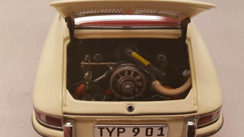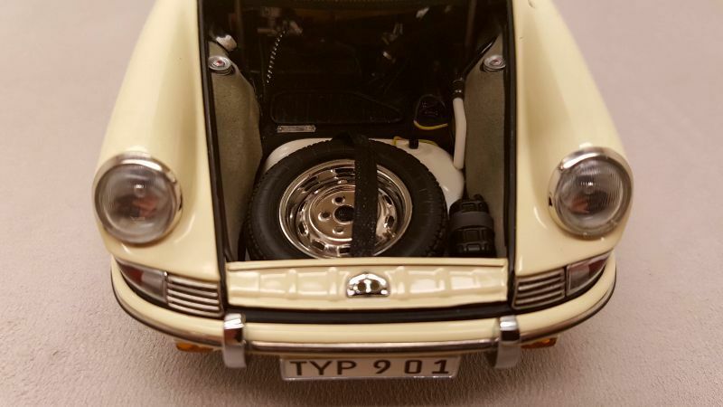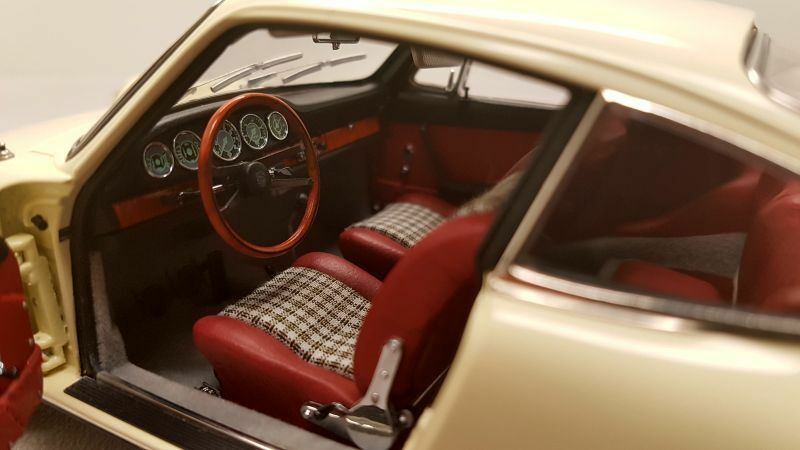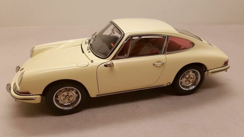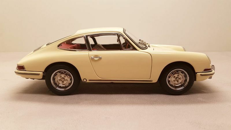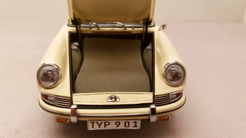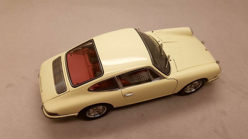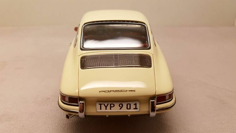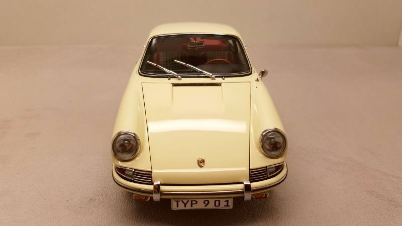 The model car shown here is a 1/18 scale replica of the Porsche 901, manufactured by CMC and made from high-quality die-cast material. CMC is renowned for its precision and attention to detail, which is evident in this miniature. When looking at the model car, the authentic paintwork stands out. The color is an elegant ivory that perfectly captures the charm and class of the original. The body shapes and lines are flawlessly replicated, making the model an attractive collectible.