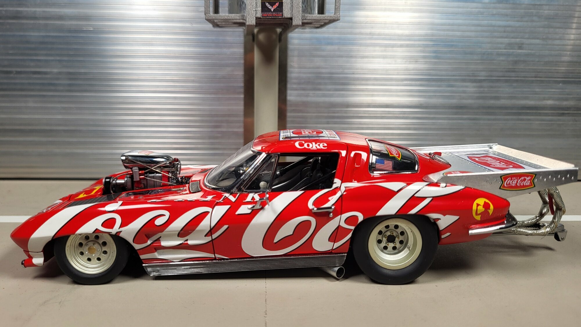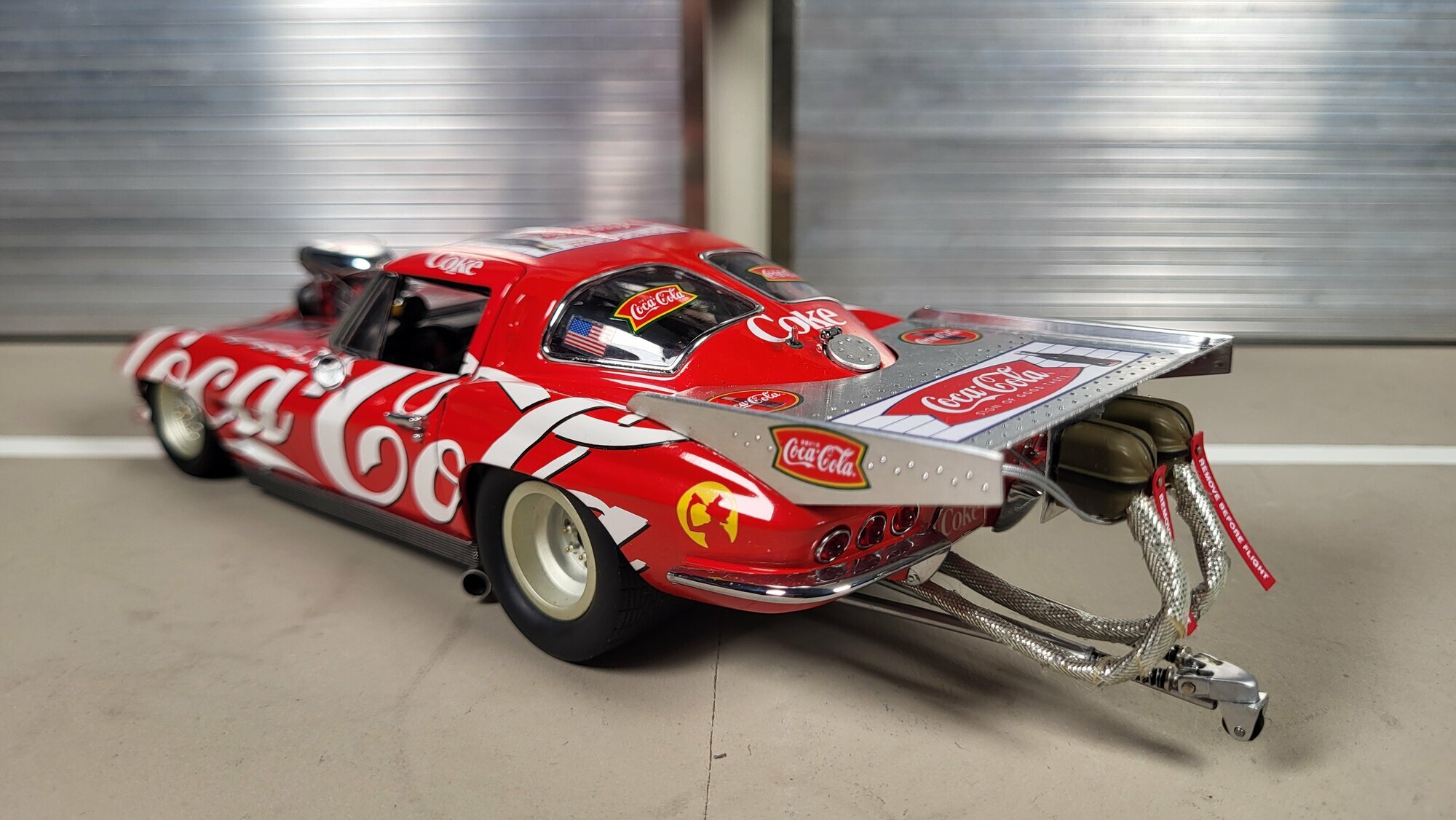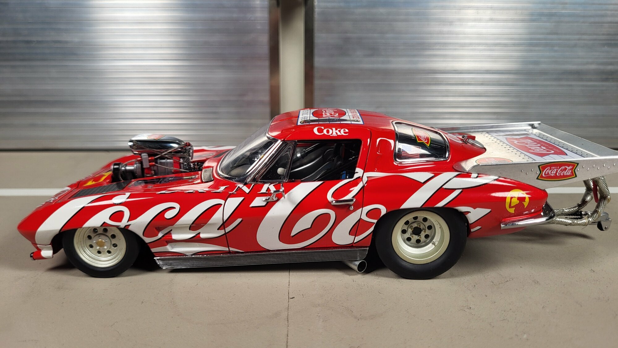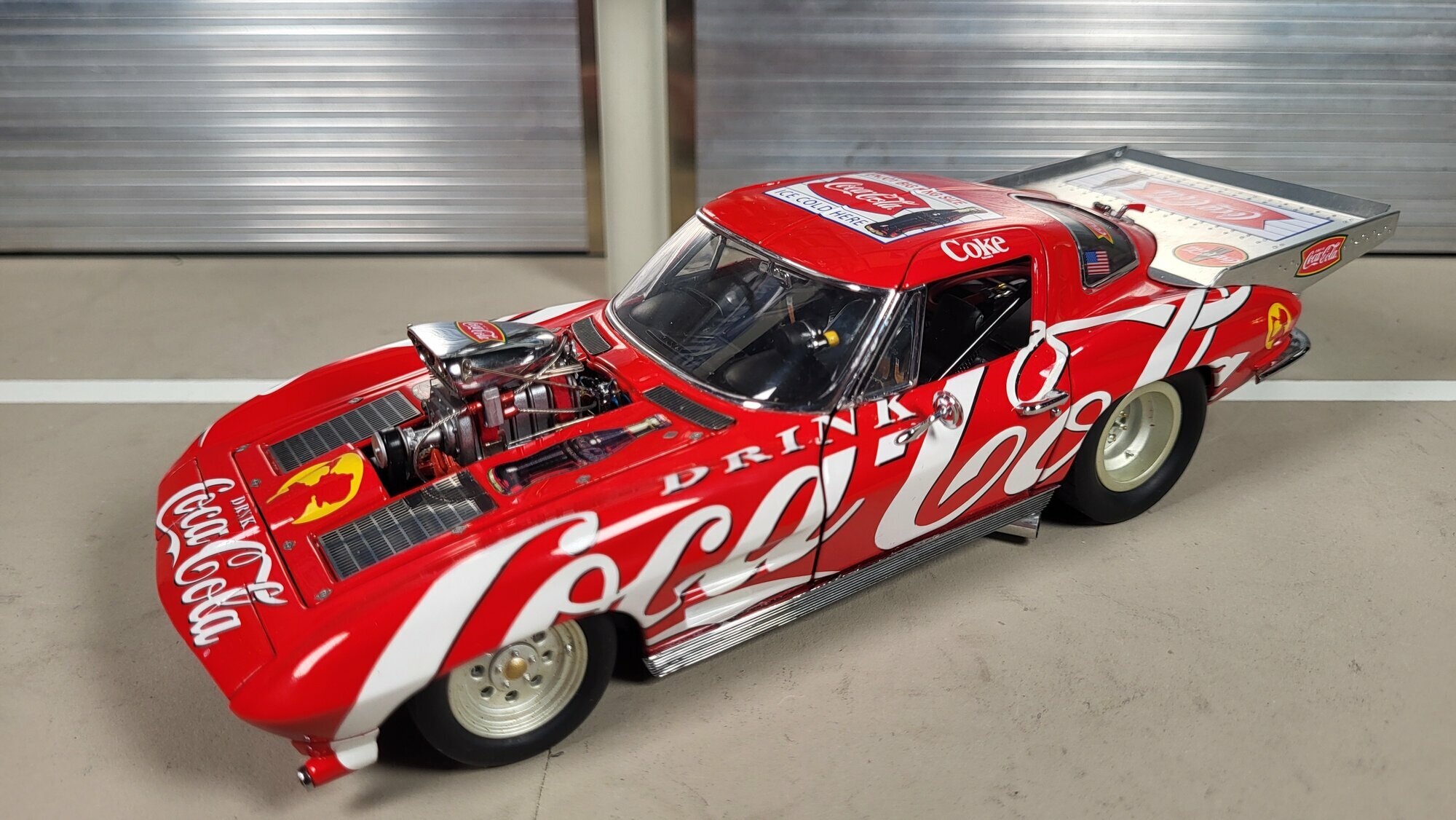 The model of the Chevrolet Corvette C2 Pro Mod Dragster in 1/24 scale, manufactured by Danbury Mint, is a precisely crafted collector's item. The miniature is made of high-quality diecast material and stands out for its detailed reproduction of technical components and authentic livery. In the photos provided by Modelly member "Phat-T", the careful painting and detailed representation are visible. The Coca-Cola logos adorning the bodywork and detailed sponsor logos such as Coca-Cola and Champion are particularly striking. This miniature is a perfect example of the craftsmanship in model building and a highlight of any collection.