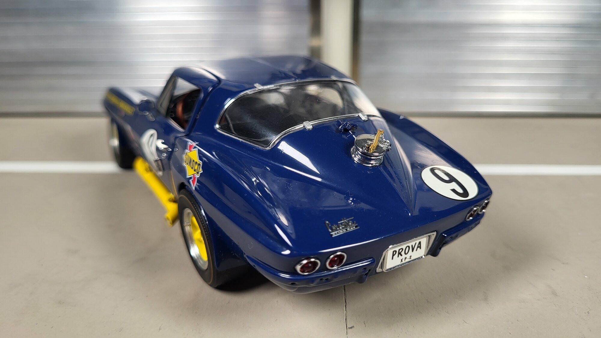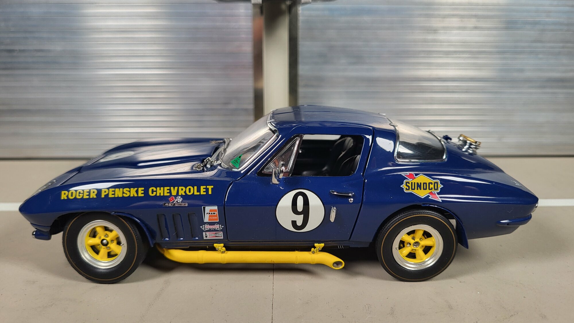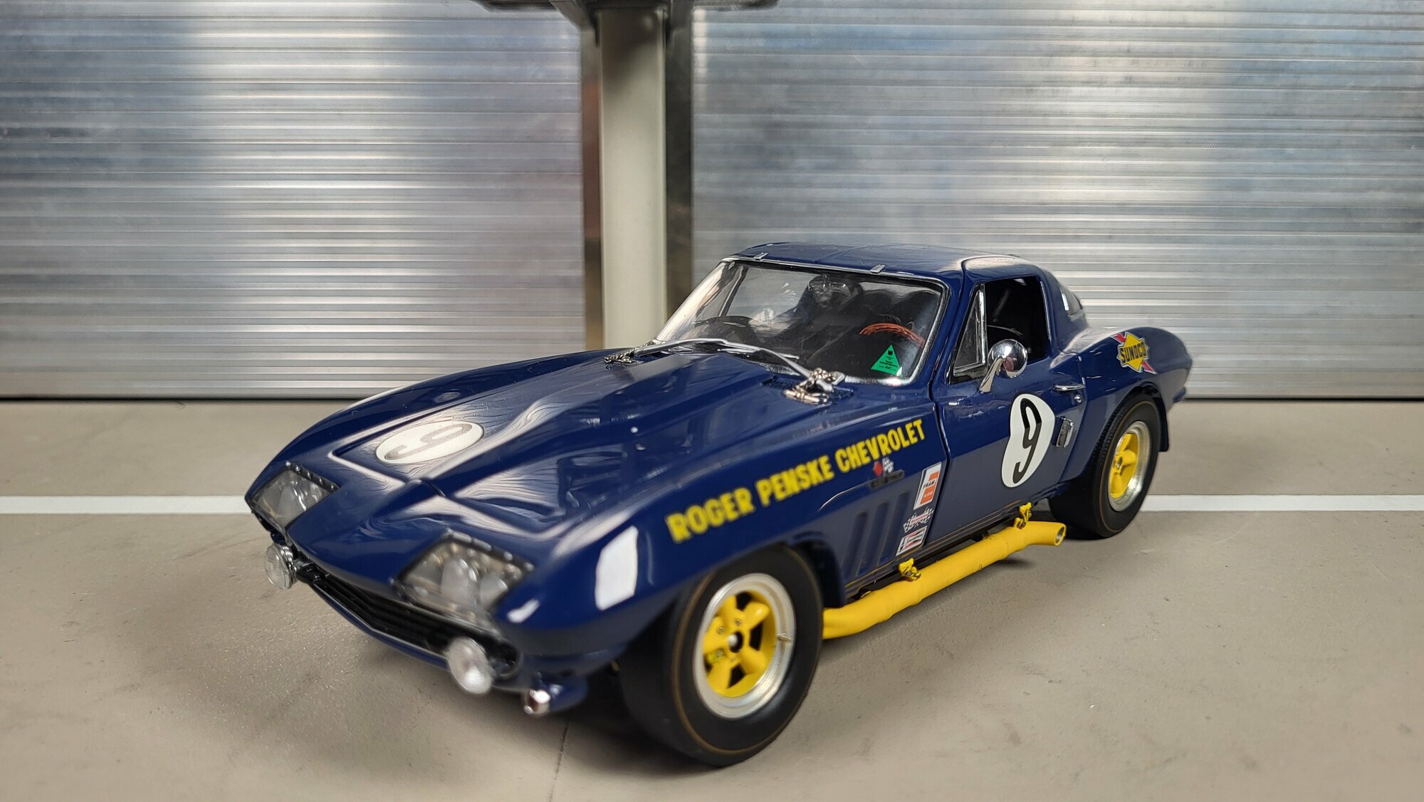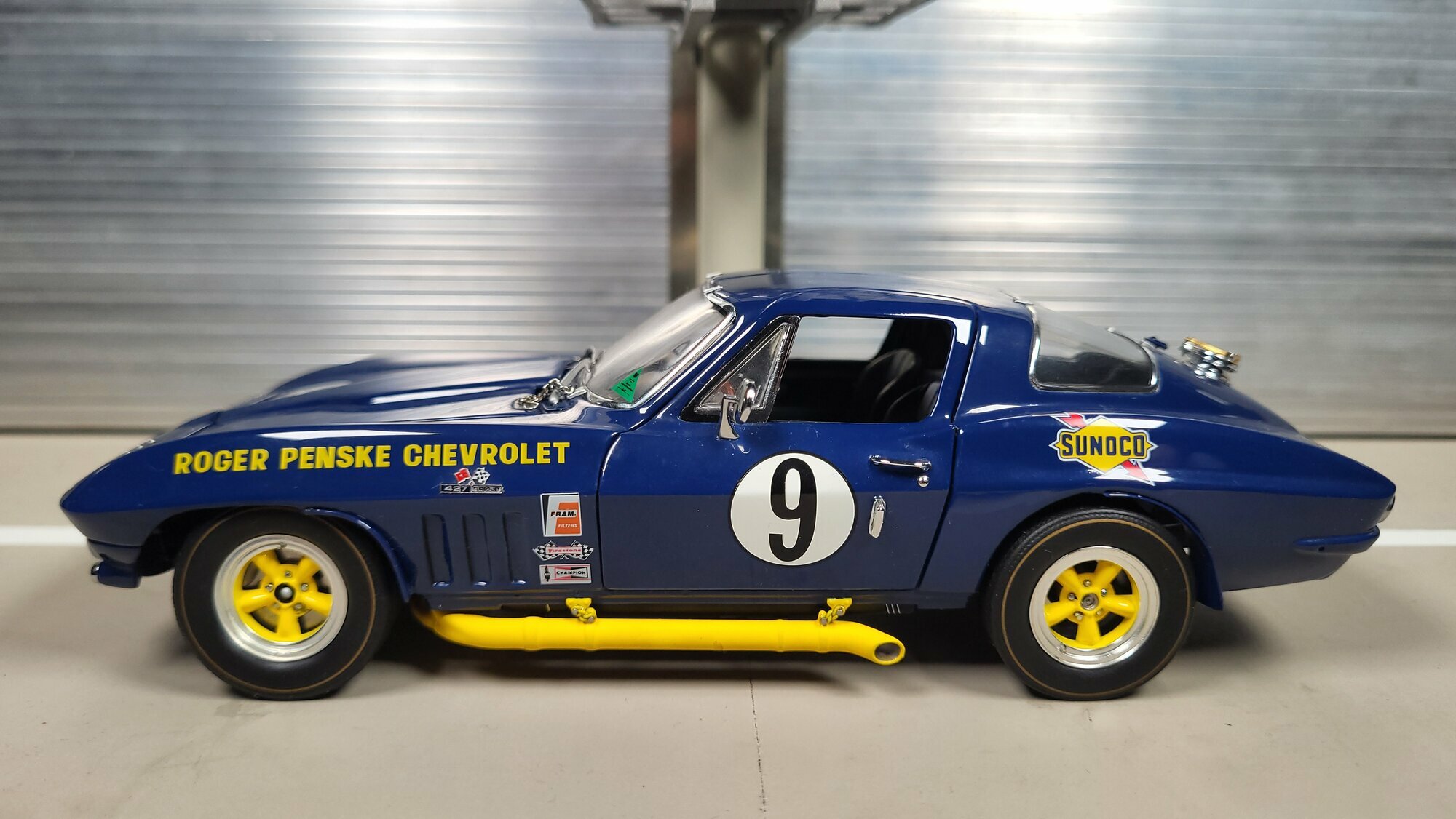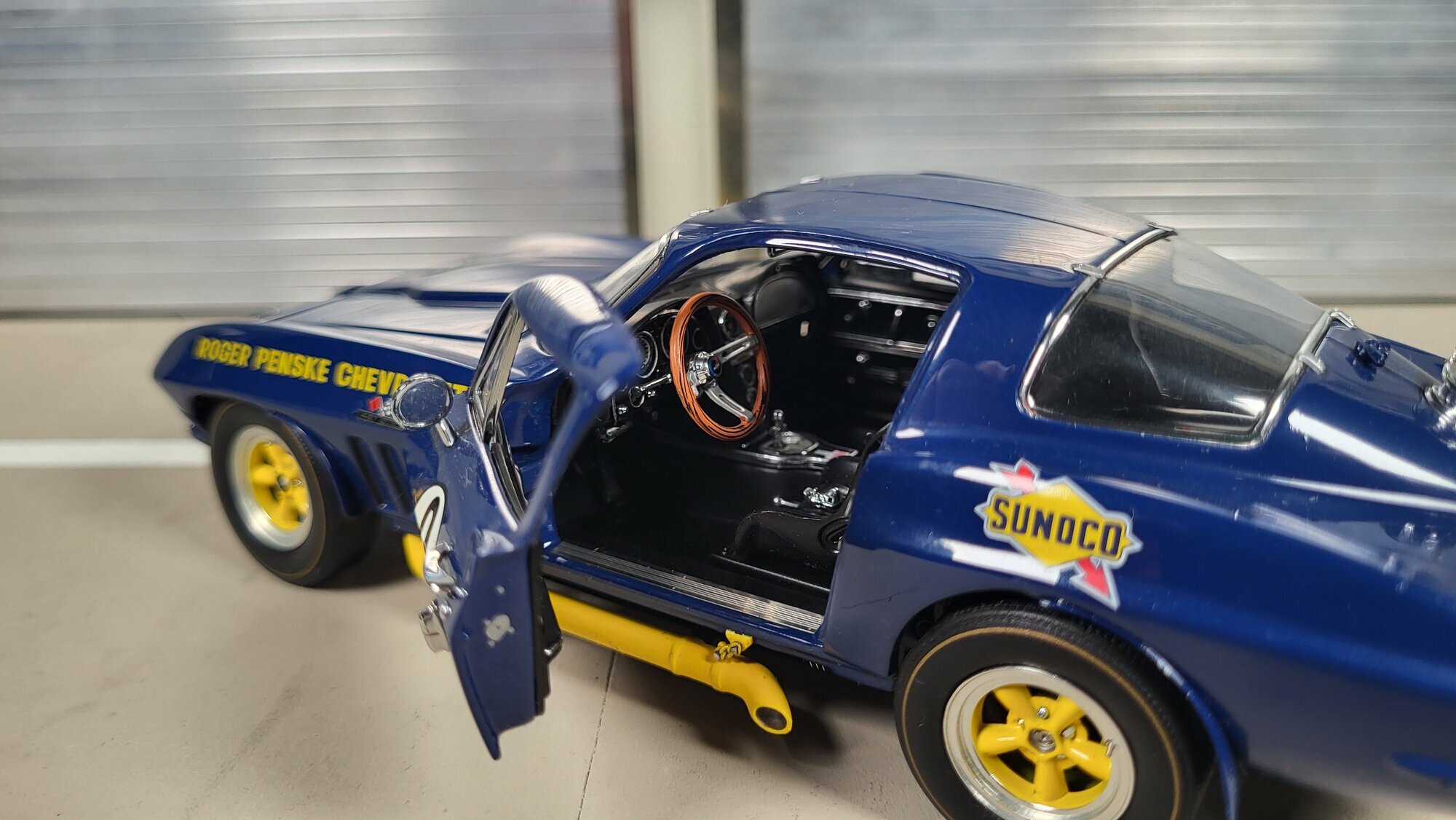 The model car is a remarkable example of detail accuracy and craftsmanship in 1/24 scale by Danbury Mint. Particularly notable are the sponsorship decals of Sunoco and Roger Penske Chevrolet, giving the vehicle an authentic racing look. The yellow accents on the wheels and side skirts complement the blue base coat, giving the model car a lively and dynamic appearance. The precise details of the interior, such as the steering wheel, instruments, and racing seats, are carefully replicated, reflecting the quality and care put into the production of this die-cast model. This miniature, part of the collection of Modelly member "Phat-T," offers collectors a valuable addition and a memento of the glorious era of the Chevrolet Corvette C2 Sting Ray in motorsports.