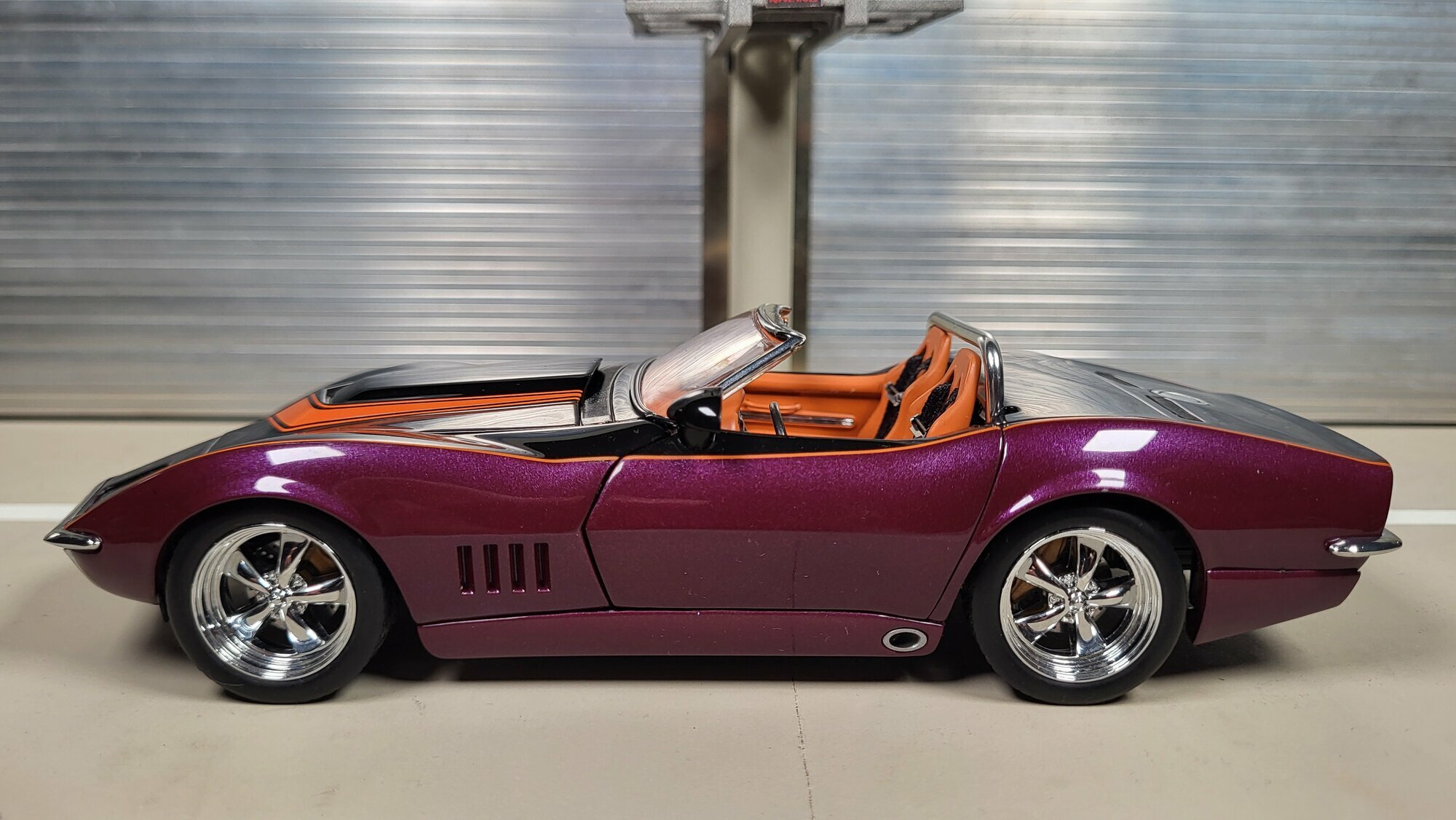 The scale model in the 1/24 format by Danbury Mint, found in the collection of Modelly member "Phat-T," is crafted from high-quality die-cast material. This miniature model captures the essence of the Chevrolet Corvette C3 Convertible Pro Touring perfectly. The striking black and purple two-tone paint scheme with orange accents gives the body a dynamic yet classic look. The model's wheels are clearly recognizable as works by American Racing, adding a sporty and standout design element.