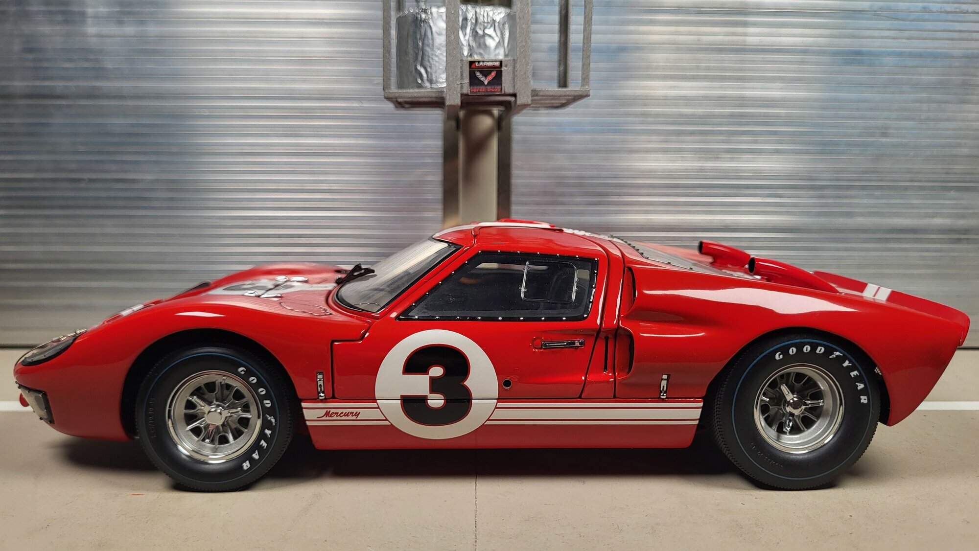 The Exoto pieces in the photos show the red paint with white twin stripes and the number “3” circle, a look you saw on several Holman‑Moody/Shelby cars. On the rocker panels you can spot the Mercury badge, a nod to Ford’s sibling brand. The tires have readable Goodyear markings. The front has inset headlight covers, hood pins and little screw heads along the window frames. Behind the cockpit you can see the intake snorkels and the engine cover with the fuel filler replicas. This model is a 1/18 scale Exoto Racing Legends diecast — metal body with fine plastic and photo‑etched parts — which gives a realistic look. In Phat‑T’s collection the miniature reads true thanks to correct proportions, clean number printing and faithfully rendered Halibrand wheels. Doors and hood seams are even, the interior shows a suggested dash, belts and the low driving seat. If you look closely at the photos you’ll spot the sliding side window, the typical NACA ducts on the nose and the single central wiper — little details that read exactly like the Ford GT40 Mk II and that show the quality of Exoto Racing Legends in the 1/18 segment.