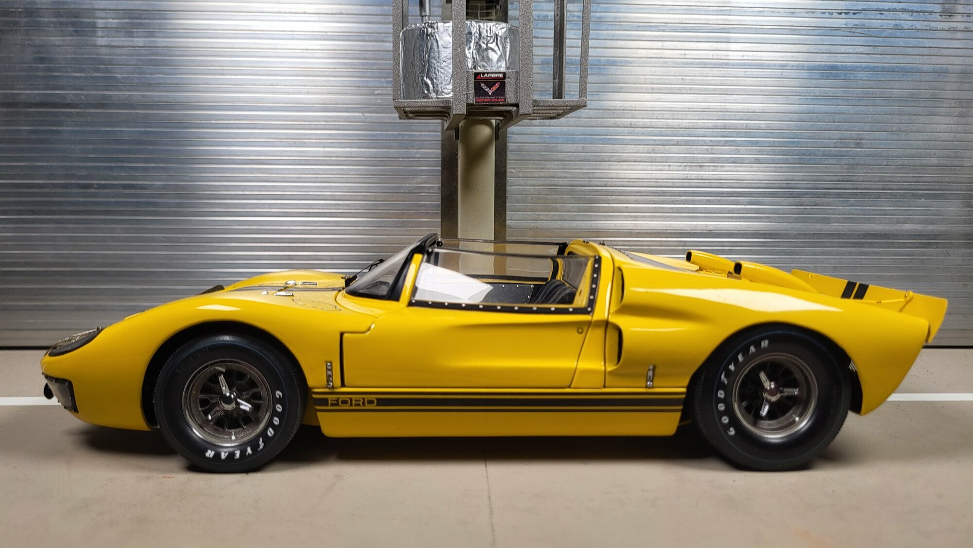 The 1/18 scale model from Exoto Racing Legends uses a yellow base coat with two black center stripes over the nose and subtle black trim stripes on the rear wing. The side shows the black double line with the “FORD” lettering; this understated look matches the test/experimental character of the real car. The open bodyline is obvious on the model: flat chassis, deep seating tub and the characteristic cutouts in the doors. You can clearly see the riveted edges around the windscreen and door tops, the fine hood hinges and the round hood fasteners. The Halibrand wheels carry white Goodyear lettering on the tires; this sample doesn’t show many sponsor decals, reinforcing the test‑car feel. With the front and rear hoods opened you can see the radiators, brake lines and the V8 with its tightly packed headers. Inside there are perforated seat surfaces, harnesses and a functional‑looking dash. The accurate open‑top silhouette, the small rear vents and the tight panel gaps show this is a diecast model with working panels. This piece is part of collector “Phat‑T”’s collection and gives enthusiasts a compact, well‑executed look at the form, tech and appearance of the unique Ford GT40 Mk II X‑1 Roadster.
