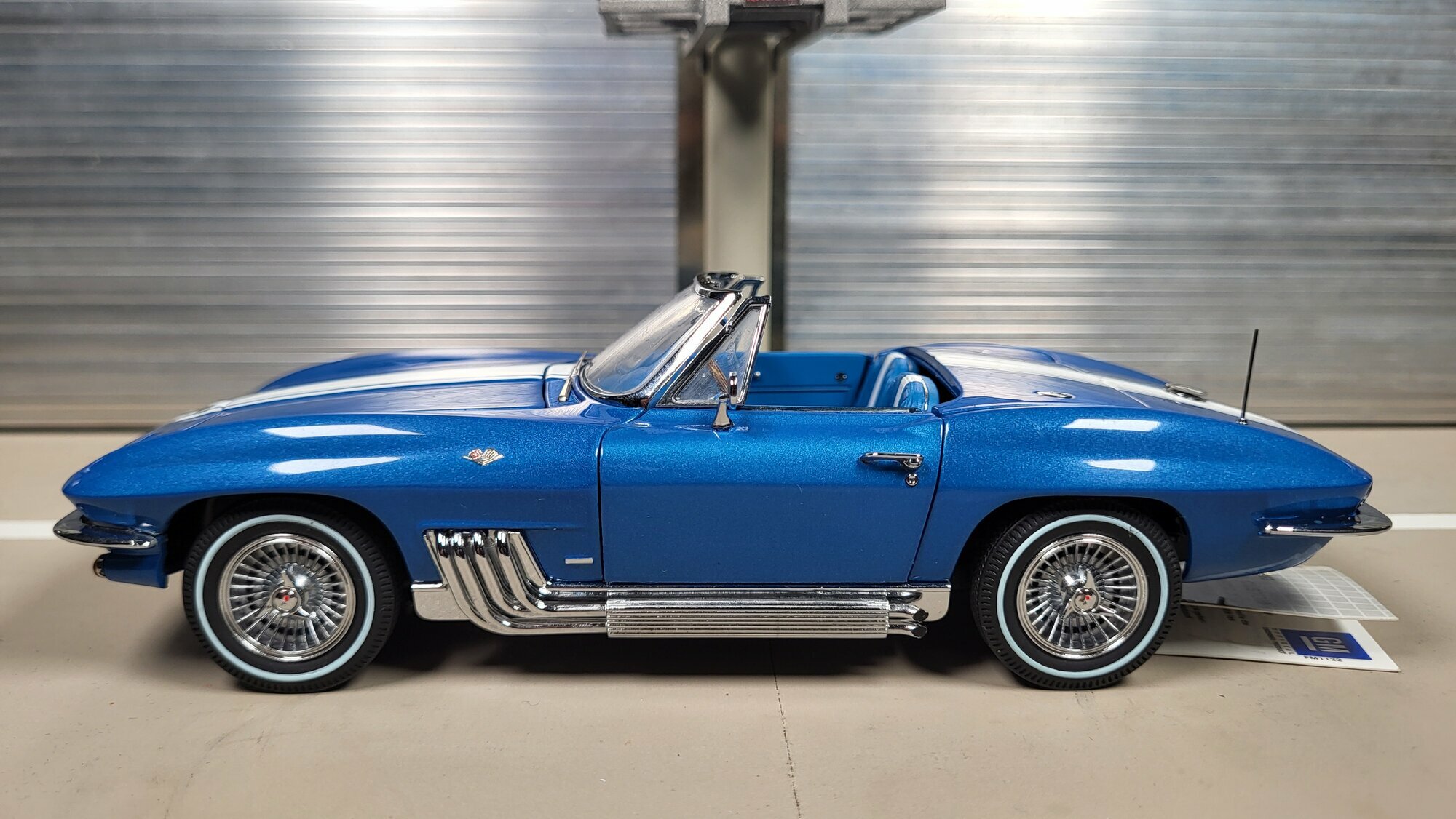 The model car shown here is a detailed replica of the original Chevrolet Corvette C2 Convertible from 1963. This miniature car was crafted by Franklin Mint in a 1/24 scale mainly consisting of plastic material. Special attention was given to faithfully reproduce various design elements such as the white racing stripes extending from the hood to the rear and the striking blue of the body. This model is part of the collection of model enthusiast "Phat-T" on Modelly. The intricate work put into replicating the engine and exhaust system can be seen in the photos. Even the smallest details like the door handles, mirrors, and interior are perfectly replicated.