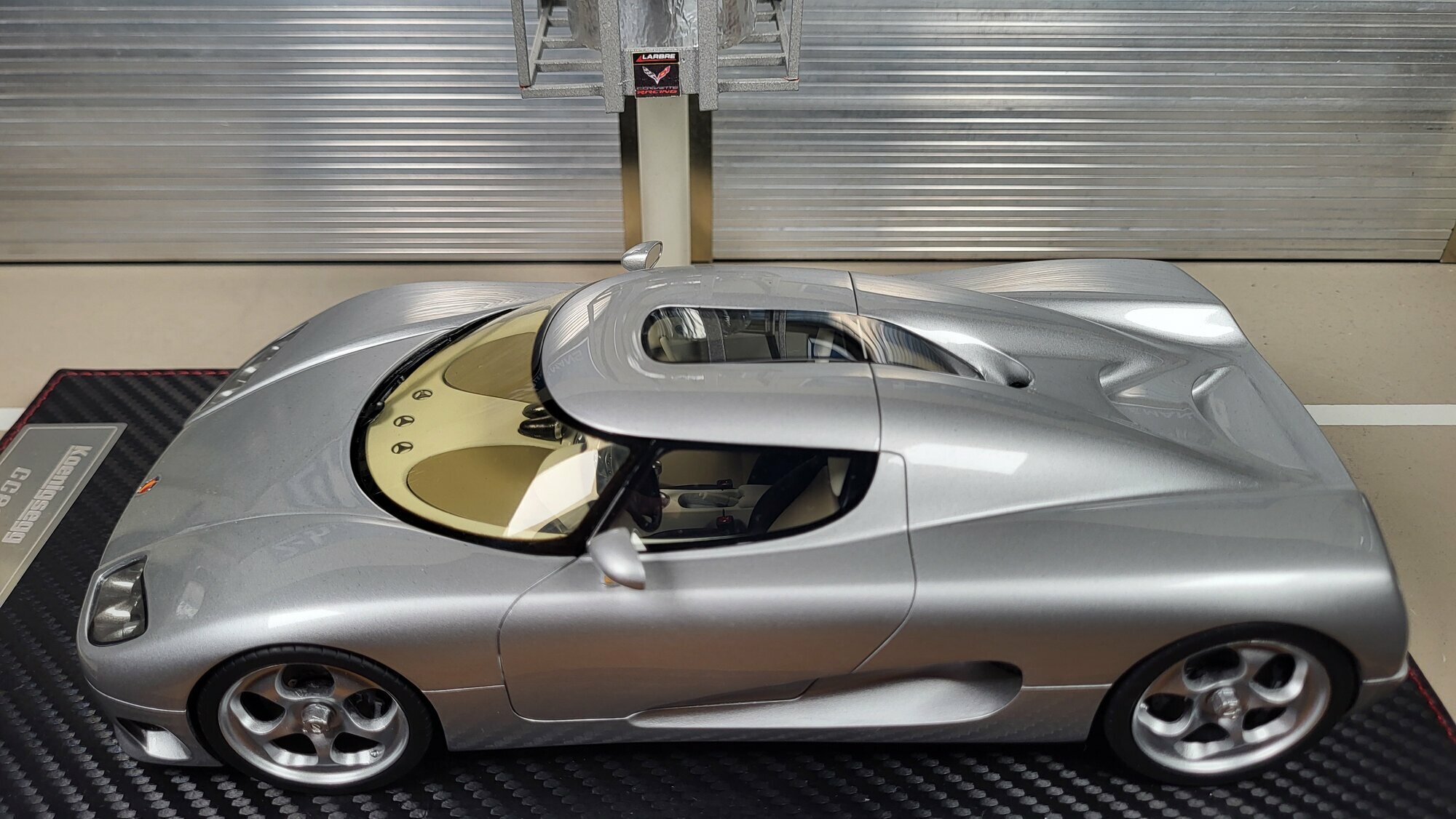 The model car shown here in 1/18 scale was crafted by FrontiArt and is made of durable resin material. It faithfully represents the Koenigsegg CC8S, as can be seen from the provided photos. The model showcases the distinctive lines and aerodynamic shapes of the original, including the characteristic gullwing doors and unique rear design. The carbon fiber structure of the base plate on which the model sits underscores the high-quality materials and attention to detail employed in creating this model. With its silver paint finish and true-to-life details, this model is a standout for any collector and a valuable piece in the collection of Modelly member "Phat-T".