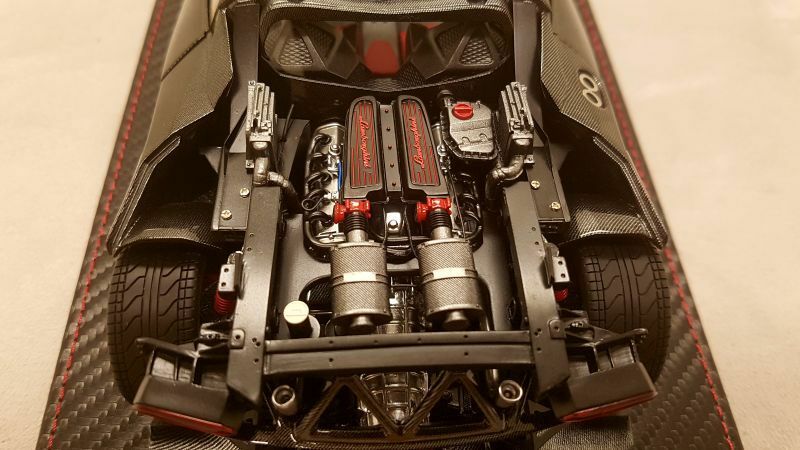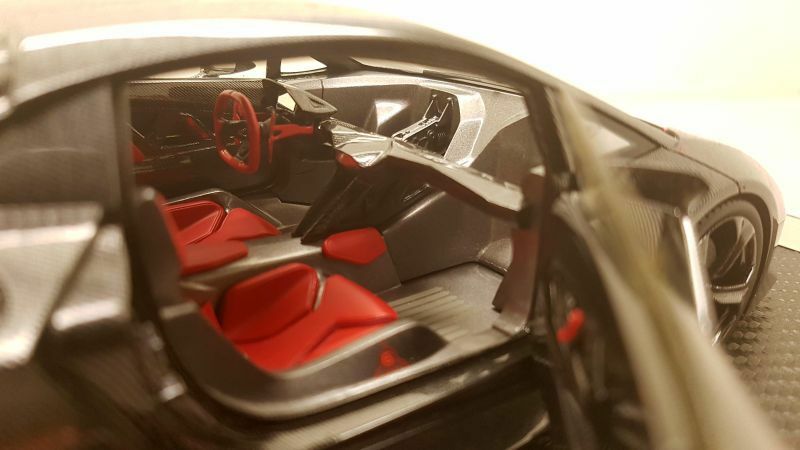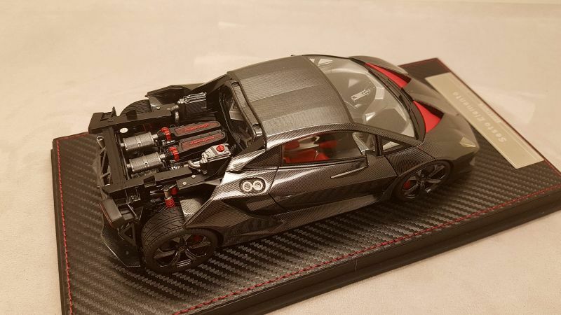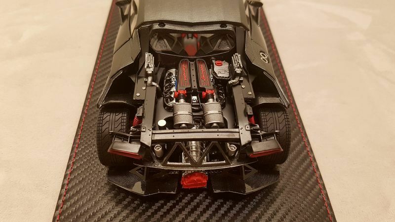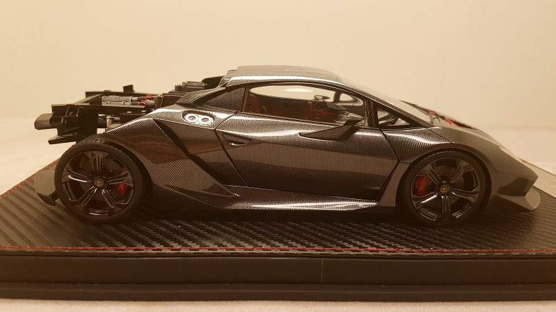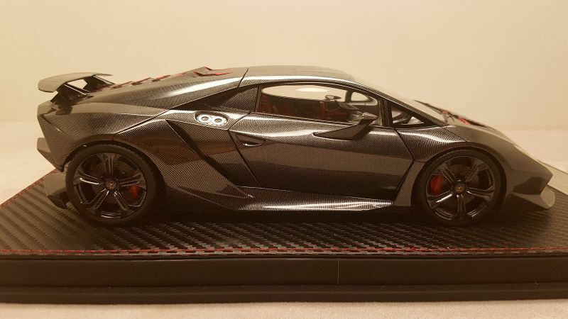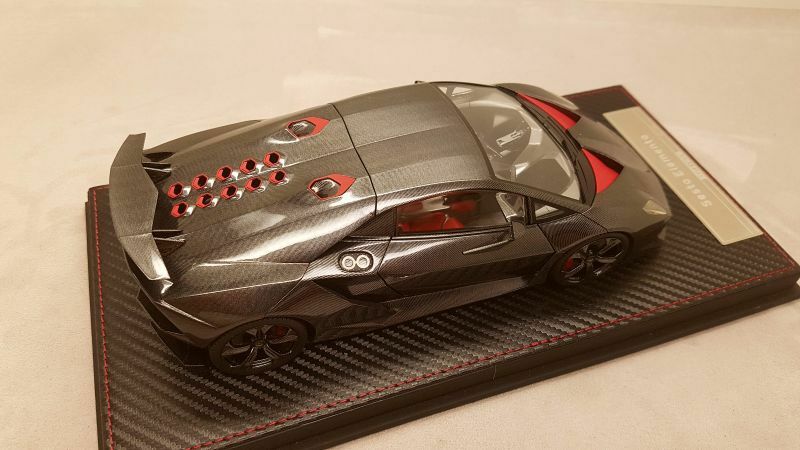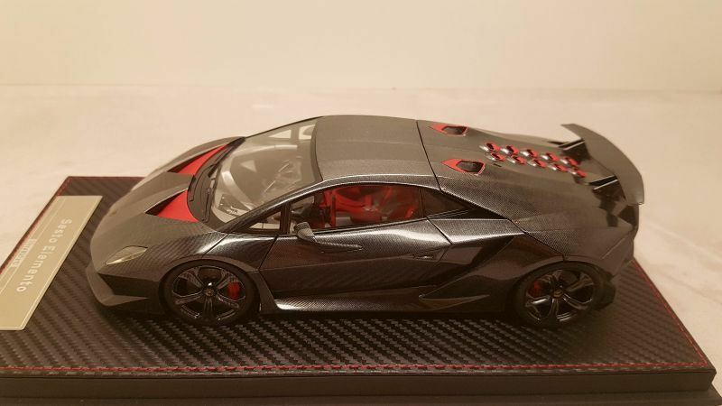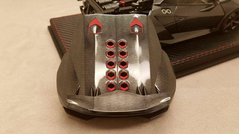 The 1/18 scale model replica of the Lamborghini Sesto Elemento by FrontiArt is an intricately detailed collector's item, featured in the collection of Modelly member "Phat-T." Crafted from durable resin, the model showcases exceptional attention to detail. The paint job perfectly reflects the carbon fiber structure of the original, including the red accents on the air intakes and wheels. The model also features the distinctive ventilation holes on the hood and the stylized rear wing. The interior is equally faithfully replicated, with red seats and a variety of console details matching the real vehicle. Every detail, from the headlights to the taillights, is expertly reproduced, making this model a particularly valuable piece for collectors.