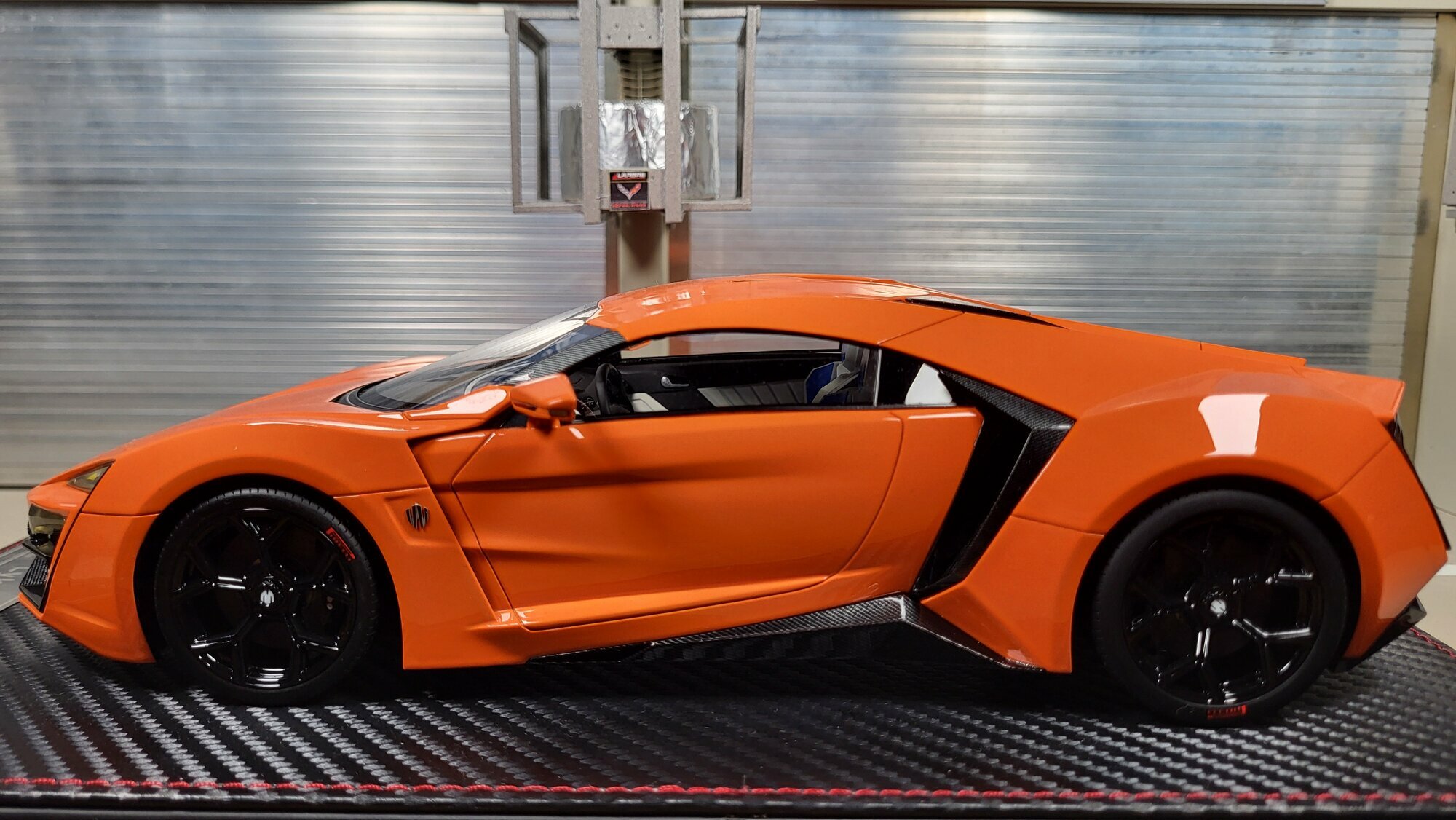 The mini car showcased by Modelly member "Phat-T" is a 1/18 replica of the awesome Lykan HyperSport. Crafted by FrontiArt, this model displays a remarkable attention to details, all molded from resin. It's mounted on a presentation base with a structural carbon fiber look. The precise recreation of the vehicle in 1/18 scale highlights all the charms of the original: from the sharp lines to the sleek black rims. This detailed miniature ensures that every feature of the original is faithfully replicated in a compact form.