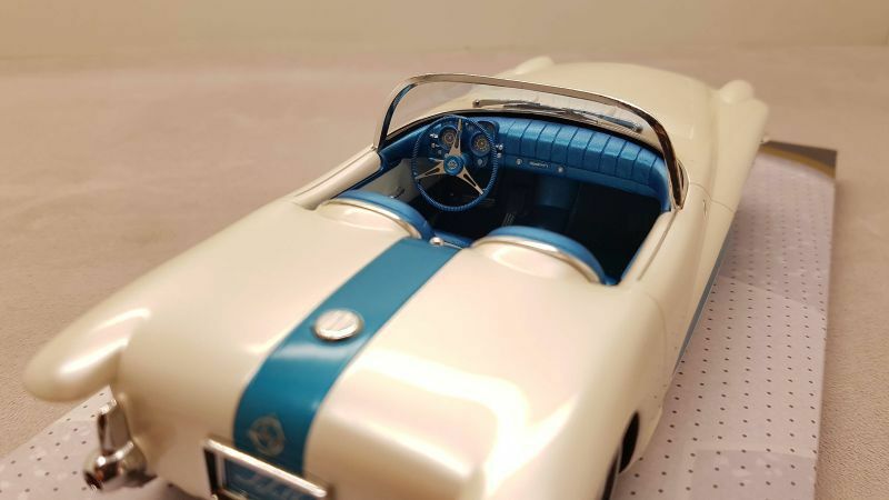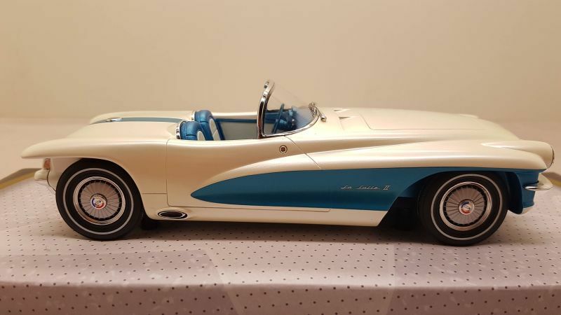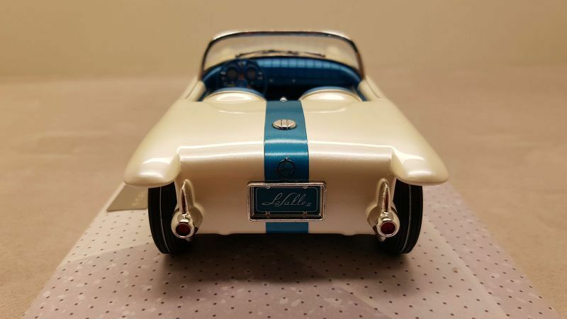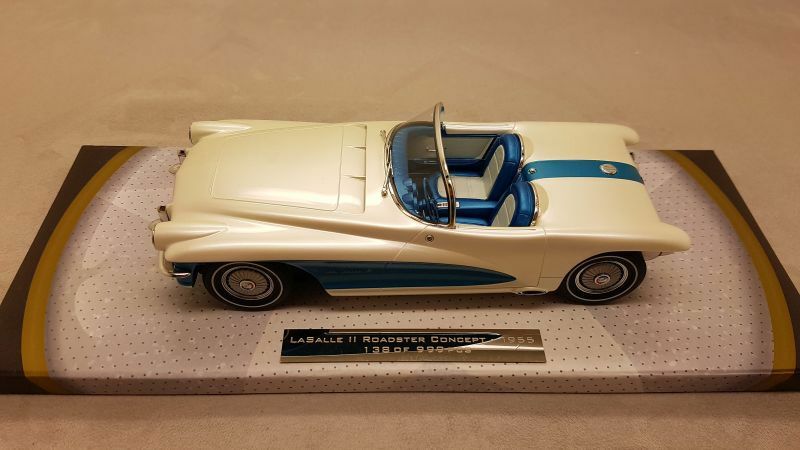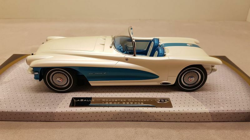 The model car is presented in a combination of pearl white and turquoise accents, replicating the iconic design of the LaSalle II Roadster Concept. The side panels and interior stand out with the turquoise tones, the contours are curved and elegant, just like the legendary original. Special details like the authentic chrome trimmings and carefully crafted rearview mirrors perfectly showcase the high level of craftsmanship in production. The striking dashboard and seats in turquoise create a harmonious interior design that rivals the original. The model prominently displays the "LaSalle" lettering on the sides and the unmistakable badge on the hood.