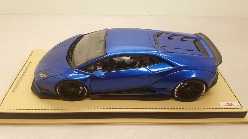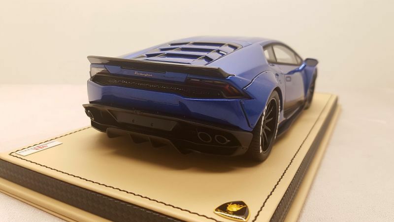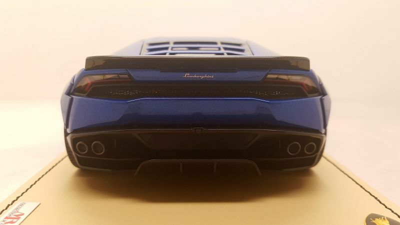 The 1/18 scale model by MR Collection is a perfect representation of the real Lamborghini Huracán, made from resin. The blue paint of the model shines in metallic finish and enhances the car's dynamic lines. The standout black rear spoiler further emphasizes the sporty nature of the Huracán. The model's wheels are replicas of the Pirelli P-Zero rims, adorned with the P-Zero logo on the sides, giving the miniature vehicle an authentic look. Through its detailing and craftsmanship, this model demonstrates why MR Collection is highly regarded among collectors.