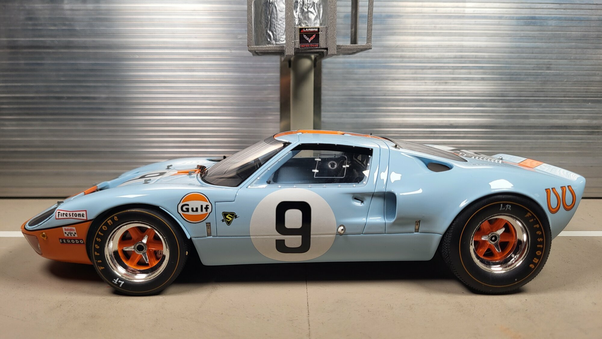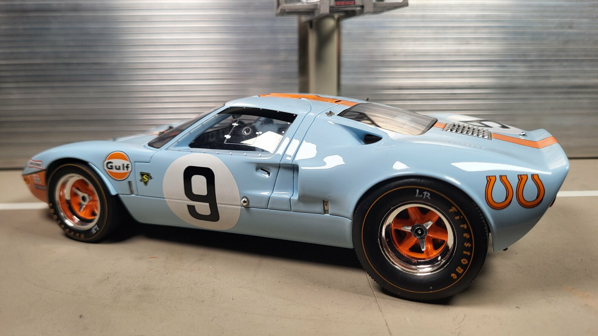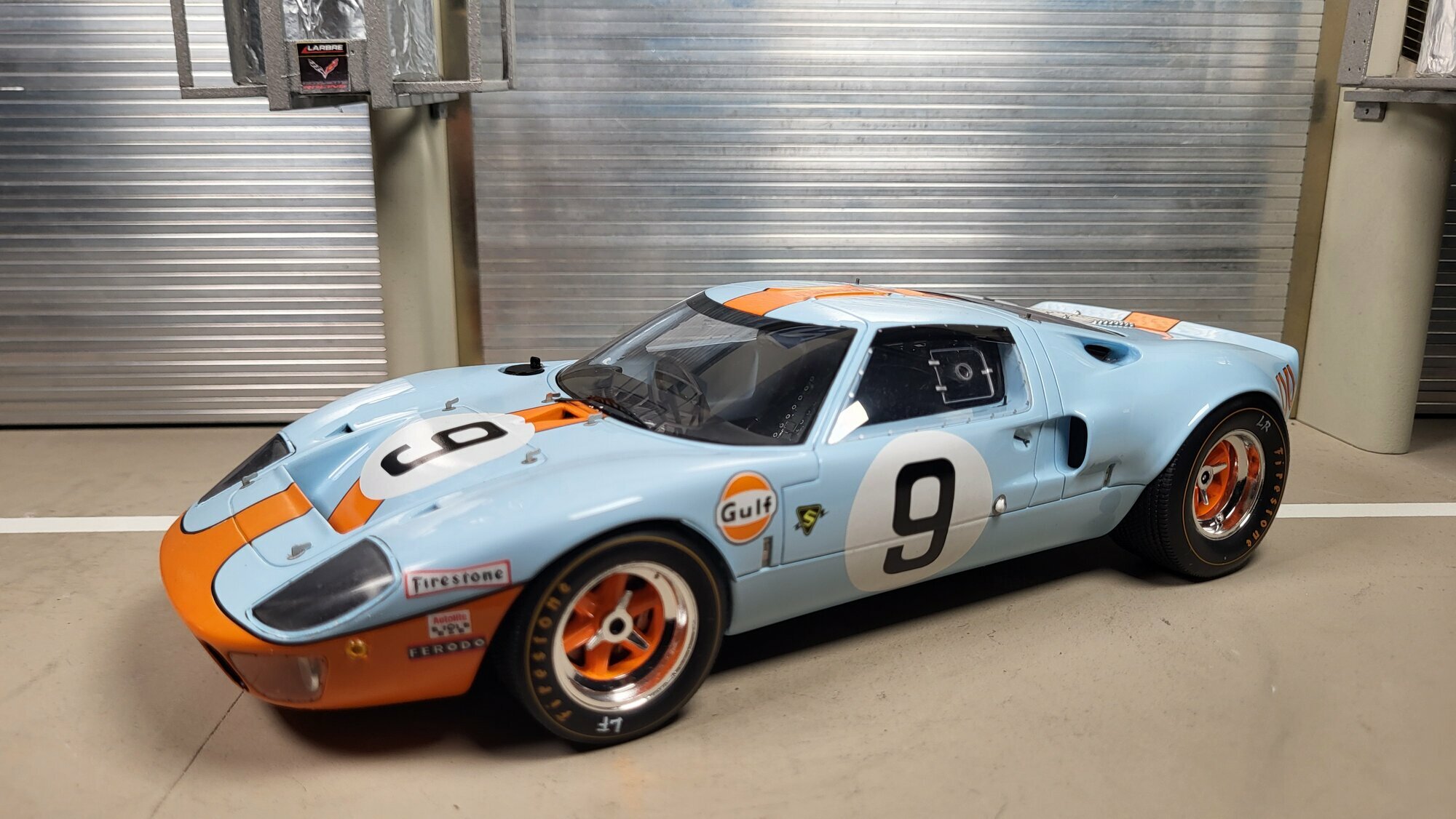 The model car pictured here and manufactured by SPARK is a remarkable replica of the legendary Ford GT40 MK I in a 1/18 scale. This model is made of high-quality resin and offers an impressive level of detail that captures the beauty and technical design of the original. In the photos by Modelly member "Phat-T," you can see the iconic blue color scheme with orange racing stripes and numerous sponsor decals, such as Gulf and Firestone, that add authenticity to the model.