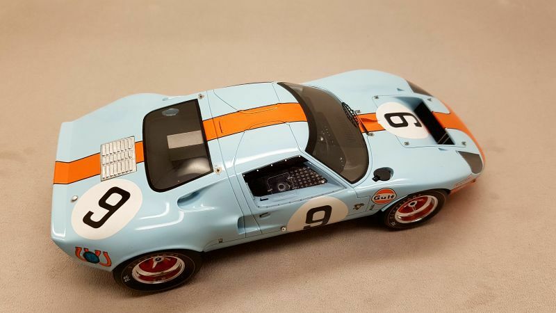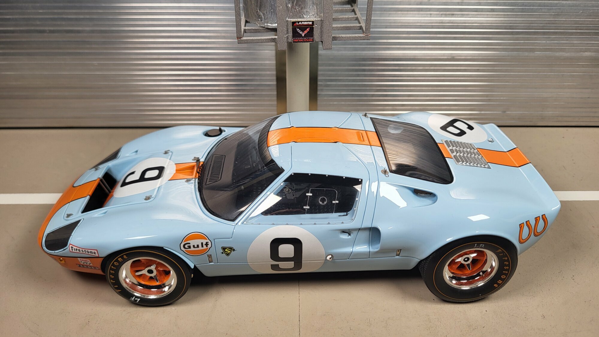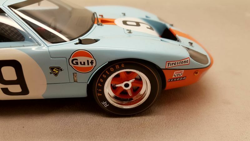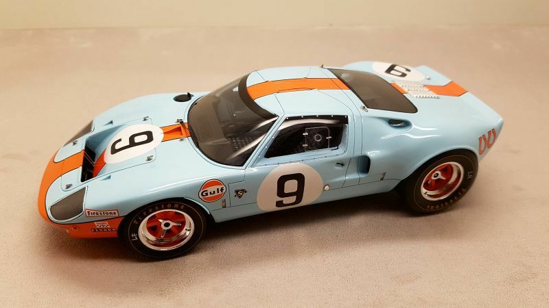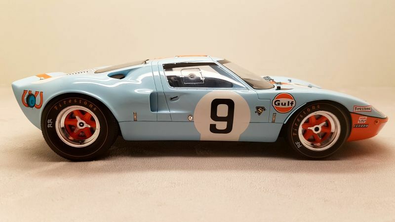 The model car pictured here and manufactured by SPARK is a remarkable replica of the legendary Ford GT40 MK I in a 1/18 scale. This model is made of high-quality resin and offers an impressive level of detail that captures the beauty and technical design of the original. In the photos by Modelly member "Phat-T," you can see the iconic blue color scheme with orange racing stripes and numerous sponsor decals, such as Gulf and Firestone, that add authenticity to the model.