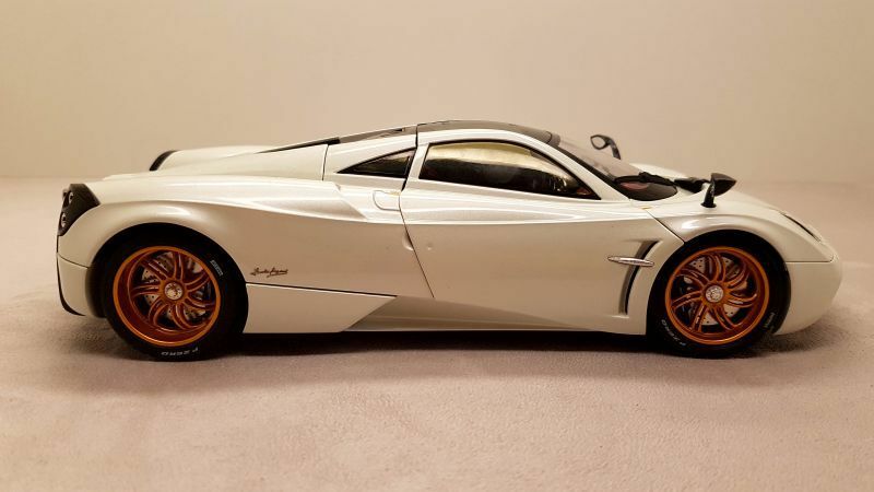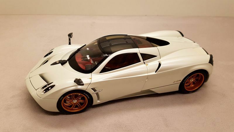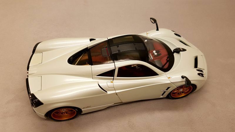 This 1/18 scale model car, made by Welly GT, is a faithful replica of the Pagani Huayra. The model kit is crafted from high-quality die-cast material known for its durability and authentic feel. In the collection of Modelly member "Phat-T," this model offers an impressive sight. The high-quality printing and precisely machined parts make this model a must-have for any model car collector. The precisely replicated aerodynamic elements and the shiny black stripe on the roof that accentuates the overall design of the vehicle are particularly striking. The model car's body also mirrors the fine lines and aerodynamic shape of the original, further emphasizing the accuracy of this model.
