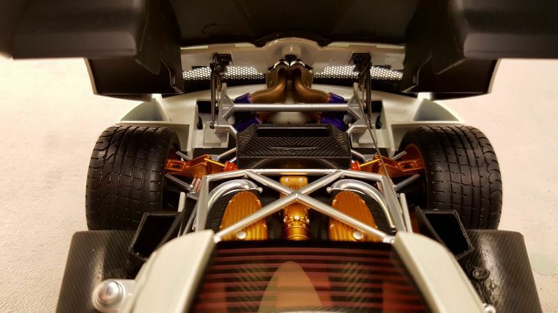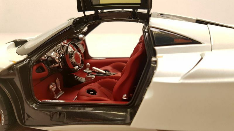 The white pearl paint of the model vehicle adds an elegant touch and underscores the luxurious character of the real Pagani Huayra. The standout feature is the golden wheels, which seamlessly integrate into the overall design and add an extra touch of exclusivity to the model. The wheels of the model car come from the renowned wheel manufacturer OZ Racing, known for its high-quality and lightweight wheels used in both motorsport and high-end road vehicles. Every contour and implied seam line of the model vehicle instantly reveals how much attention to detail and precision went into the manufacturing process. The small but important details like the Pagani emblems and brand insignia are also present on the model, making it a complete replica of the original.