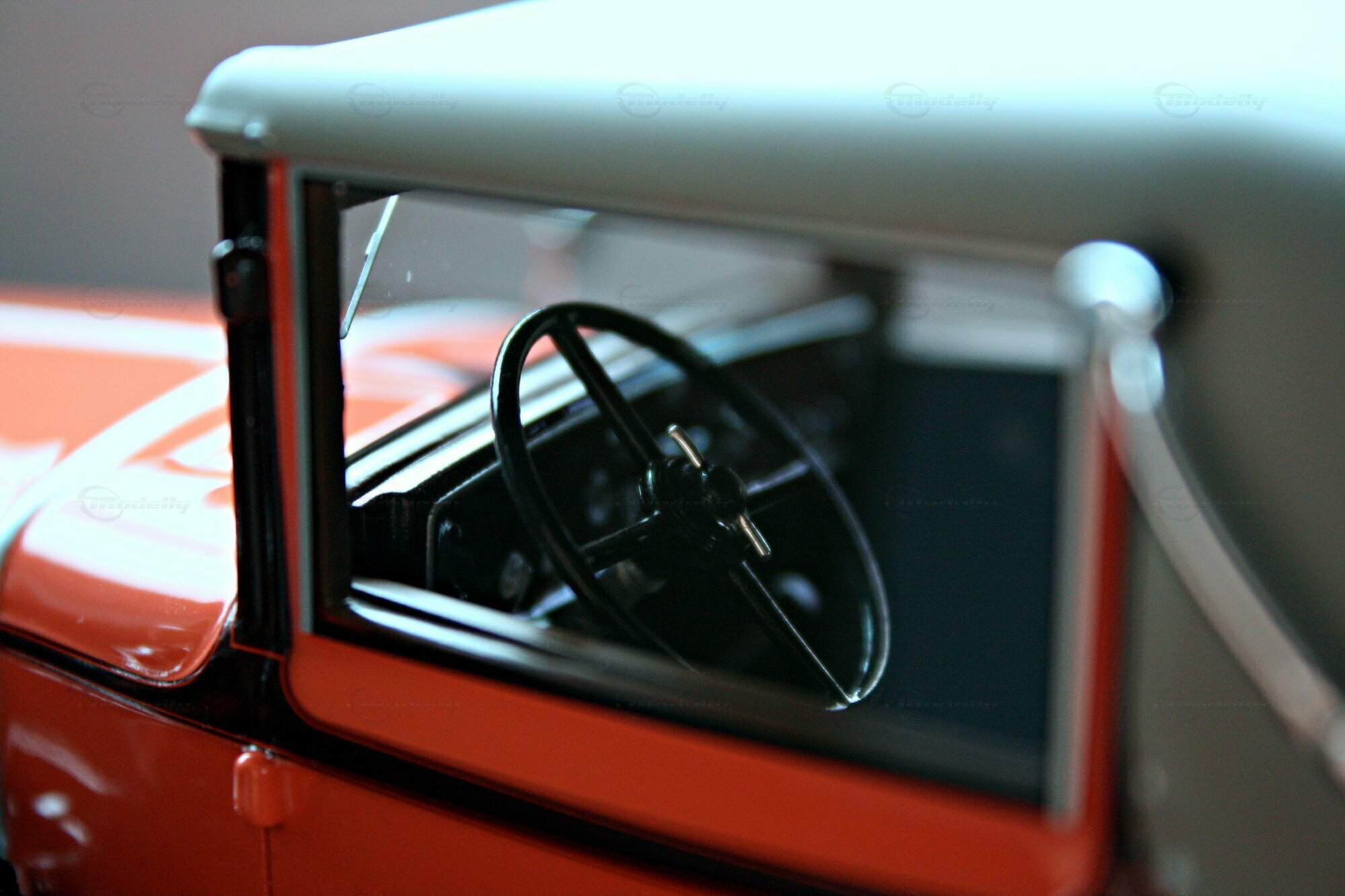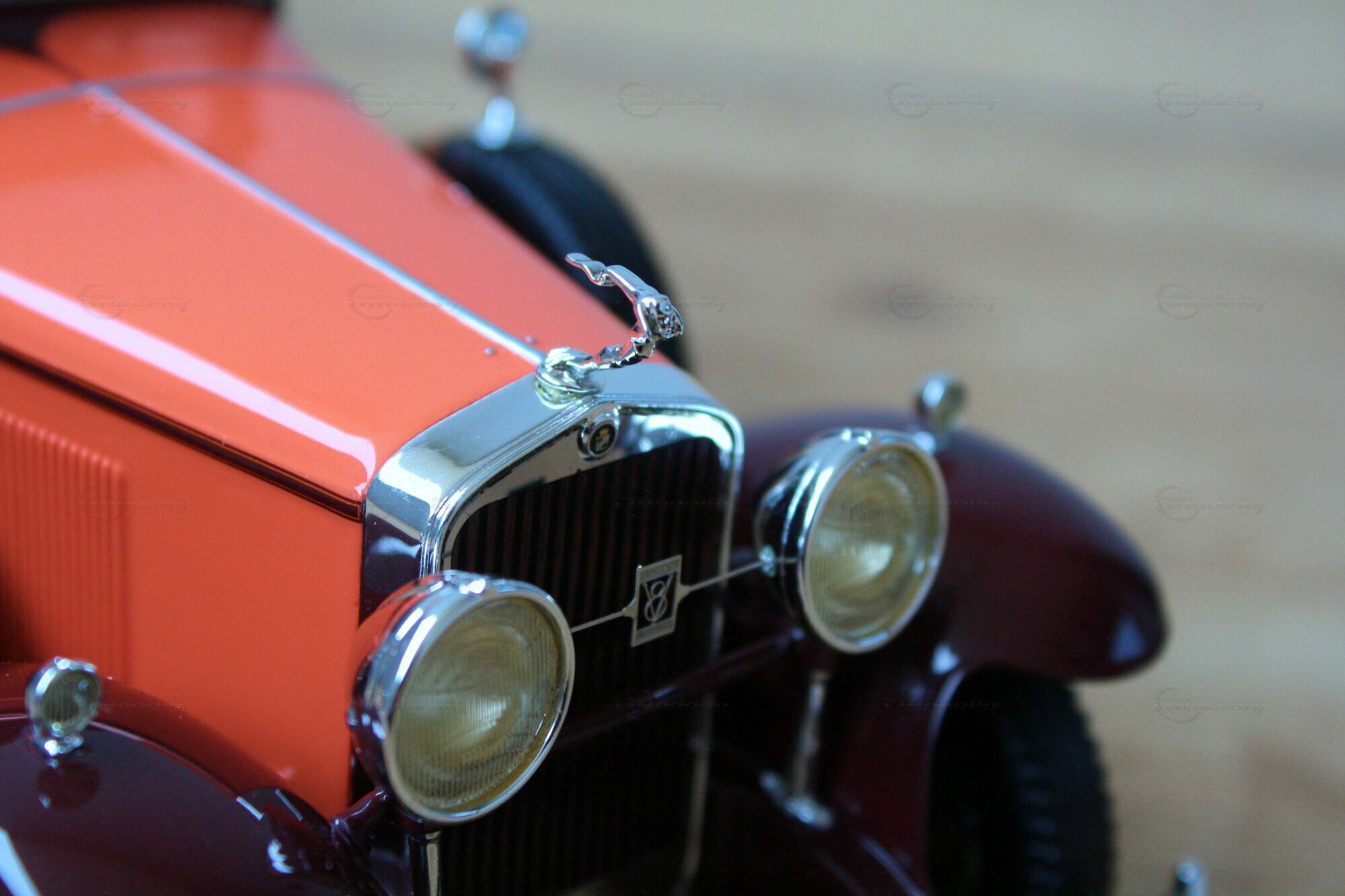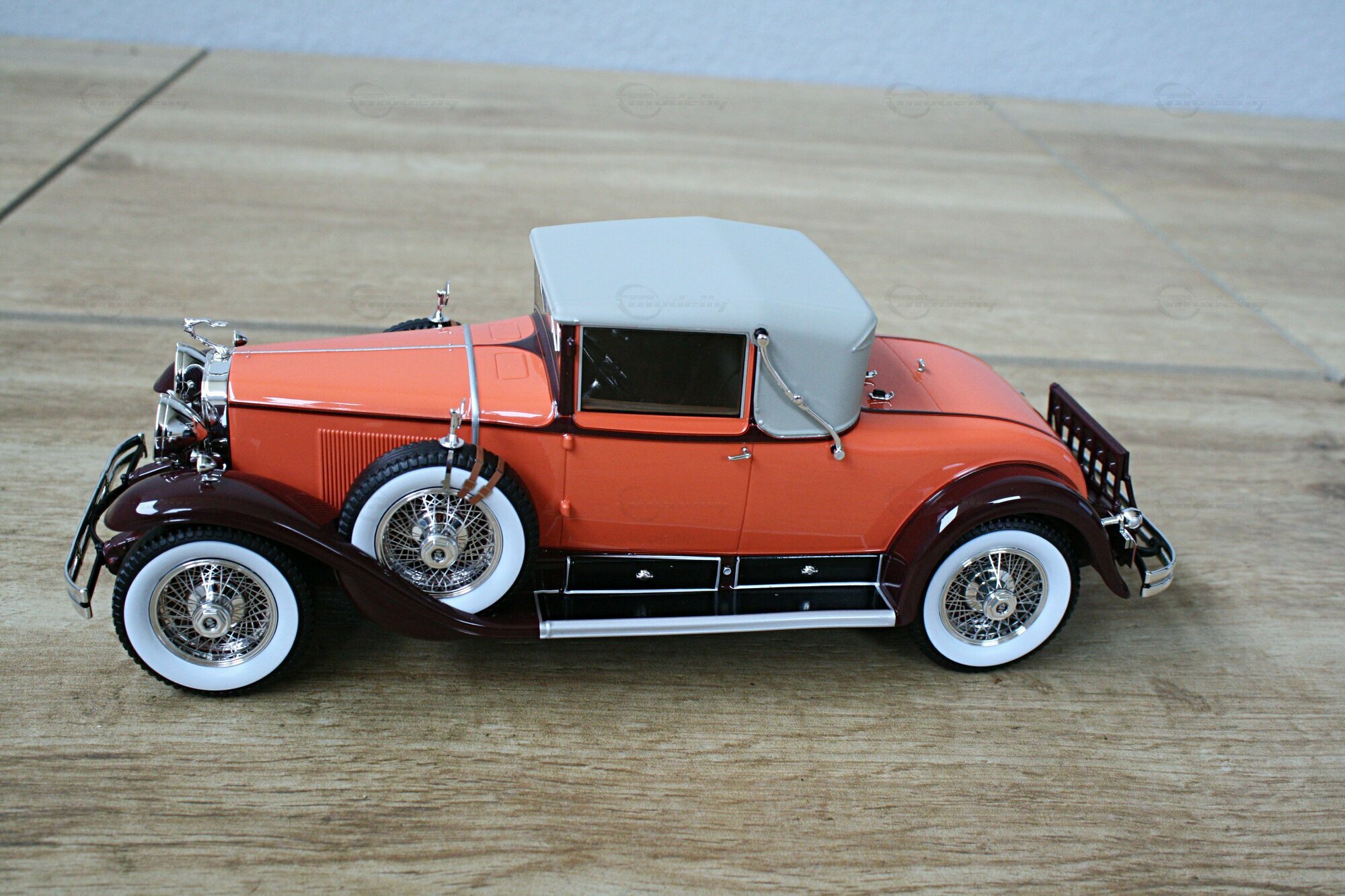 The Cadillac 341 B Convertible Coupé miniature model by BoS in 1/18 scale impresses with its carefully chosen color scheme. It combines an elegant orange hue with contrasting burgundy, capturing the classic style of the original vehicle. The silver body frame and detailed headlights enhance the model's luxurious character. Additionally, the model features a gray, removable convertible top completing the authentic cabriolet look. The precise reproduction of brand emblems and the detailed body shape make this model a must-have for any collector. The charm and elegance of this historical vehicle are perfectly encapsulated by the model, making it a true gem in any collection.