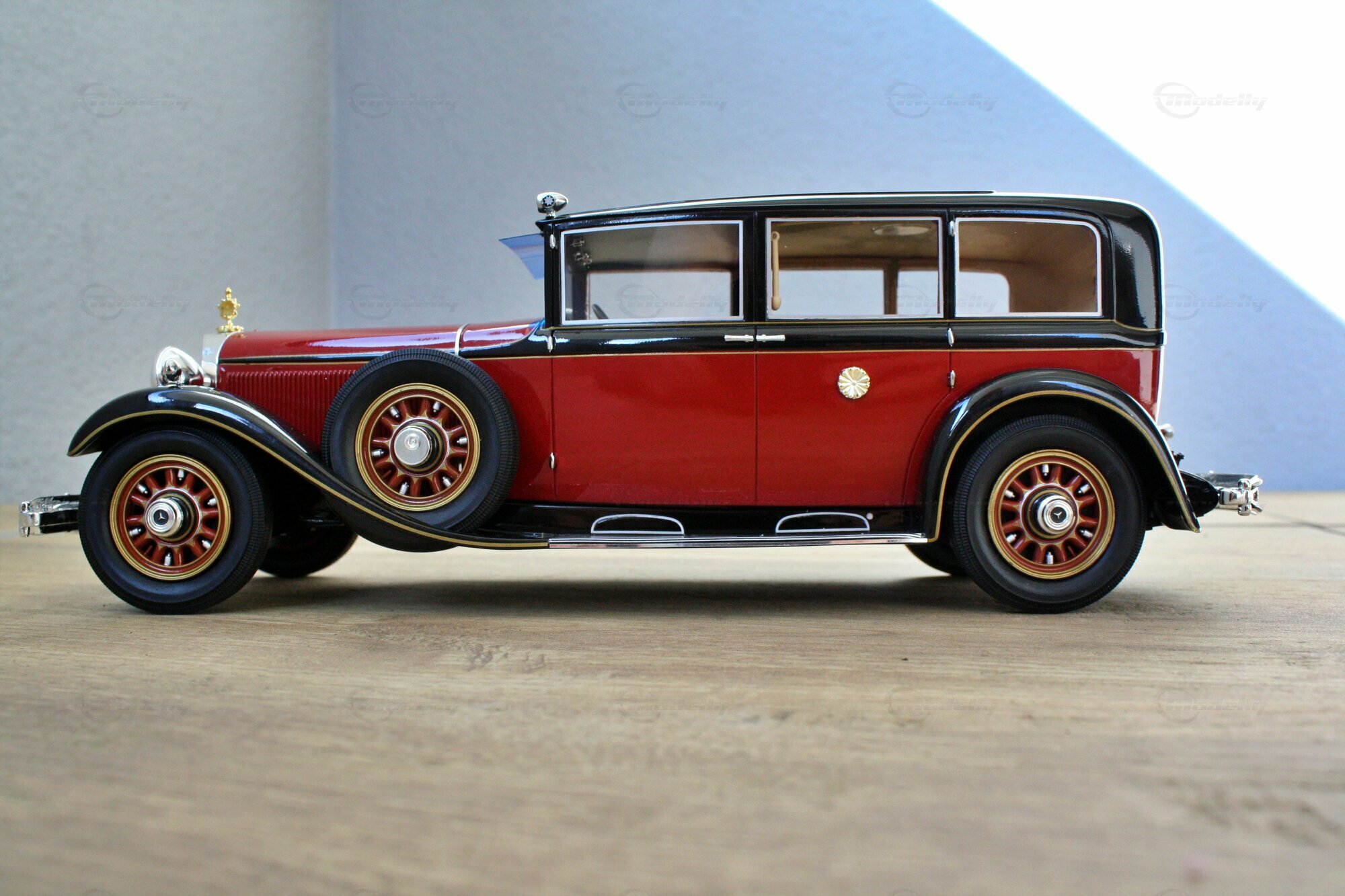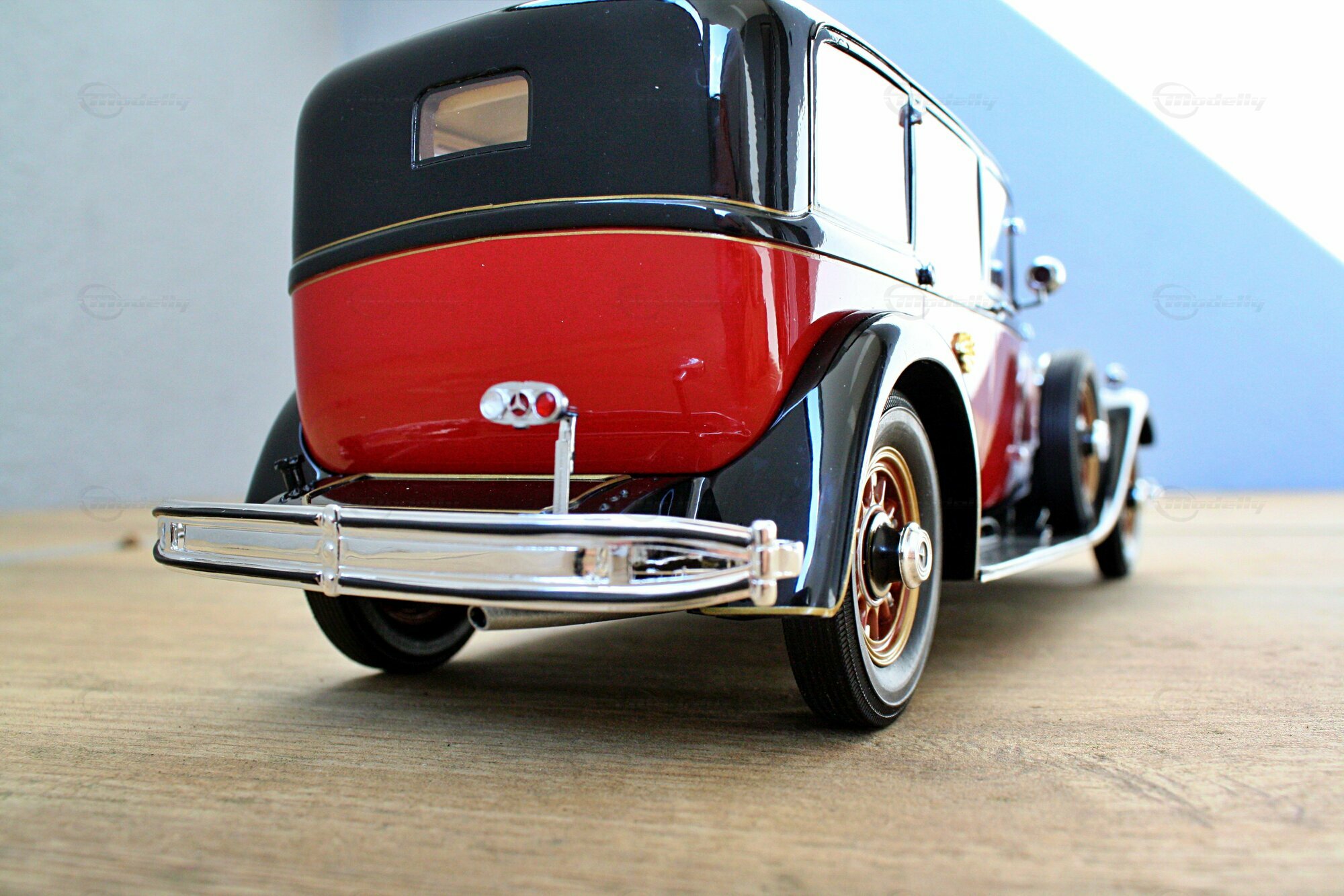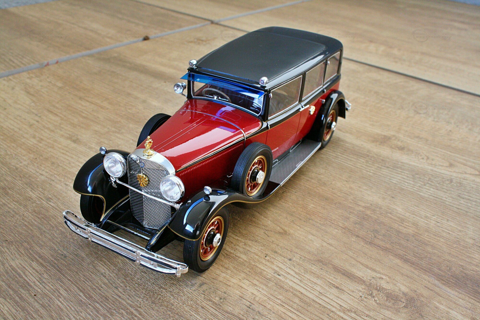 The 1/18 scale model shown here was manufactured by CMF and is made of high-quality resin. It depicts the detailed replica of the Mercedes Benz 770 Pullman Limousine. This model is part of the collection of a Modelly member named "Play-X" and is characterized by its outstanding attention to detail. In the pictures, you can see the precise replication of various elements of the original. The model's paint scheme is an impressive combination of black and red, giving the model an authentic and elegant look. The gold accents and finely crafted gloss finish further contribute to its luxurious appearance.