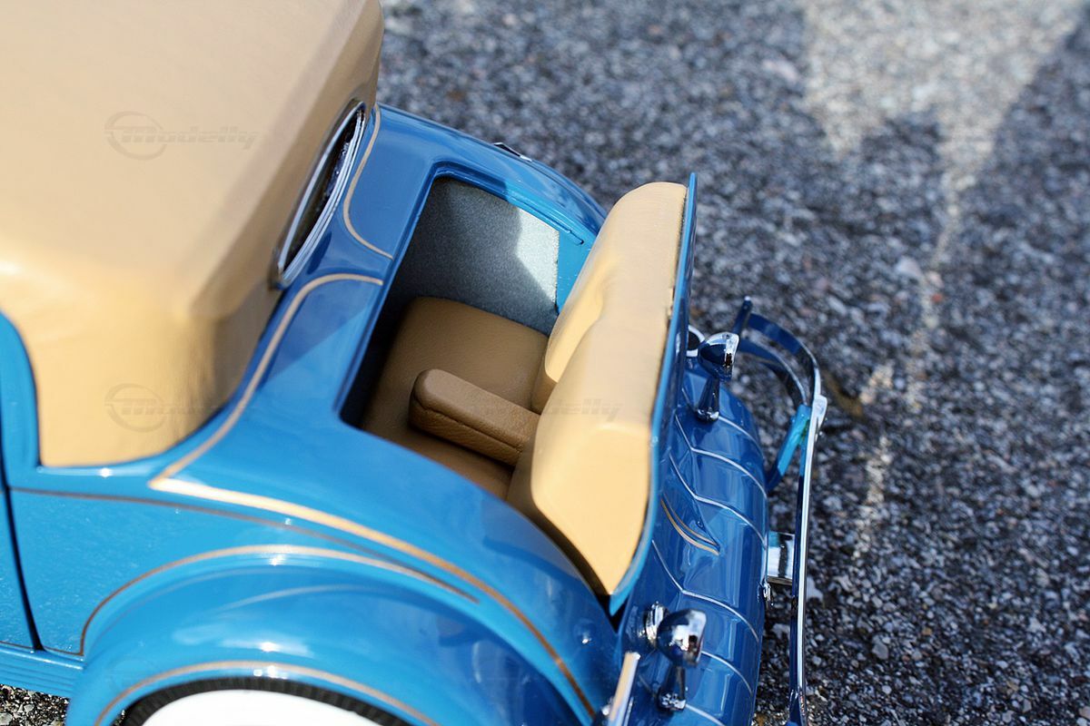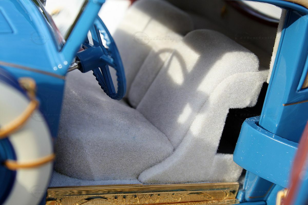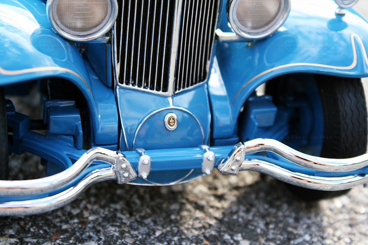 The miniature model of the Cord L-29 Special Coupe described here is an accurate replica in a 1/16 scale, made from high-quality die-cast material. Thanks to Danbury Mint's precise craftsmanship, many of the fine details of the original are well represented. The standout features include the white wall tires and the classic two-tone paint scheme in blue and beige. The contrasting white tires border the detailed blue wheels, creating an visually appealing ensemble. The front of the model showcases the distinctive headlights and chrome grille design that reflect the imposing character of the original.