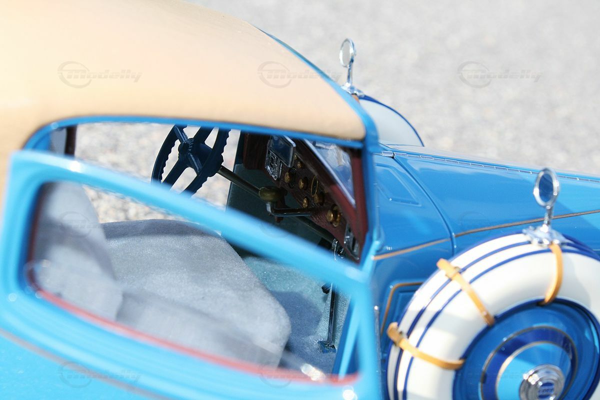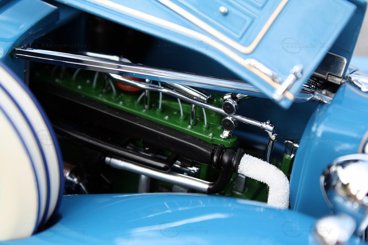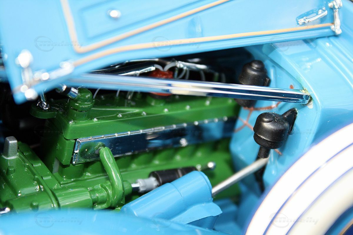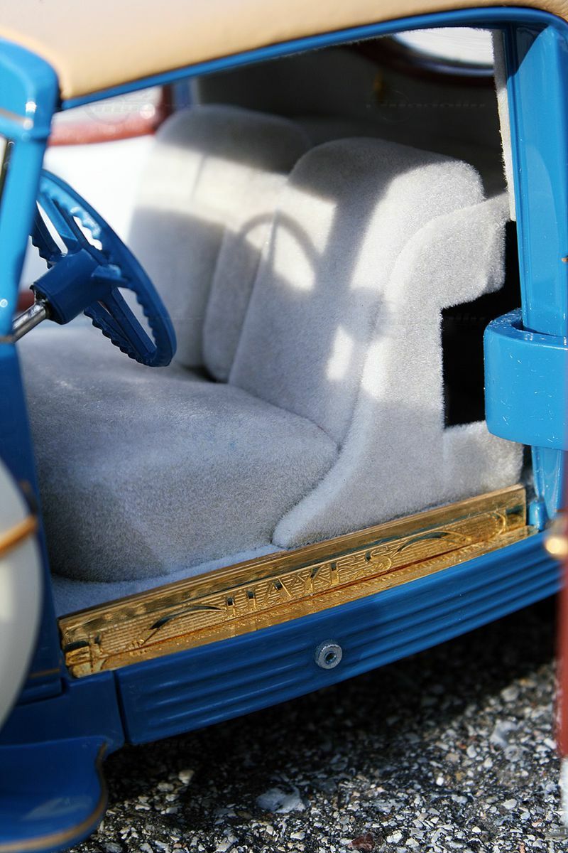 The miniature model of the Cord L-29 Special Coupe described here is an accurate replica in a 1/16 scale, made from high-quality die-cast material. Thanks to Danbury Mint's precise craftsmanship, many of the fine details of the original are well represented. The standout features include the white wall tires and the classic two-tone paint scheme in blue and beige. The contrasting white tires border the detailed blue wheels, creating an visually appealing ensemble. The front of the model showcases the distinctive headlights and chrome grille design that reflect the imposing character of the original.