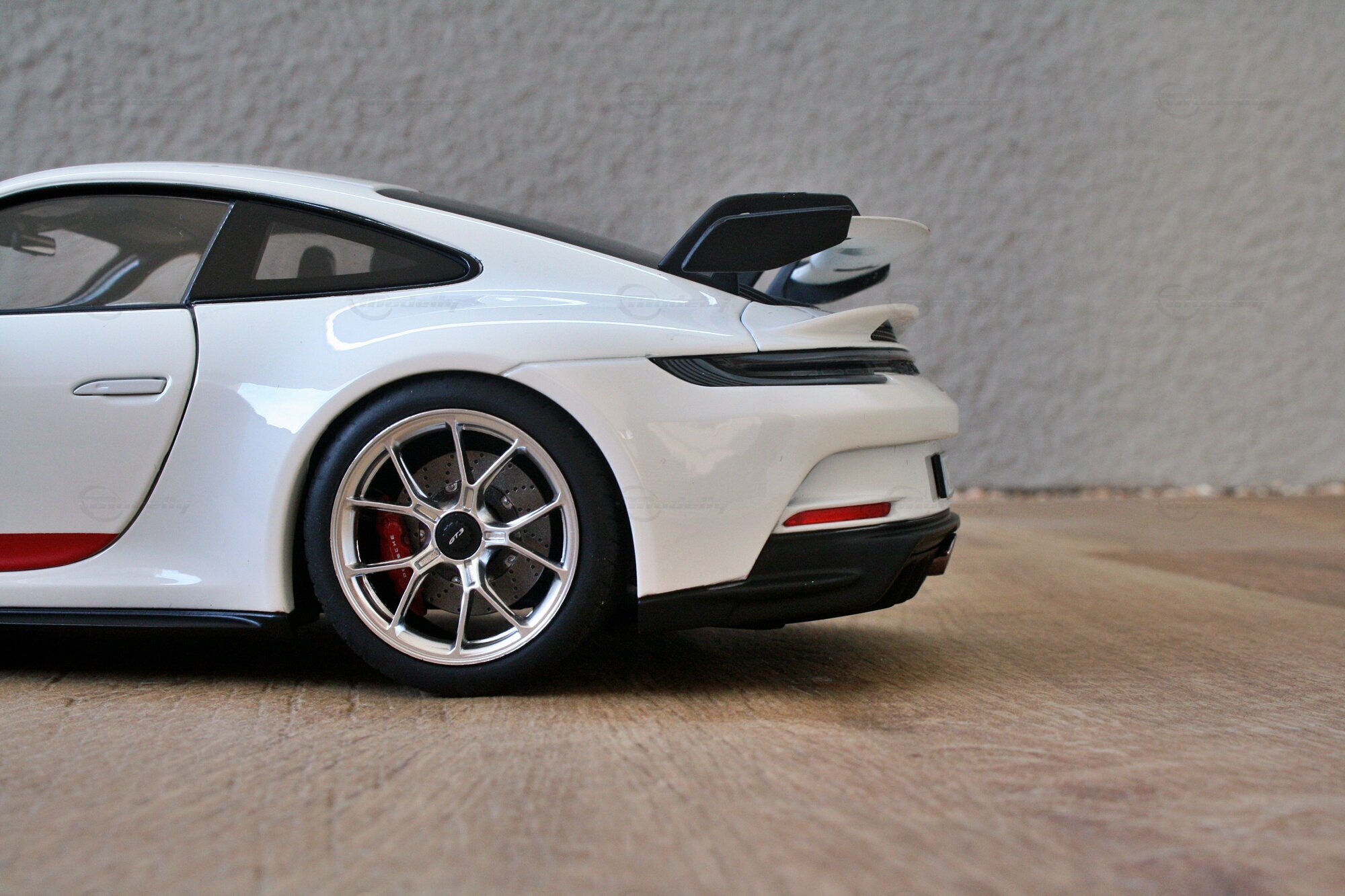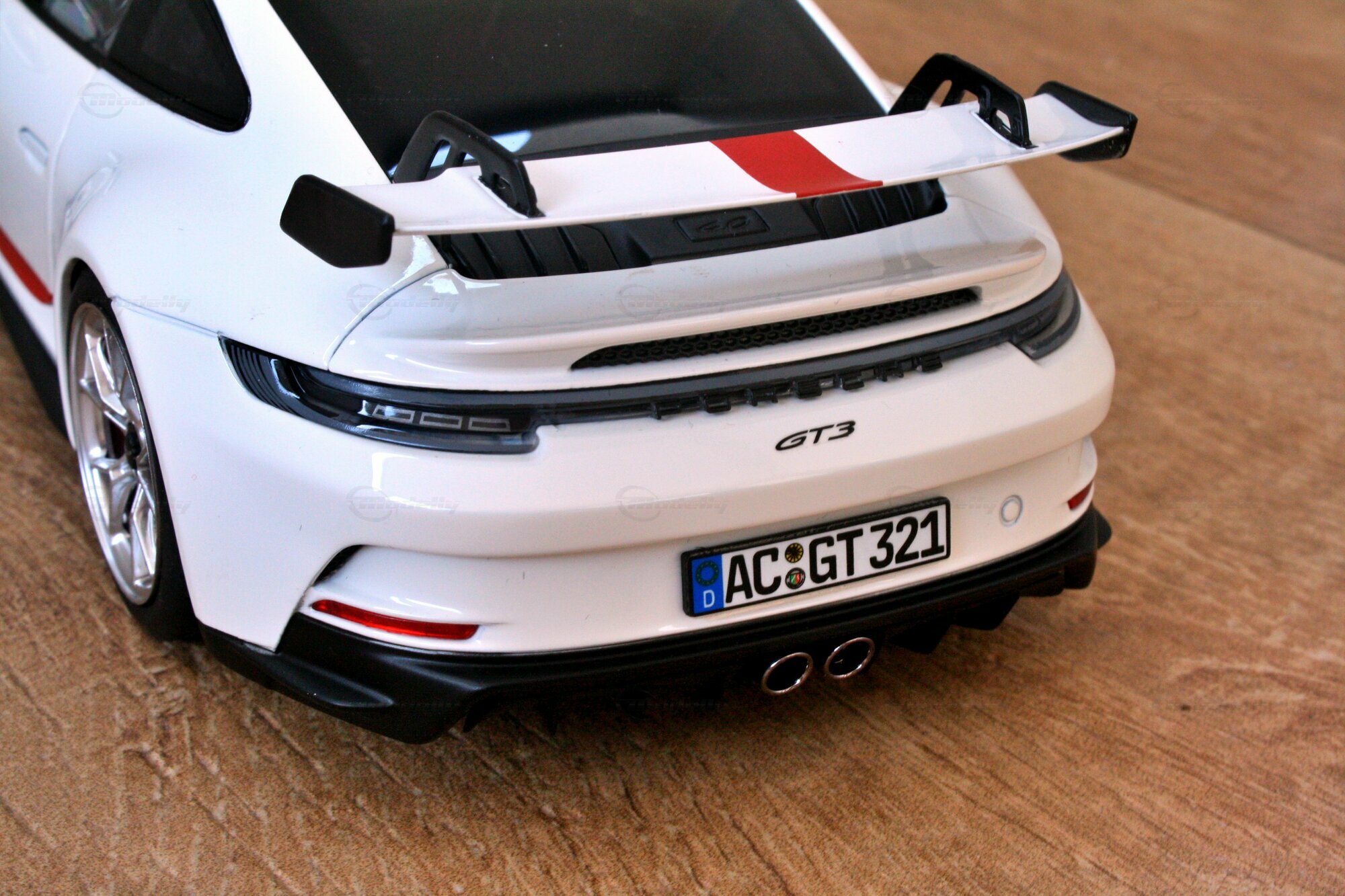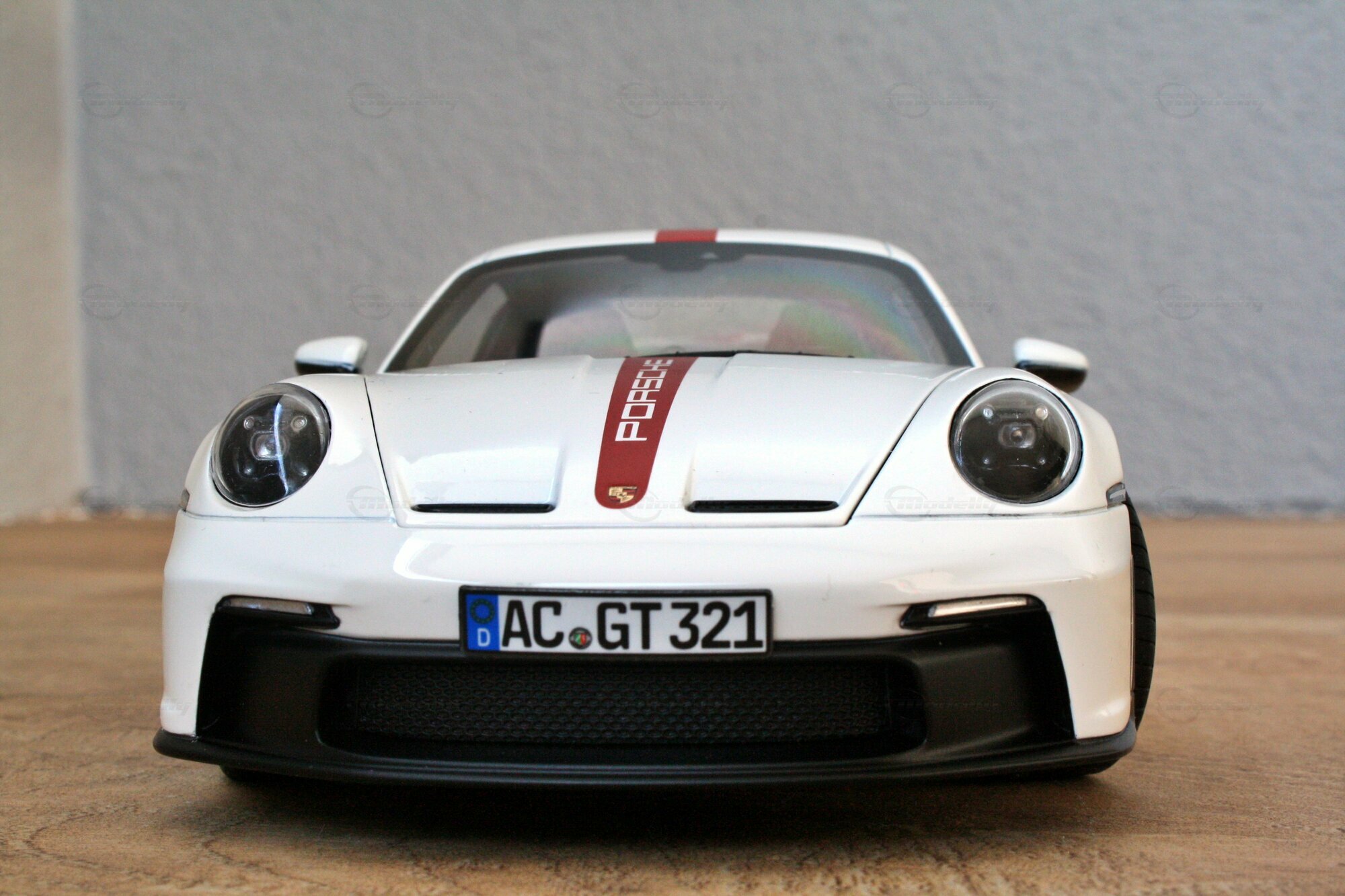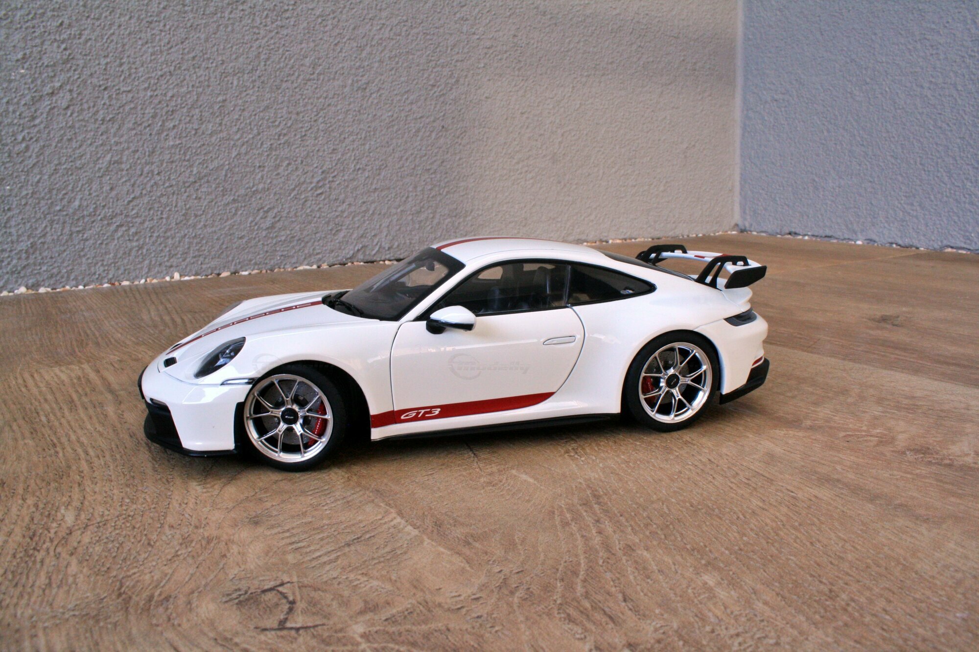 The 1/18 scale model by Norev perfectly reflects the impressive design of the Porsche 911 (992) GT3. The detailed headlights and the striking body shape that conveys the sportiness of the original stand out. The wheels, crafted by BBS, are also a highlight of the model, giving it an authentic look. Special attention was paid to the realistic portrayal of the paintwork; the white and red components are precisely applied and carefully executed following the original's specifications. Overall, the model is of high quality and impressive detail accuracy. This precision and choice of materials make it a valuable piece for any model car collection.