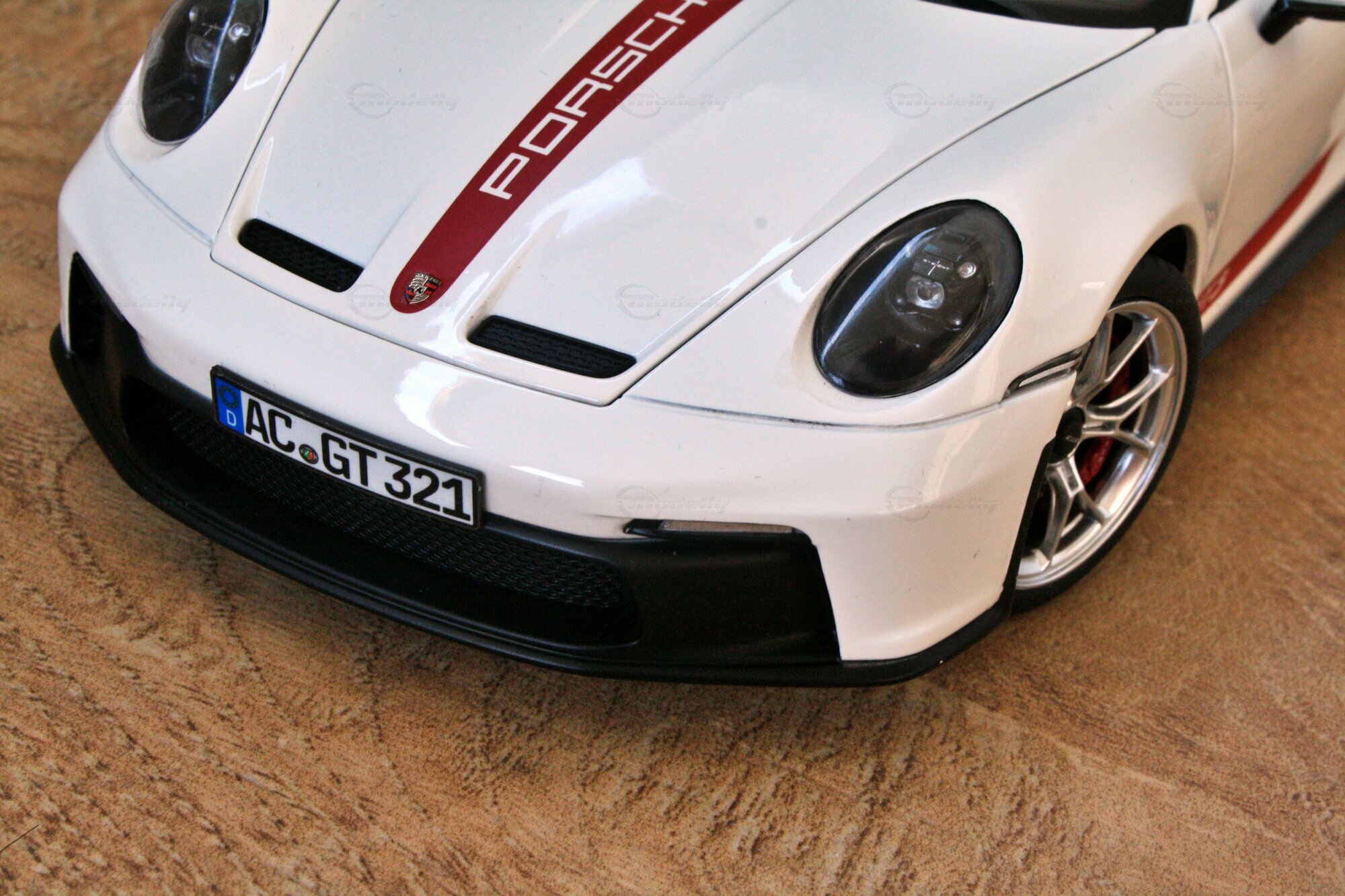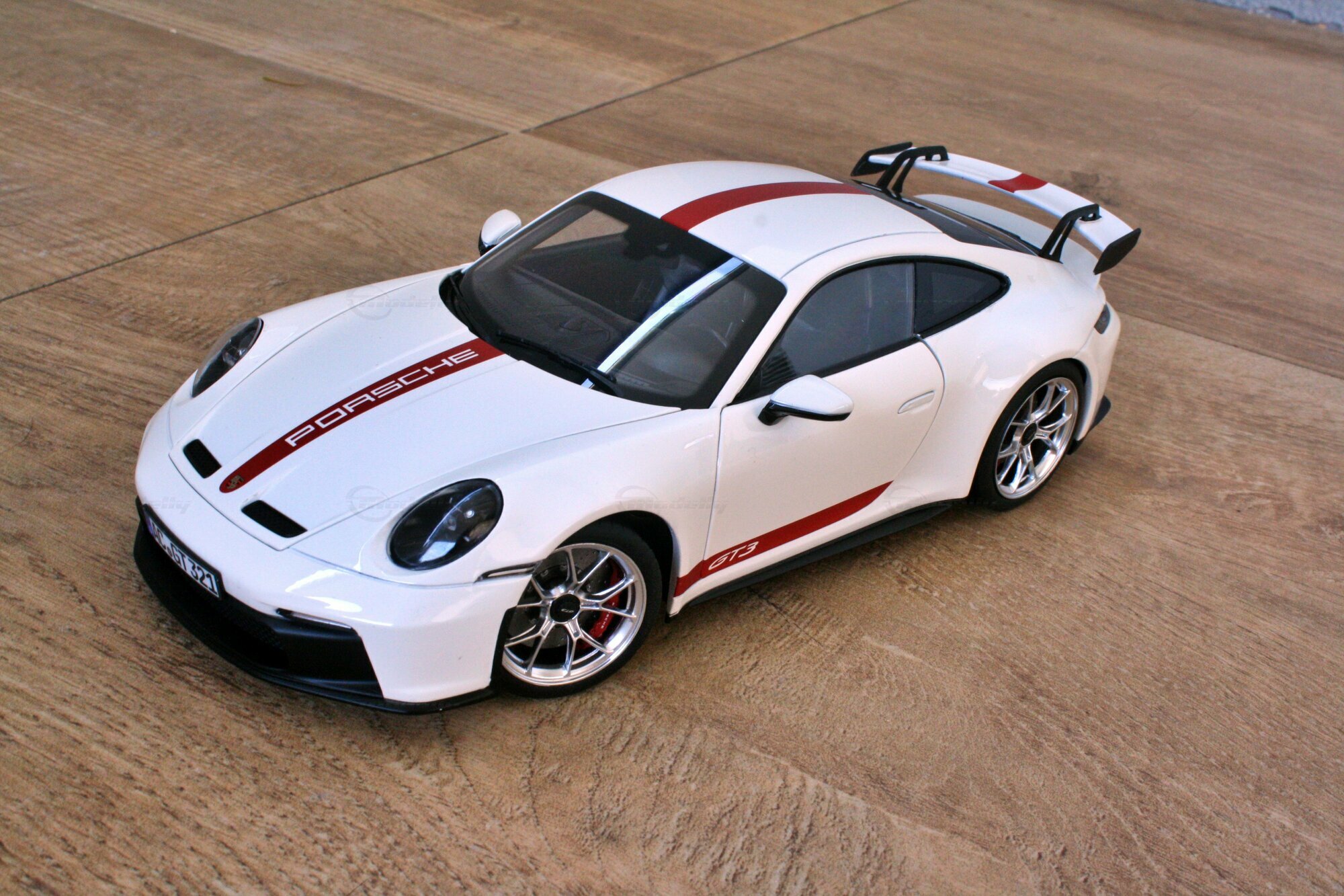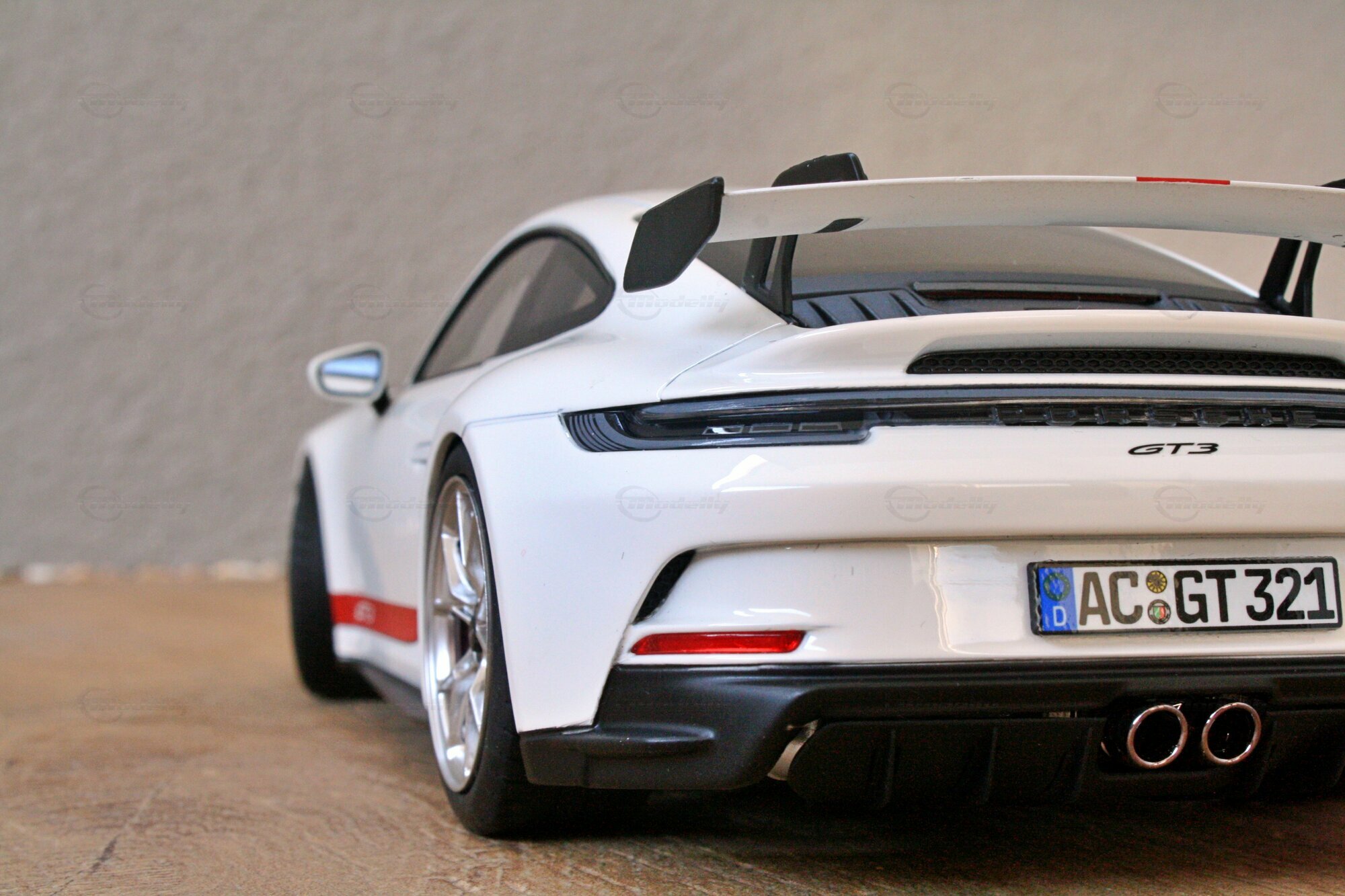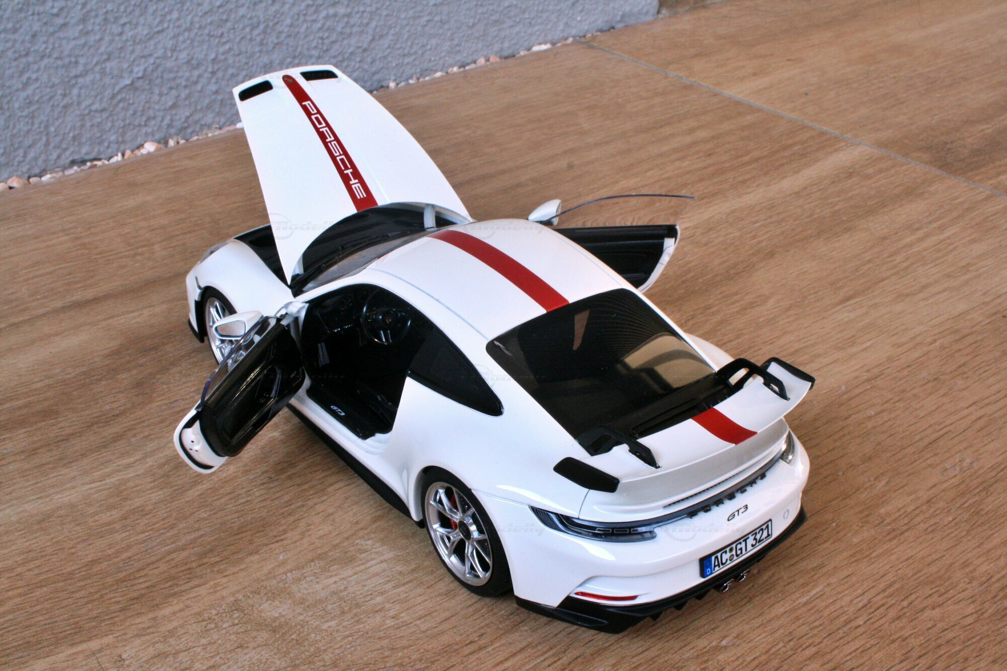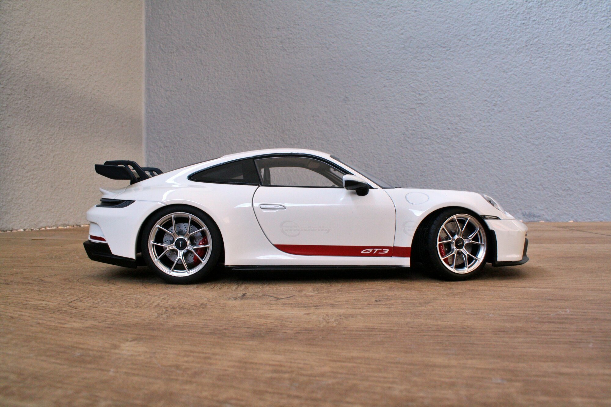 The 1/18 scale model by Norev perfectly reflects the impressive design of the Porsche 911 (992) GT3. The detailed headlights and the striking body shape that conveys the sportiness of the original stand out. The wheels, crafted by BBS, are also a highlight of the model, giving it an authentic look. Special attention was paid to the realistic portrayal of the paintwork; the white and red components are precisely applied and carefully executed following the original's specifications. Overall, the model is of high quality and impressive detail accuracy. This precision and choice of materials make it a valuable piece for any model car collection.