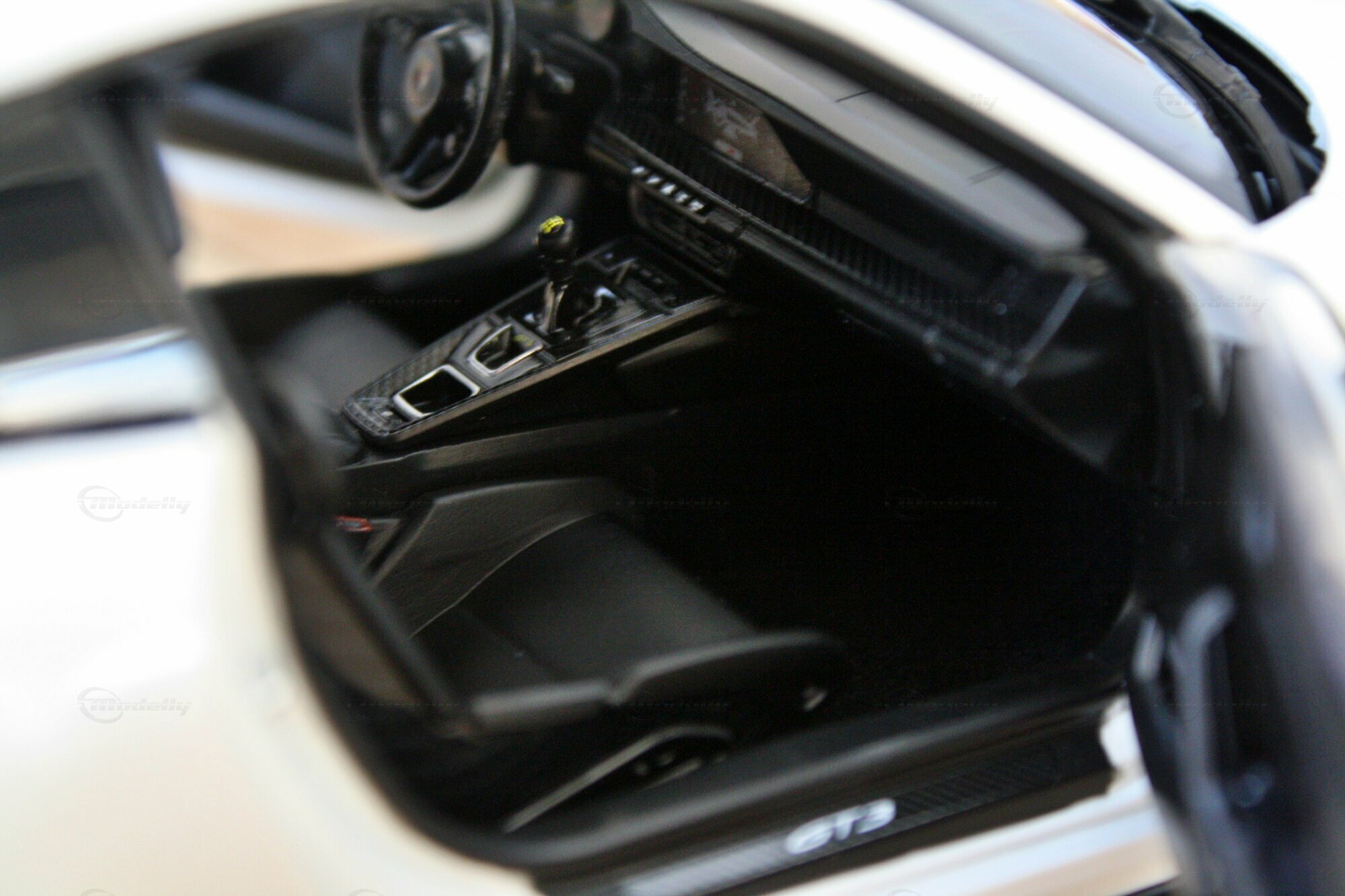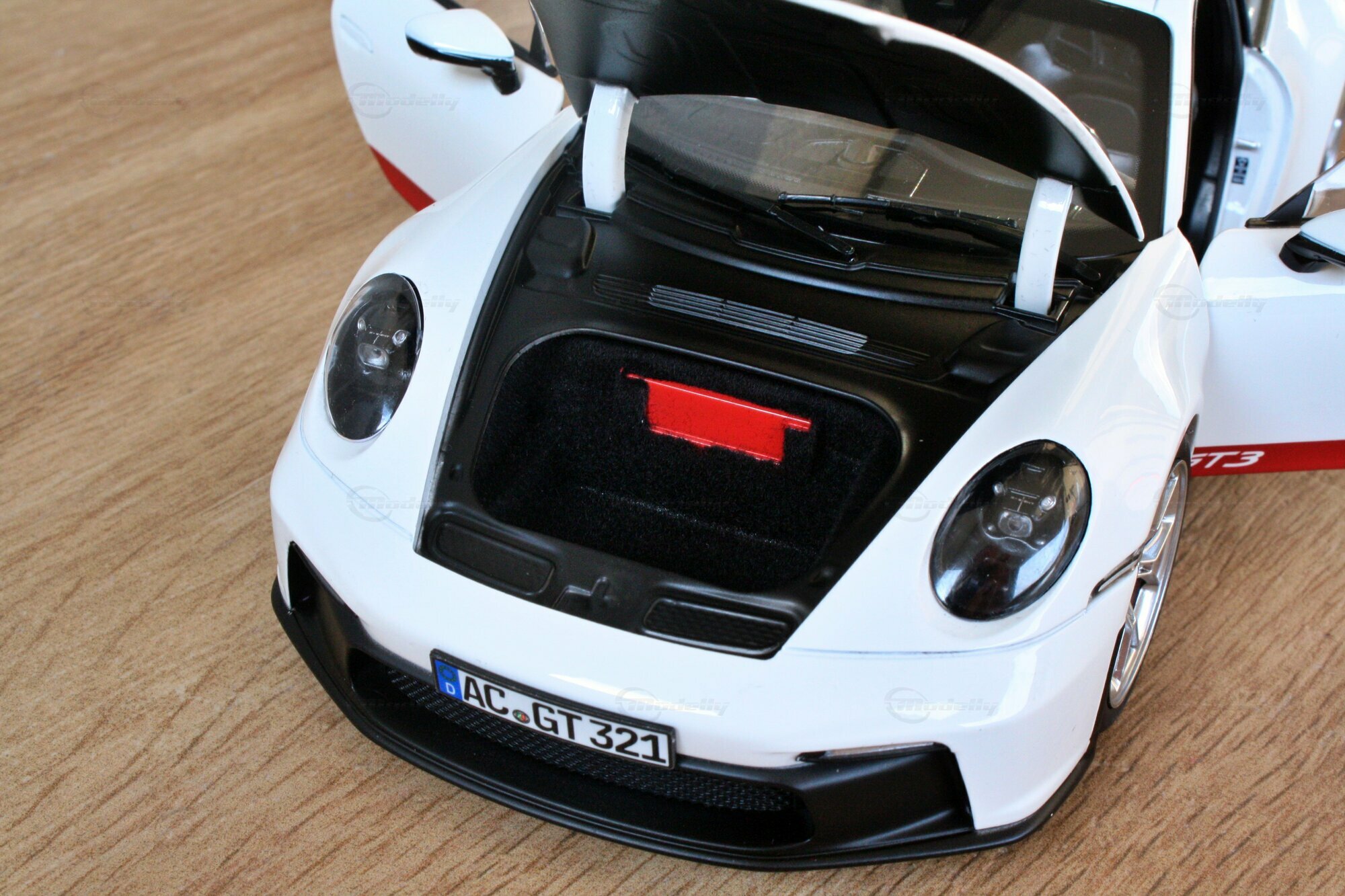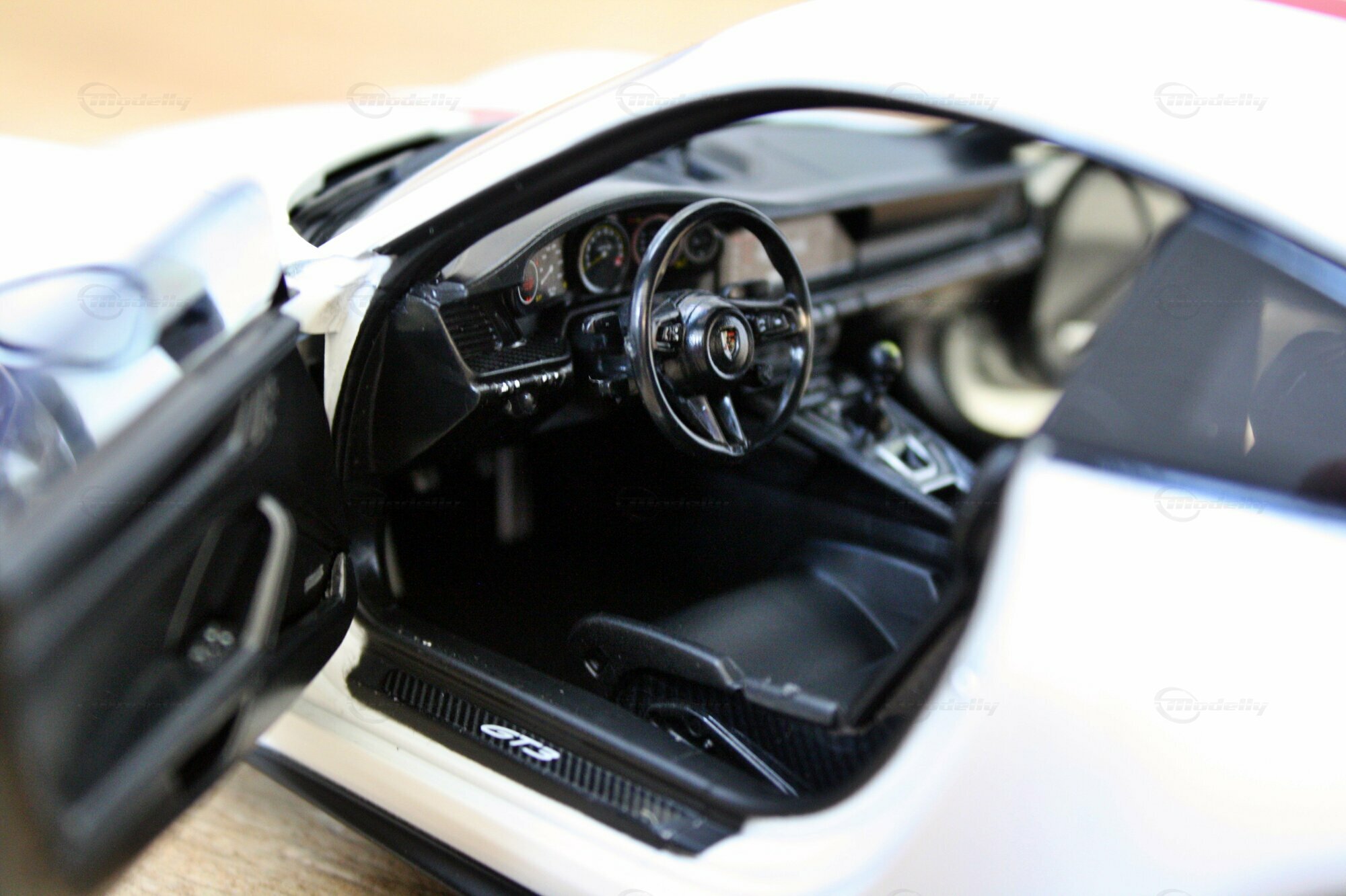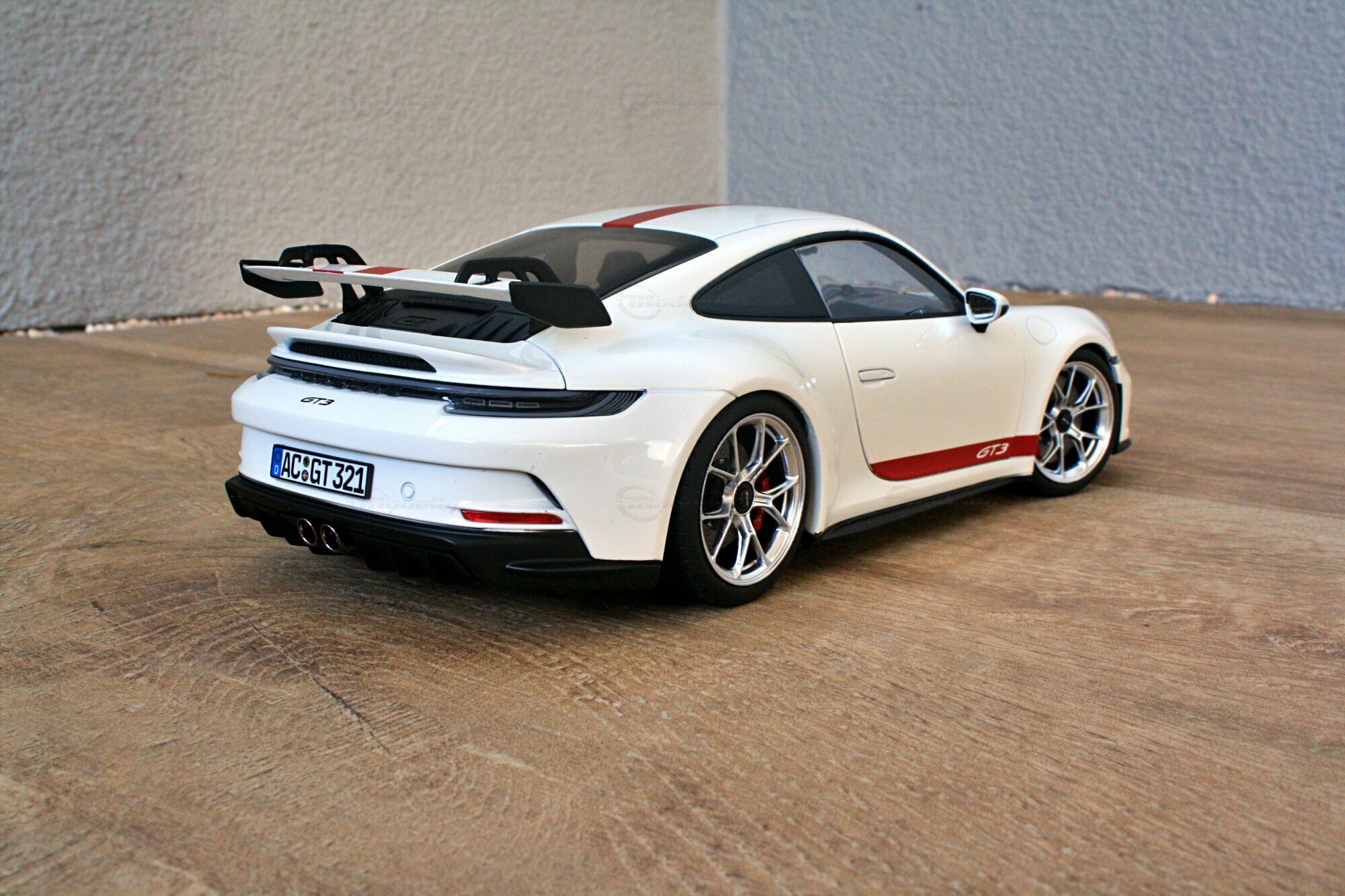 The 1/18 scale model by Norev perfectly reflects the impressive design of the Porsche 911 (992) GT3. The detailed headlights and the striking body shape that conveys the sportiness of the original stand out. The wheels, crafted by BBS, are also a highlight of the model, giving it an authentic look. Special attention was paid to the realistic portrayal of the paintwork; the white and red components are precisely applied and carefully executed following the original's specifications. Overall, the model is of high quality and impressive detail accuracy. This precision and choice of materials make it a valuable piece for any model car collection.