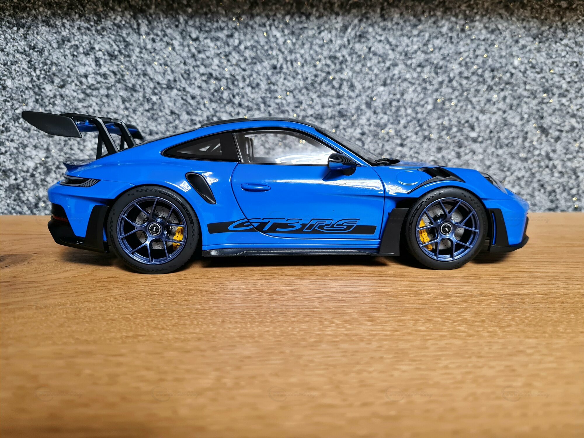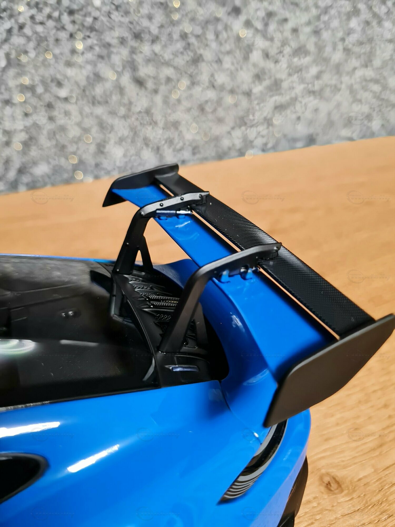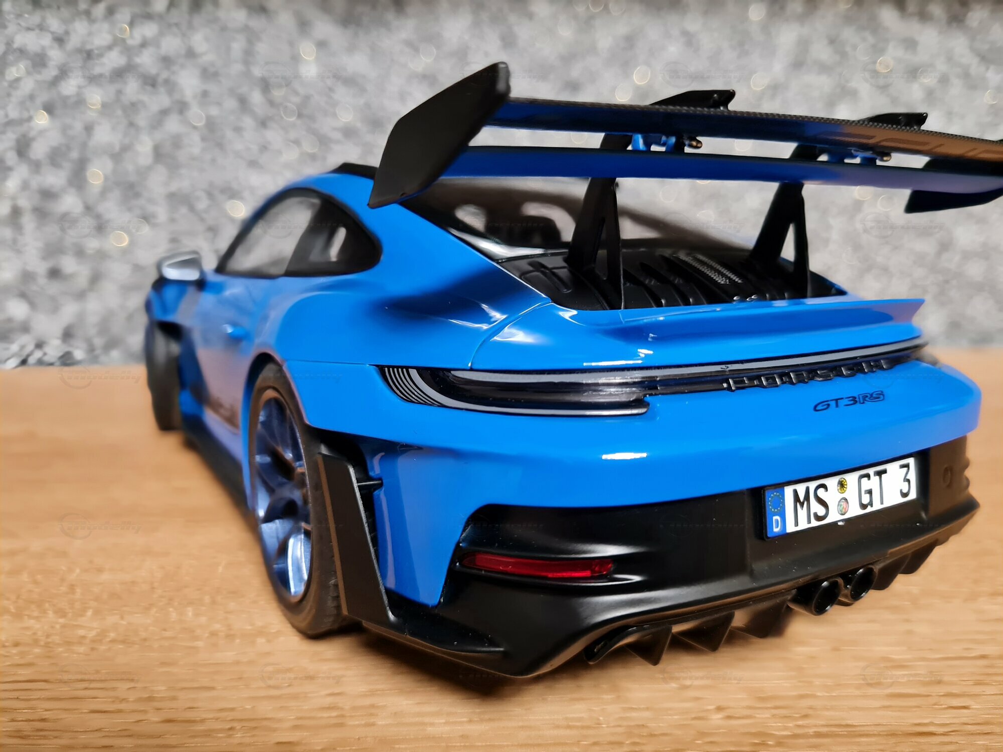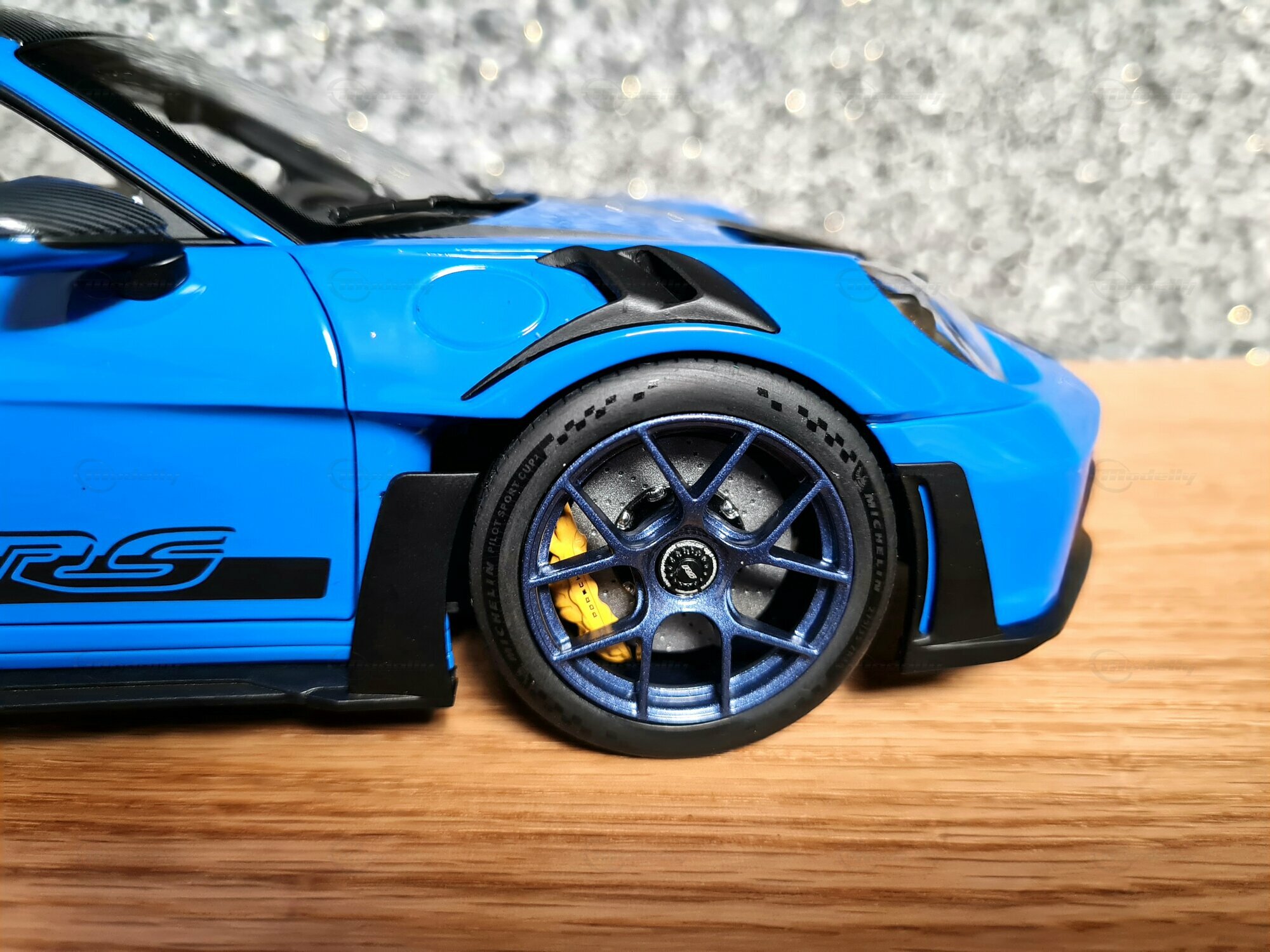 The Norev 1/18 scale model of the Porsche 911 (992) GT3 RS is a real eye-catcher, especially in the vibrant blue color seen in the photos. Norev achieves the depiction of the model with a combination of blue paint and black accents, creating an authentic appearance that perfectly captures the enthusiasm and beauty of the original GT3 RS. The miniature model showcases details such as the ventilation slits on the hood, the large rear wing, and the distinctive side stripes bearing the "GT3 RS" lettering. These characteristic features mirror the aggressive and aerodynamic design of the original. Even more impressive are the wheels, clearly depicting the sporty rims and brakes with yellow calipers on the model. Every detail is carefully transferred to the model to reflect the charm and precision of the real vehicle.