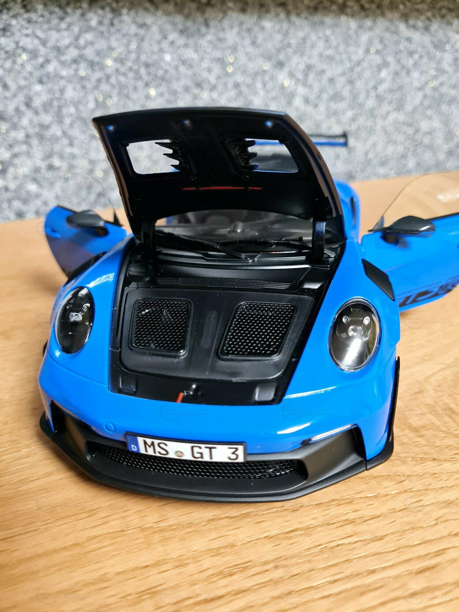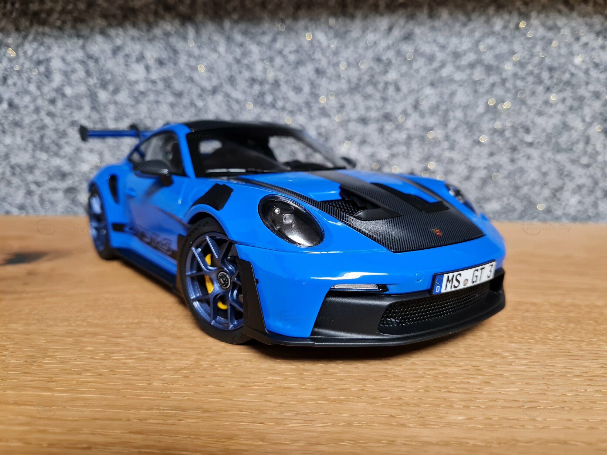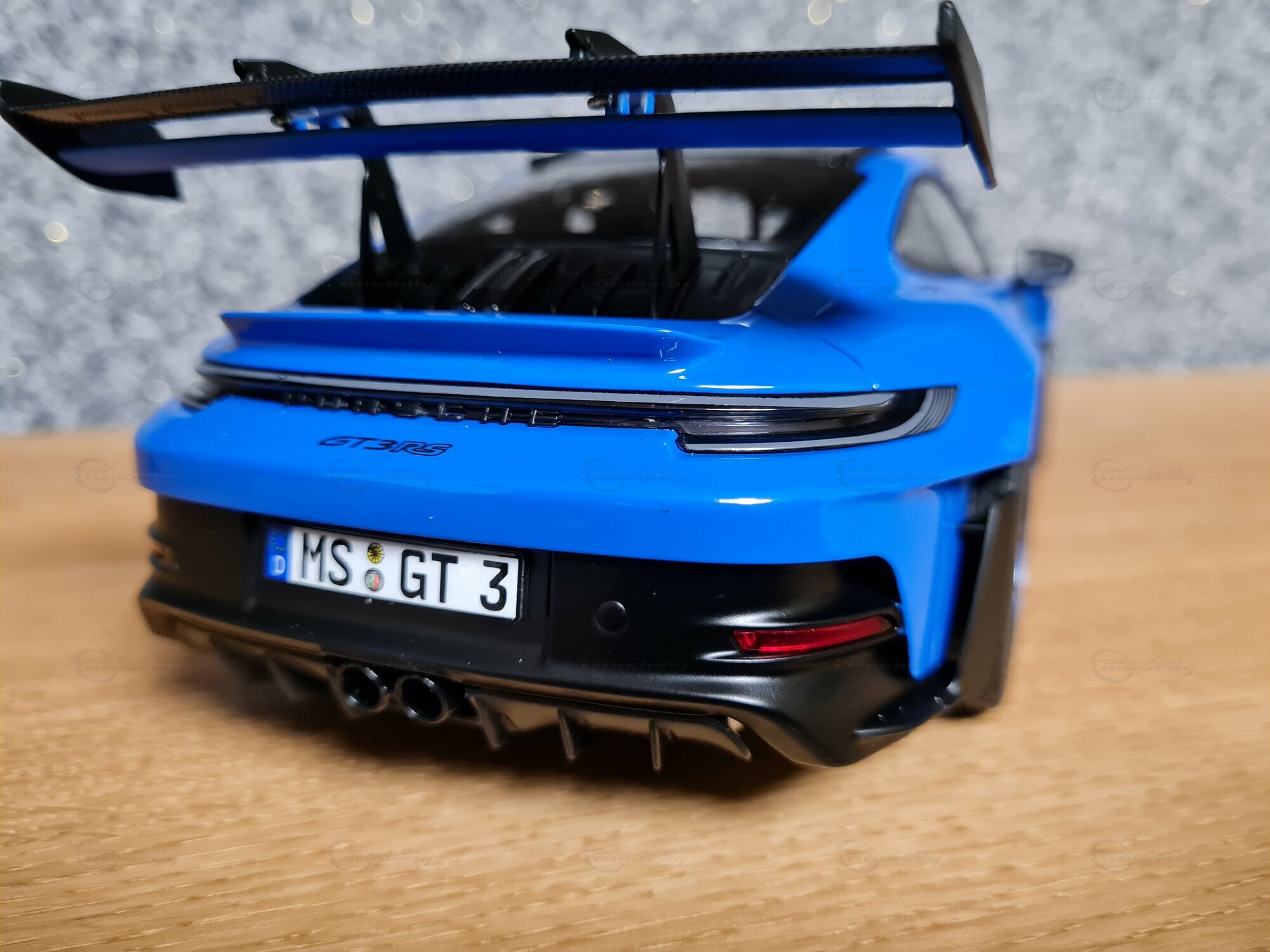 The Norev 1/18 scale model of the Porsche 911 (992) GT3 RS is a real eye-catcher, especially in the vibrant blue color seen in the photos. Norev achieves the depiction of the model with a combination of blue paint and black accents, creating an authentic appearance that perfectly captures the enthusiasm and beauty of the original GT3 RS. The miniature model showcases details such as the ventilation slits on the hood, the large rear wing, and the distinctive side stripes bearing the "GT3 RS" lettering. These characteristic features mirror the aggressive and aerodynamic design of the original. Even more impressive are the wheels, clearly depicting the sporty rims and brakes with yellow calipers on the model. Every detail is carefully transferred to the model to reflect the charm and precision of the real vehicle.