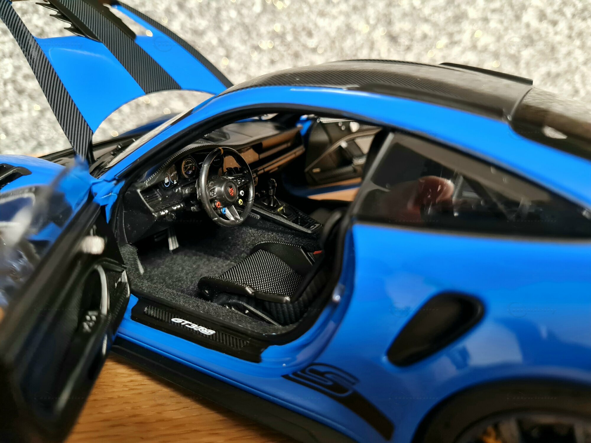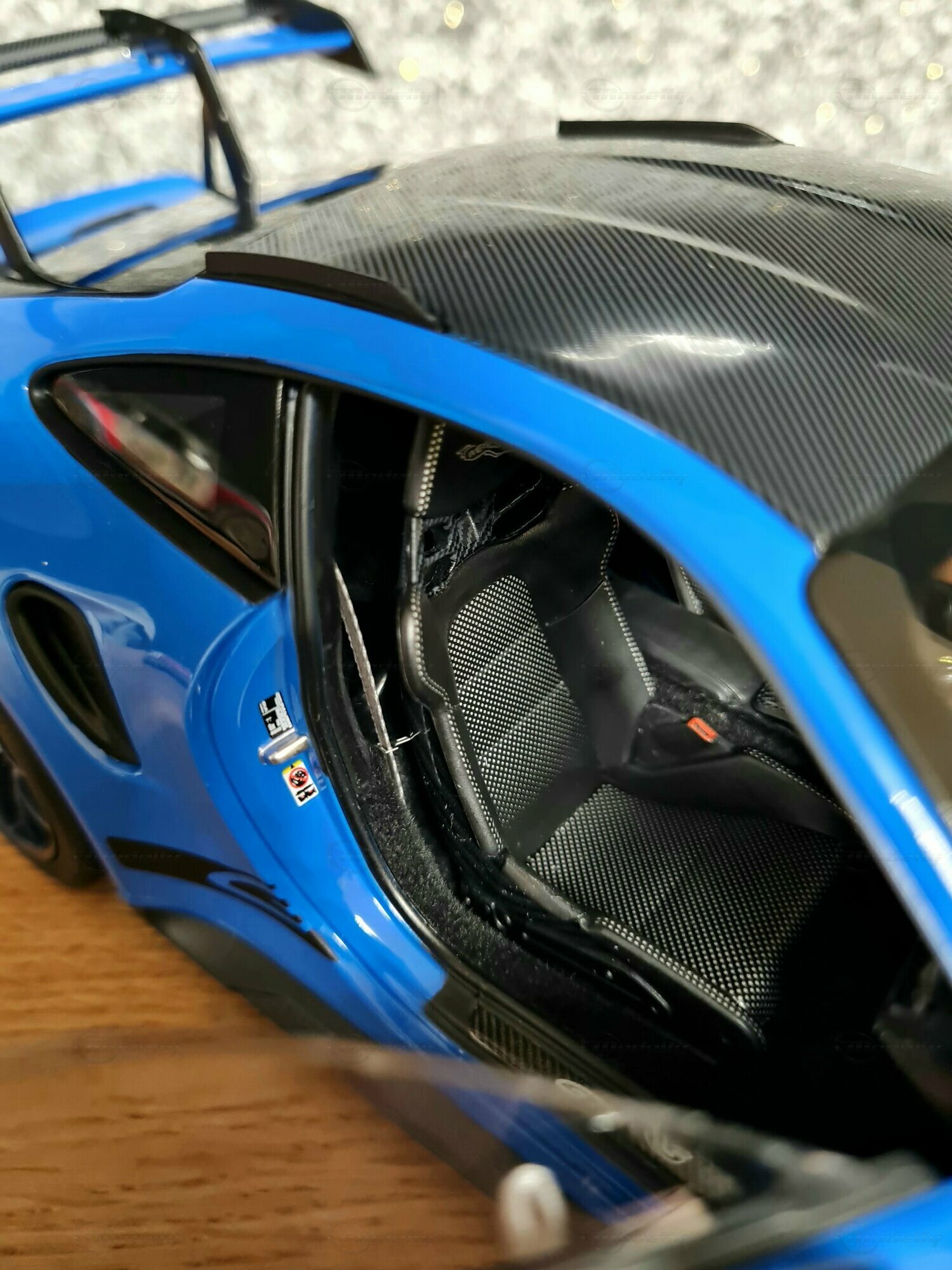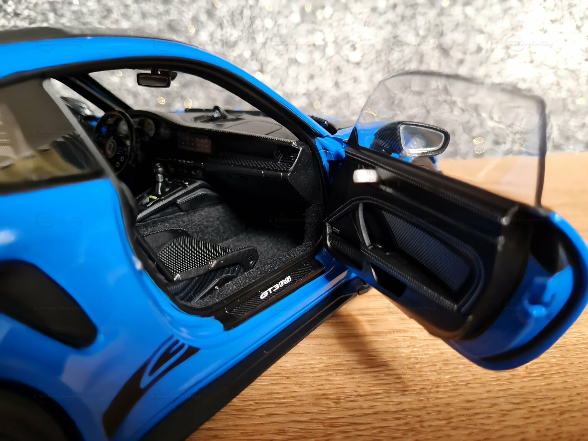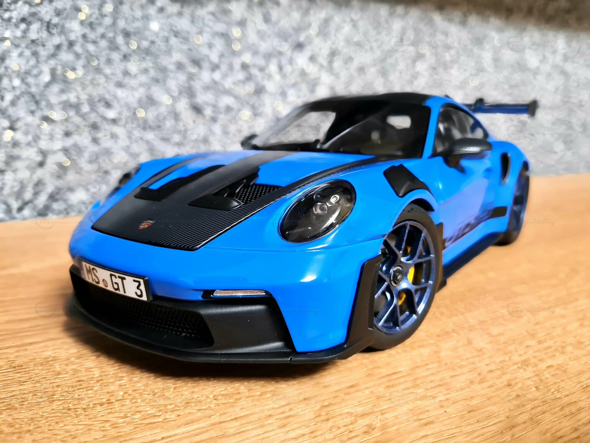 The Norev 1/18 scale model of the Porsche 911 (992) GT3 RS is a real eye-catcher, especially in the vibrant blue color seen in the photos. Norev achieves the depiction of the model with a combination of blue paint and black accents, creating an authentic appearance that perfectly captures the enthusiasm and beauty of the original GT3 RS. The miniature model showcases details such as the ventilation slits on the hood, the large rear wing, and the distinctive side stripes bearing the "GT3 RS" lettering. These characteristic features mirror the aggressive and aerodynamic design of the original. Even more impressive are the wheels, clearly depicting the sporty rims and brakes with yellow calipers on the model. Every detail is carefully transferred to the model to reflect the charm and precision of the real vehicle.