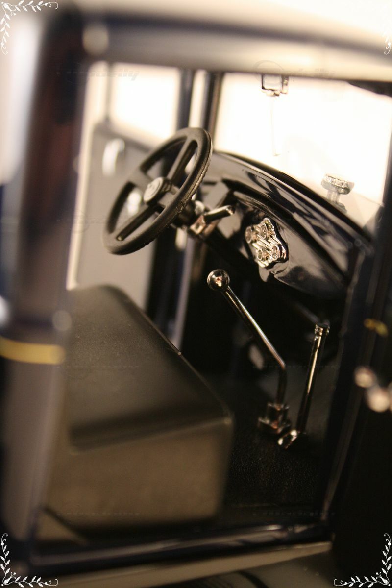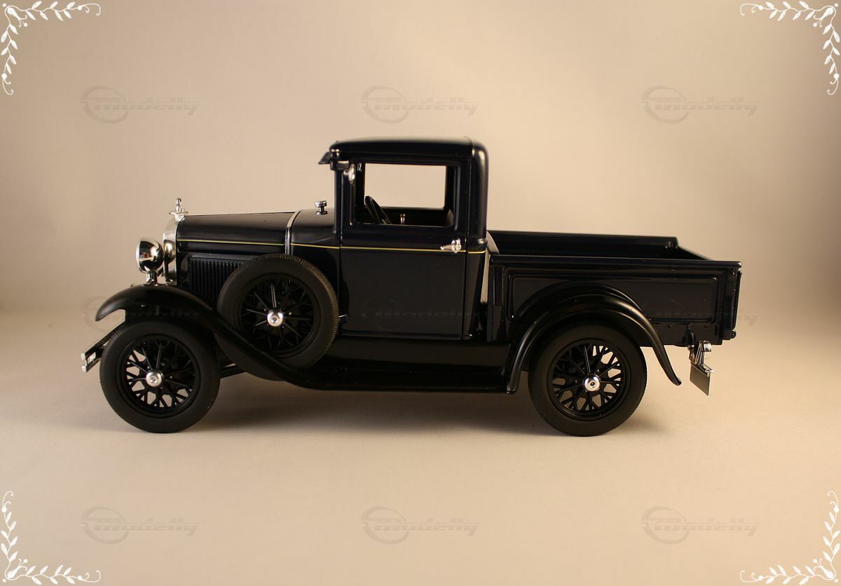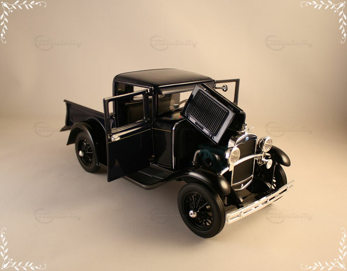 The model shown here is a detailed replica of the Ford Model A Pickup in a 1/18 scale. This model car was crafted by Signature Models using Diecast material known for its durability and ability to capture fine details. It is featured in the collection of Modelly member "Play-X". The model showcases excellent bodywork and an authentic black finish. Noteworthy are the fine details like the chromed bumpers, front headlights, and authentically replicated grille. The interior is also faithfully recreated, including the seats and dashboard.