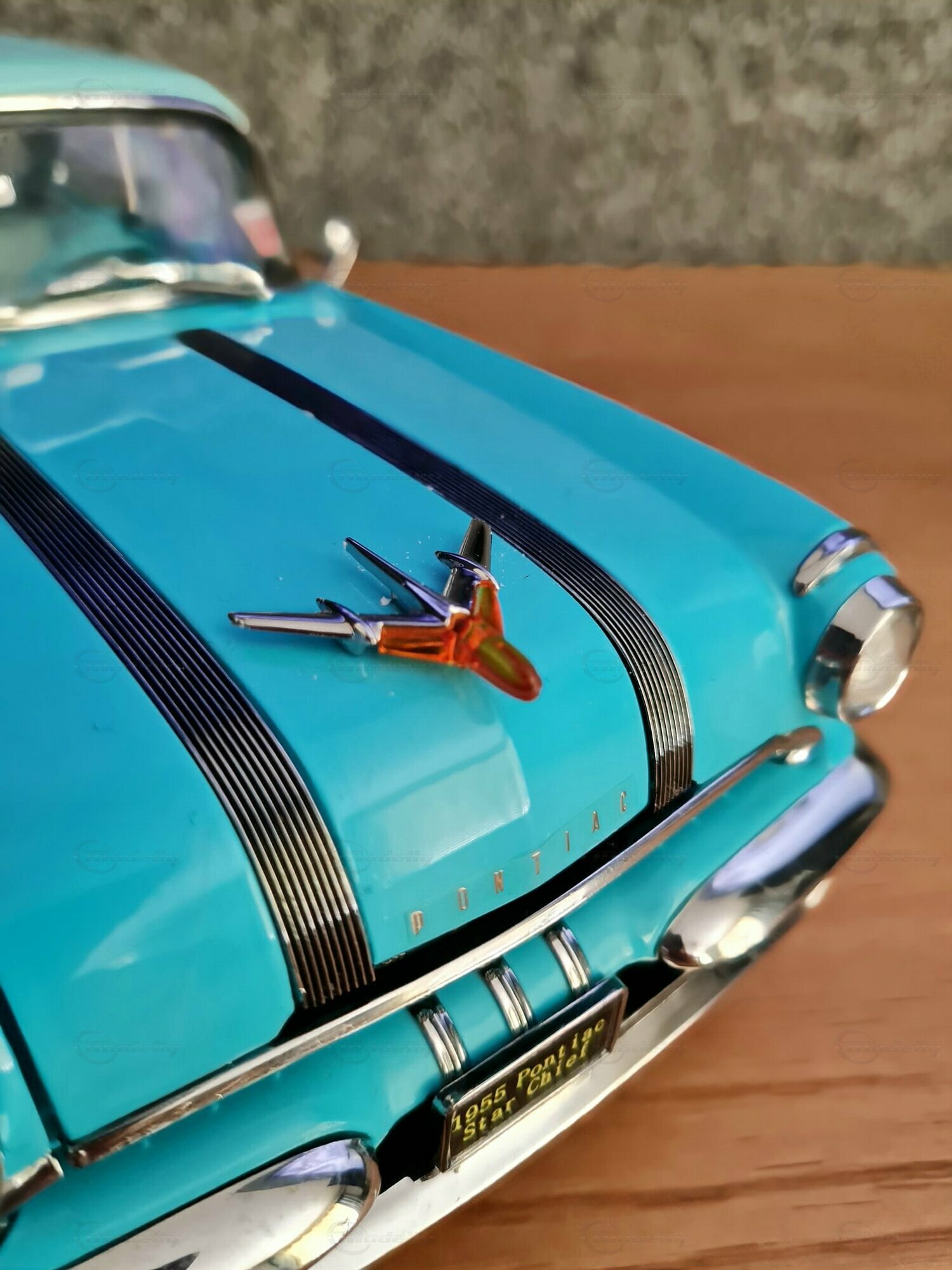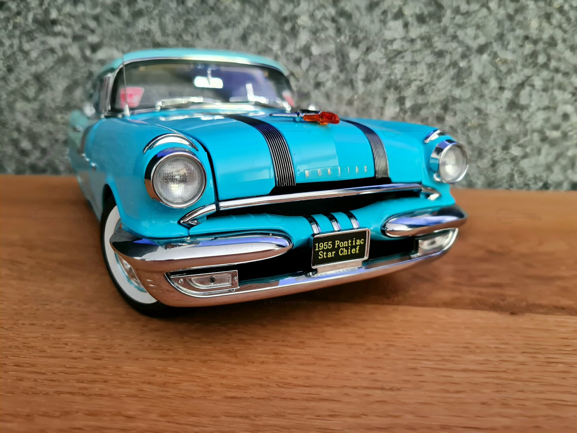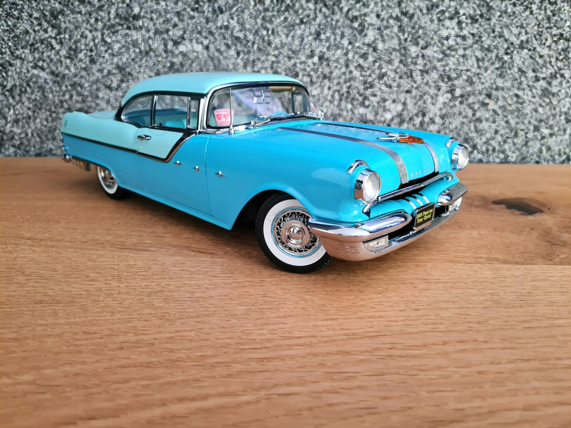 The Pontiac Star Chief is a classic American car that was produced in the 1950s. To be more specific, the miniature shown is based on the 1955 model, which belongs to the second generation of the Pontiac Star Chief produced from 1955 to 1957. The Pontiac Star Chief was one of the most prestigious vehicles of the Pontiac brand at that time and represented the top model of the brand. Designed with elegant and distinctive lines under the guidance of Harley Earl, the car made a mark in the automotive world. In 1955, the year this car was first built, notable films like "The Treasure of the Sierra Madre" hit the screens, and Disneyland, the famous theme park, opened its doors.