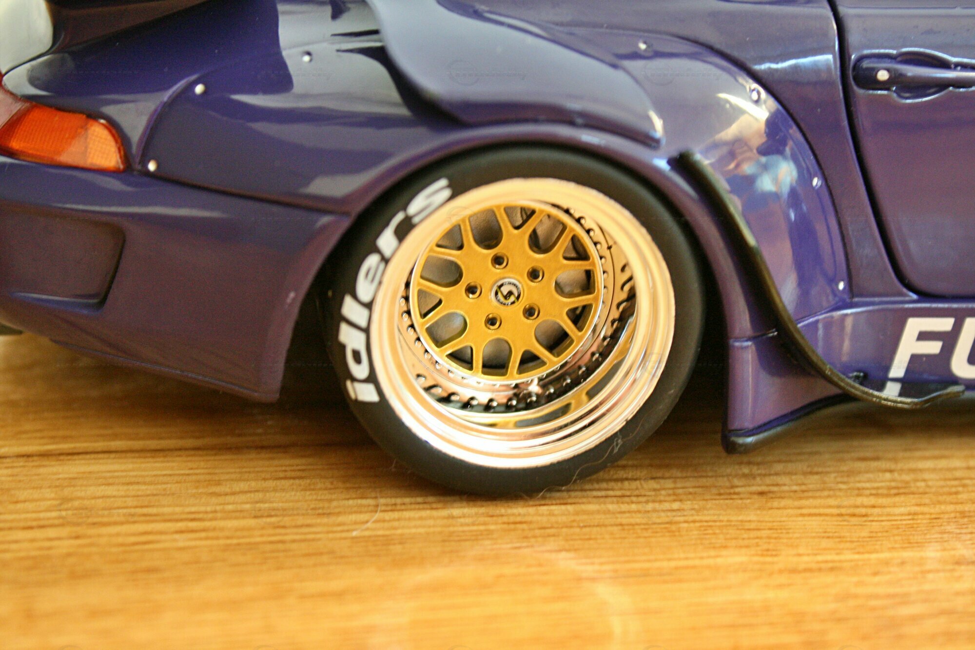 The miniatures shown are based on a tuned version of the Porsche 911 (993) that was modified by the Japanese company RAUH-Welt Begriff (RWB). Founded in 1997 by Akira Nakai in Chiba, Japan, RWB is known for its unique widebody kits and aggressive design features. RWB has earned a reputation by combining the elegance of the 911 (993) with more extreme bumpers, wider fenders, and a massive rear wing. These drastic changes not only enhance the visual presence of the vehicle but also improve handling and aerodynamics. The RWB components visible in the pictures, including the special bumpers and fenders, are characteristic of the brand and give the vehicle its unmistakable look.