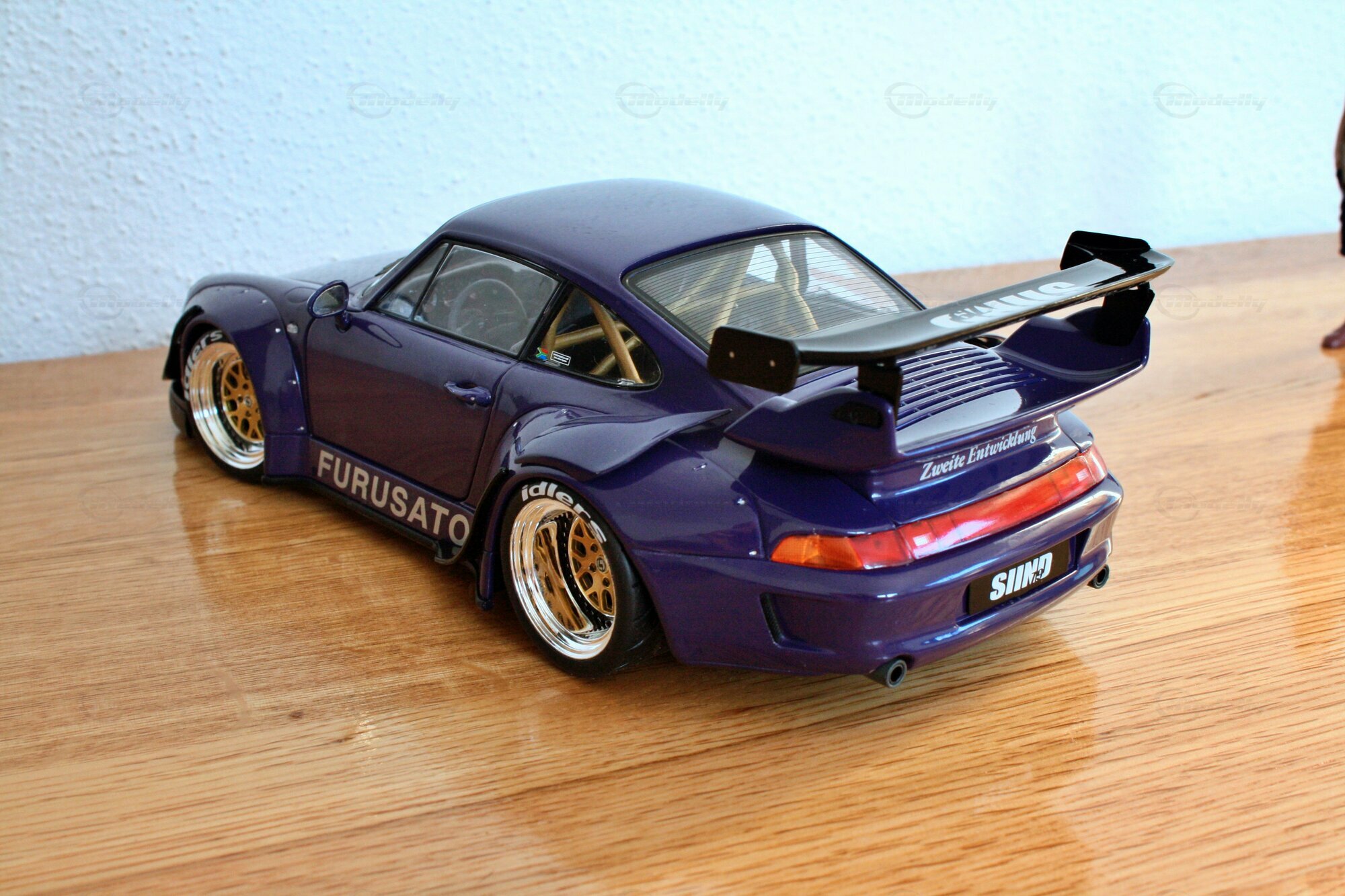 The showcased model car in 1/18 scale was manufactured by Werk83. This detailed replica is a highlight for any collector and miniature enthusiast. The model is made of diecast material, ensuring high detail and stability. Visible details include the golden BBS wheels and the striking blue color scheme. The high-quality paintwork immediately catches the eye, while decals like "Furusato" and "RAUH-Welt" emphasize the affiliation with RWB. Particularly impressive is the wide rear spoiler, symbolizing the aggressive aerodynamic characteristics of this vehicle. All logos and decals are accurately printed, making the miniature model look authentic and realistic.