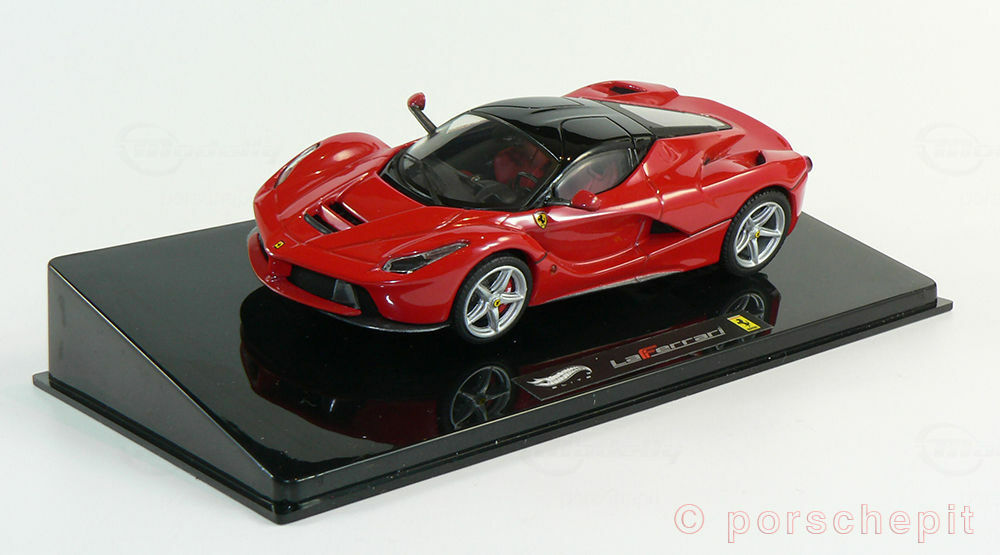 This model car showcases the iconic Ferrari LaFerrari with impeccable precision. The red paintwork combined with the black roof gives the model a striking look. Every detail, from the tiny Ferrari emblems to the accurate replica of the wheels, is perfectly executed. The model's wheels strongly resemble the original lightweight alloy wheels of the LaFerrari, emphasizing the authenticity of this model. This miniature is based on resin, which is often used in high-quality models to enable precise and intricate details.
