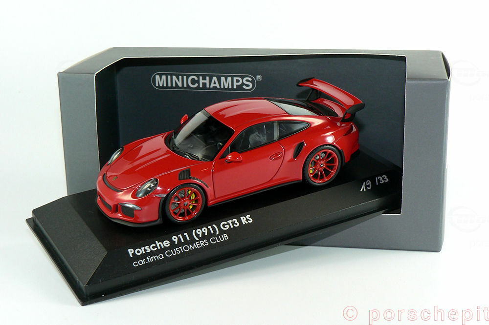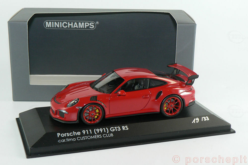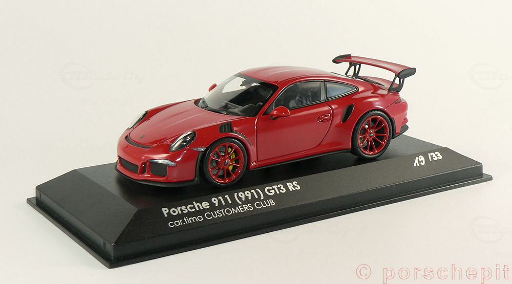 For collectors and model enthusiasts, the 1/43 scale model by Minichamps / Cartima offers a precise and detailed replica of the Porsche 911 (991) GT3 RS. Included in the collection of Modelly member "porschepit," this model stands out for its accurate and high-quality craftsmanship. Made from diecast material, this miniature provides exceptional durability and precision. From the look of it, the model is painted in a striking red hue, perfectly reflecting the aggressive yet elegant character of the original. The wheels are painted in a matching red, further accentuating the model's sportiness.