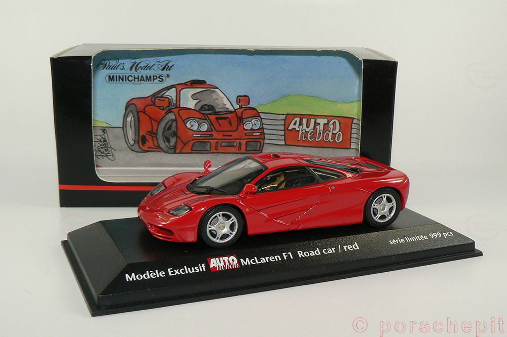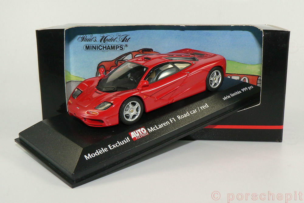 This exclusive 1/43 scale model car of the McLaren F1 was manufactured by the renowned brand Minichamps. This miniature is part of the outstanding collection of Modelly member "porschepit". The model stands out for its attention to detail and high-quality craftsmanship. Made of die-cast material, it offers an impressive representation of the original. Every aspect of the design has been carefully reproduced, from the aerodynamically shaped body to the fine details of the interior.