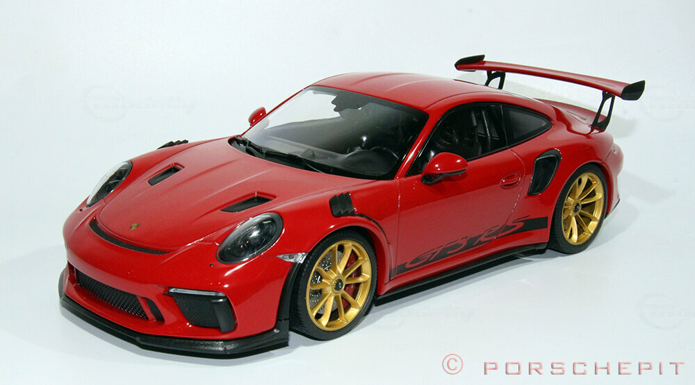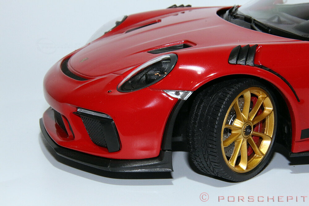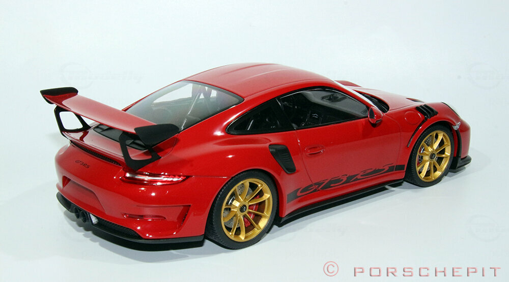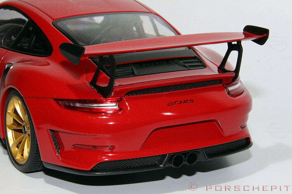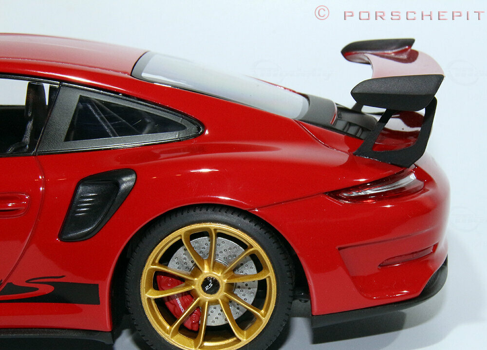 The 1/18 scale model perfectly reflects the dynamic lines and aggressive stance of the real Porsche 911 (991 II) GT3 RS. The golden wheels that give the model a special accent are particularly eye-catching. The brakes with their red calipers are detailed replicas, further emphasizing the model's authenticity. The rear wing and the thin taillights are characteristic design elements that have been carefully replicated in this model.