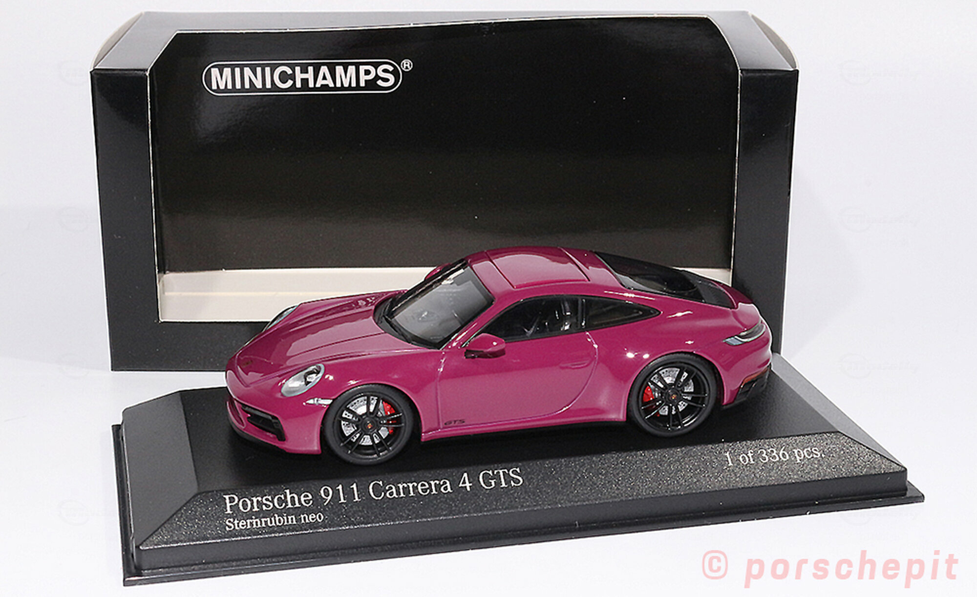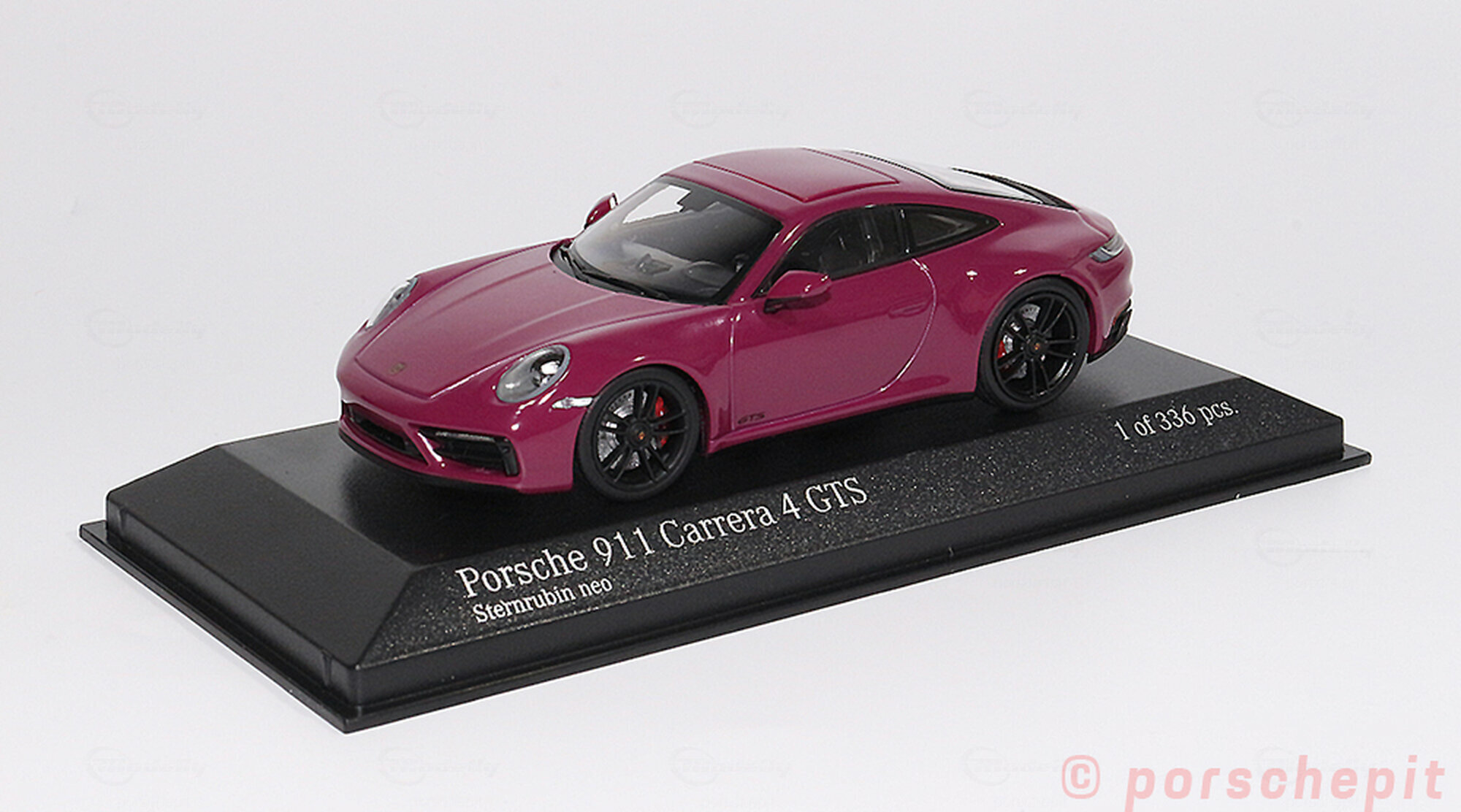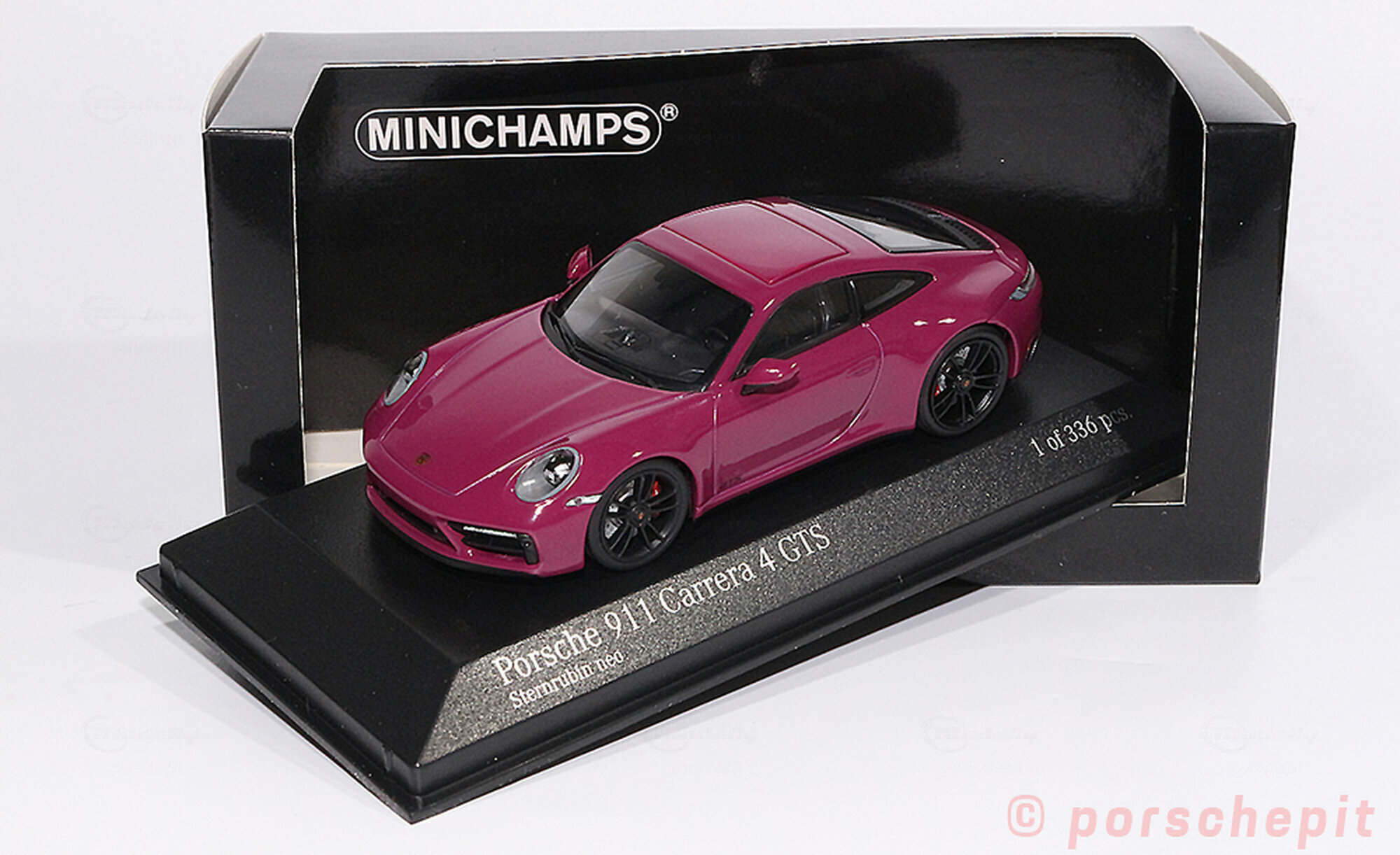 The scale model of the Porsche 911 (992) Carrera 4 GTS in 1/43 scale, manufactured by Minichamps, is a detailed replica of the original vehicle made of durable die-cast material. This model car is a limited edition, restricted to only 336 pieces worldwide. It stands out for its high-quality craftsmanship, faithfully capturing the distinctive features of the original. The striking Sternruby neo paintwork adds a touch of elegance to the model, enhancing the classic lines and contours of the vehicle impressively.