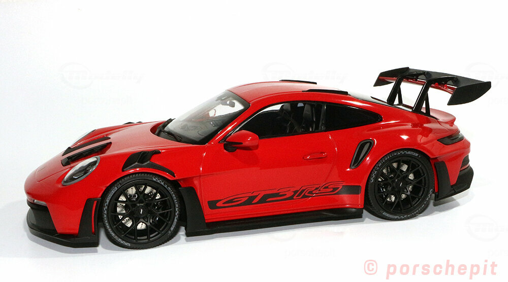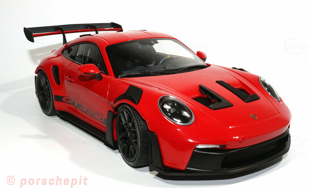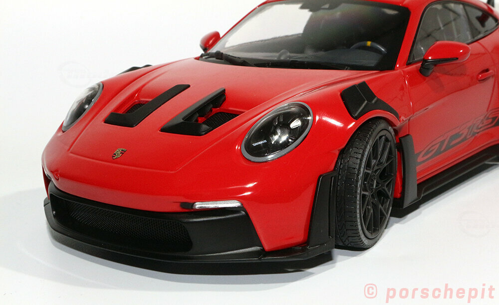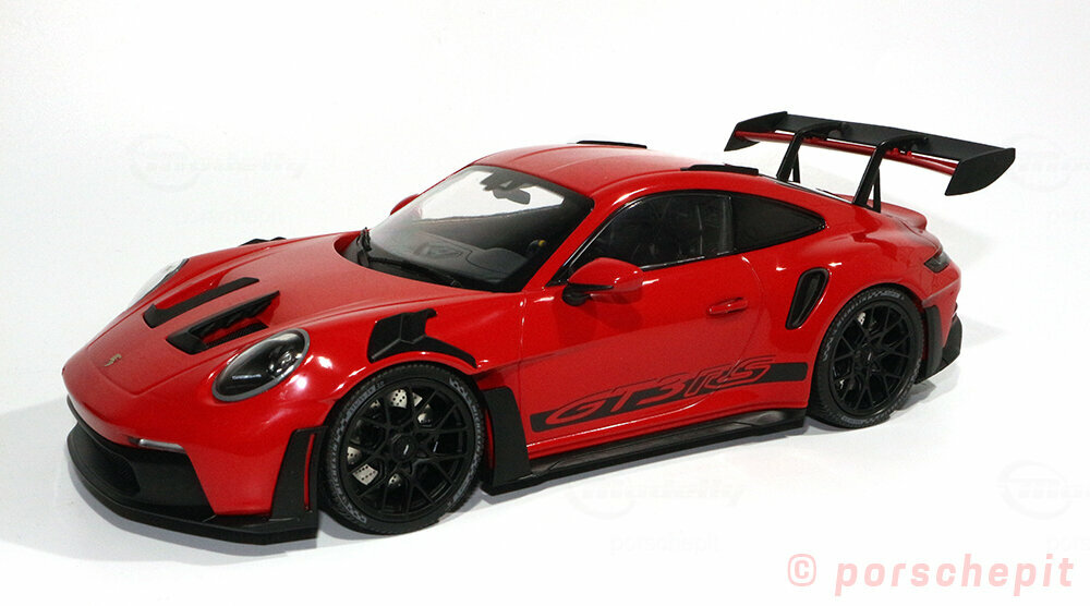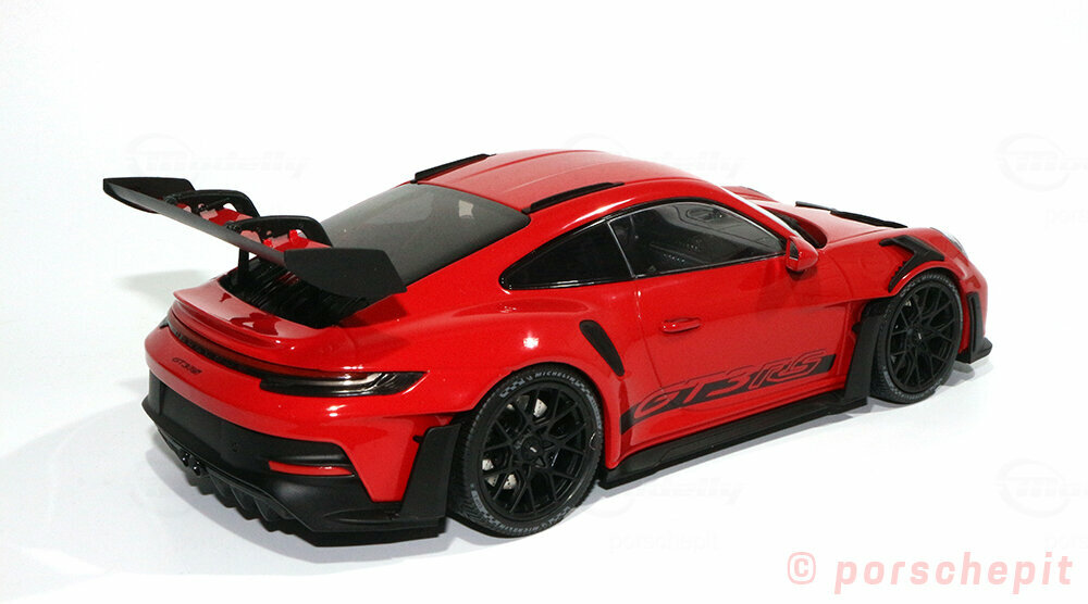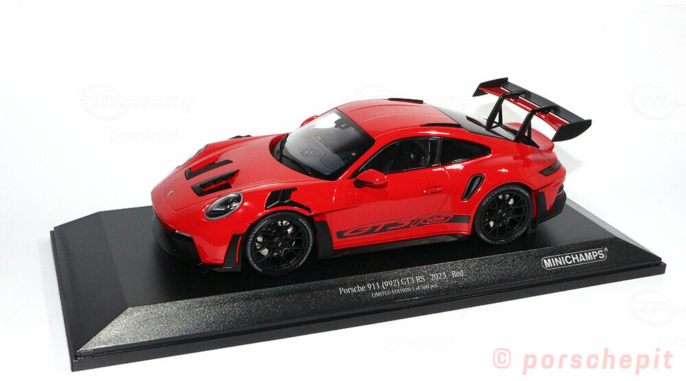 This Minichamps model is a faithful replica of the Porsche 911 (992) GT3 RS. It is crafted from the high-quality Diecast material known for its durability and accuracy. Noticeable in this model are the movable parts, exact reproduction of ventilation outlets, mirrors, and the distinctive rear wing. The vibrant red paint with black accents and the detailed interior perfectly reflect the original. Notably, this model is a limited collector's item. Only 300 pieces are available worldwide, significantly enhancing its collector's value.