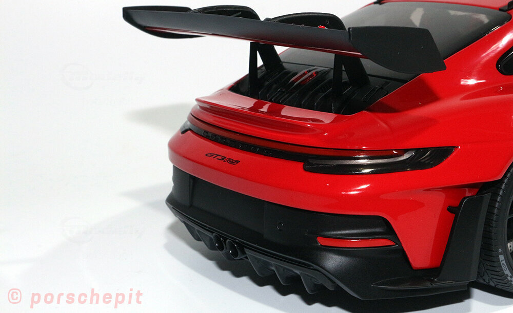 The showcased model, part of the collection of Modelly member "porschepit," impresses with its flawless craftsmanship and attention to detail. The special multipart black sports seats, dashboard, and precise reproduction of the wheels highlight the high craftsmanship. Visible highlights of this model include the perfectly replicated brake systems and the sharp Porsche logos. It showcases how well Minichamps combines craft precision with the faithful reproduction of the design of the Porsche 911 (992) GT3 RS.