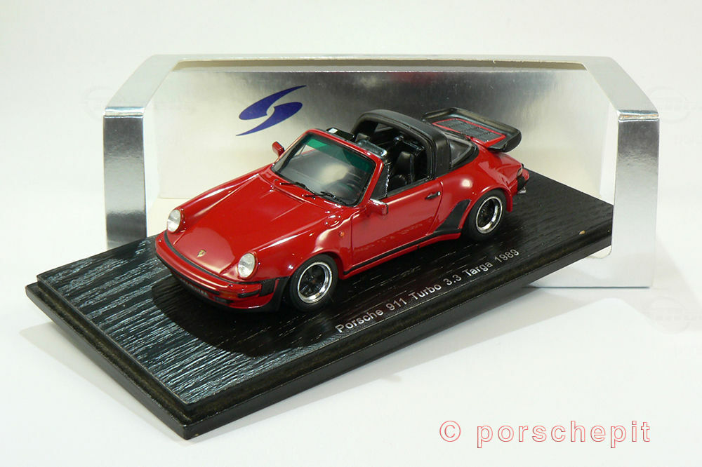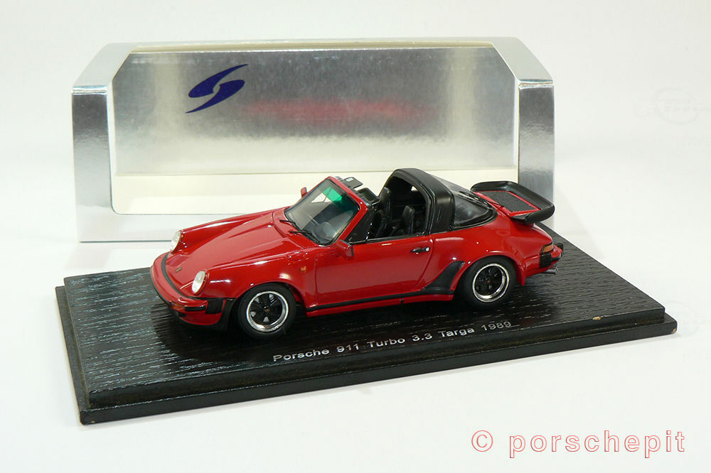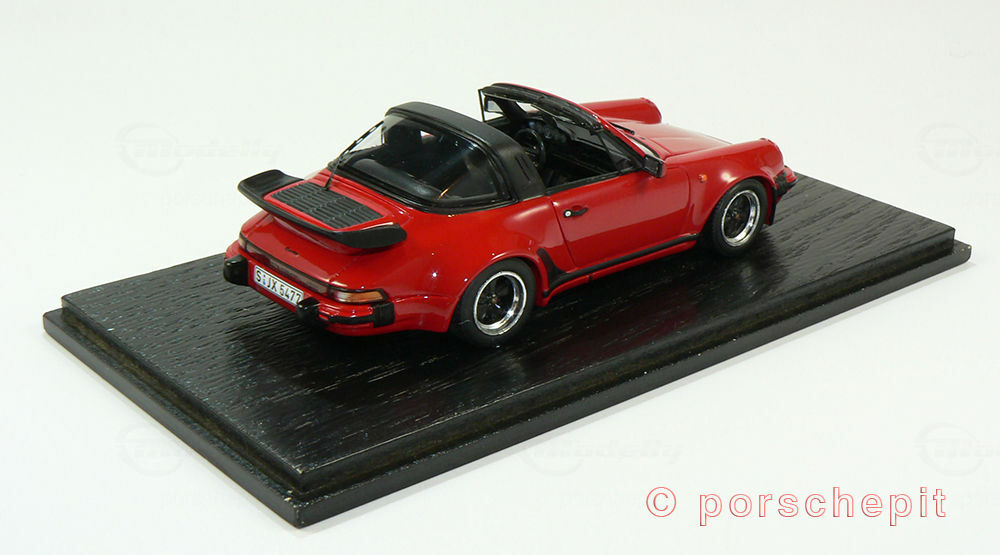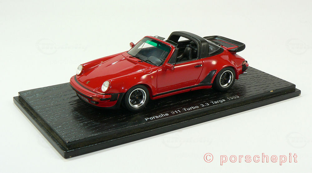 This 1/43 scale model car, crafted by SPARK, is a precise replica of the Porsche 911 (930) Turbo 3.3L Targa. Made from high-quality resin material, it offers an accurate portrayal and flawless craftsmanship. The miniature dazzles with its authentic red paintwork, complemented by black accents on the body parts. Notably, the accurately reproduced rims and the iconic turbo rear spoiler stand out. Model car collector "porschepit" owns this model, and it is a true gem in their collection.