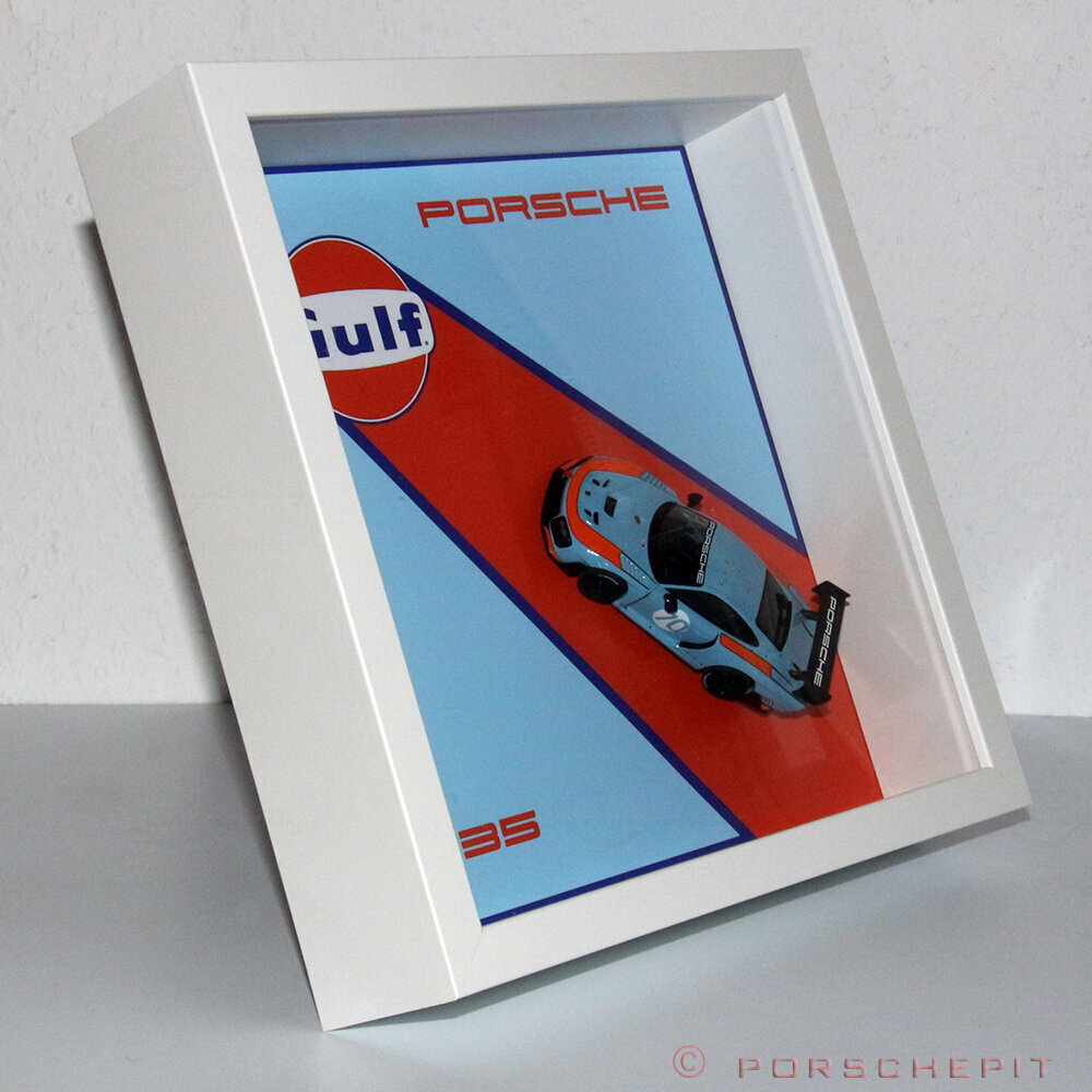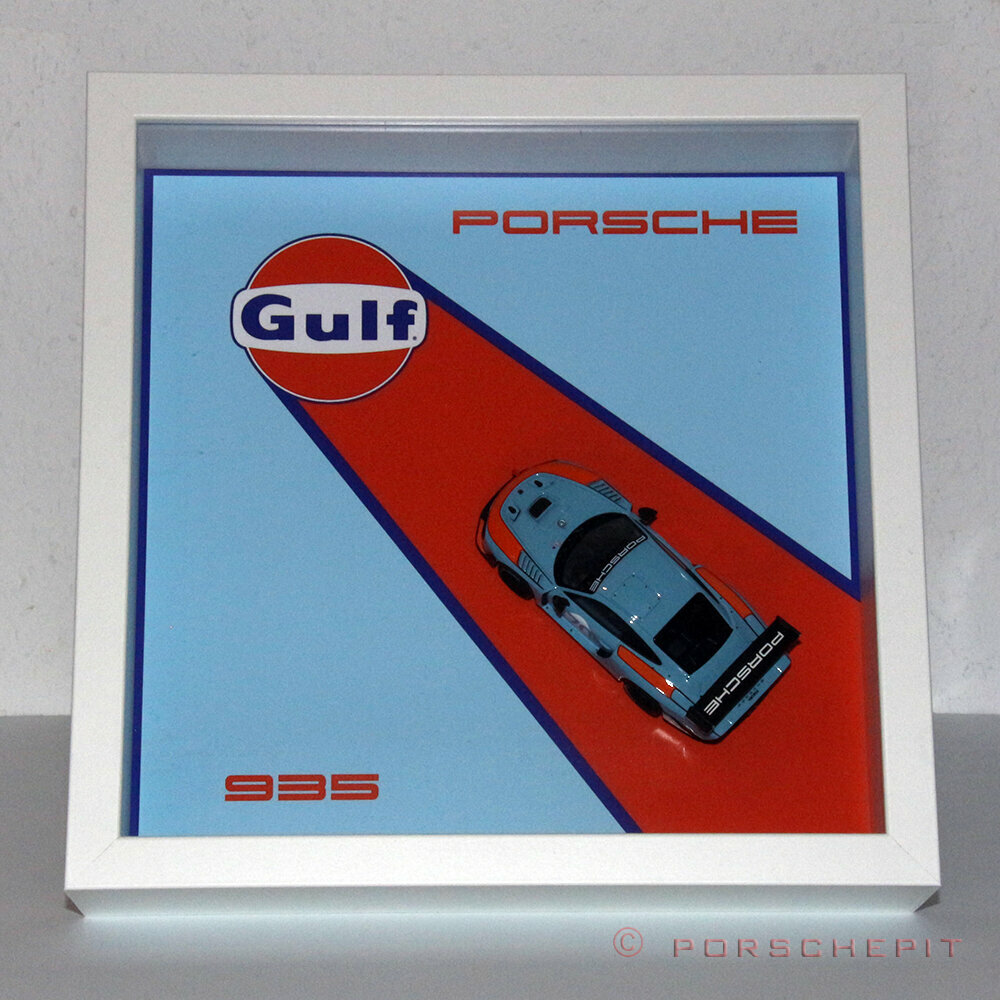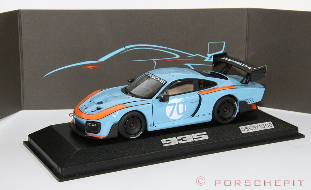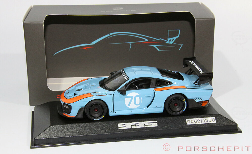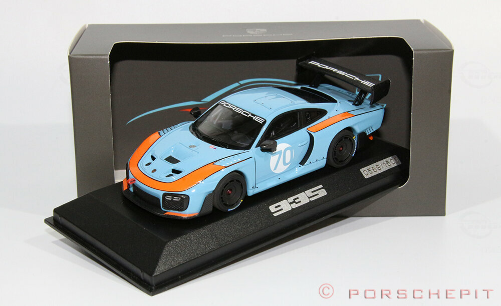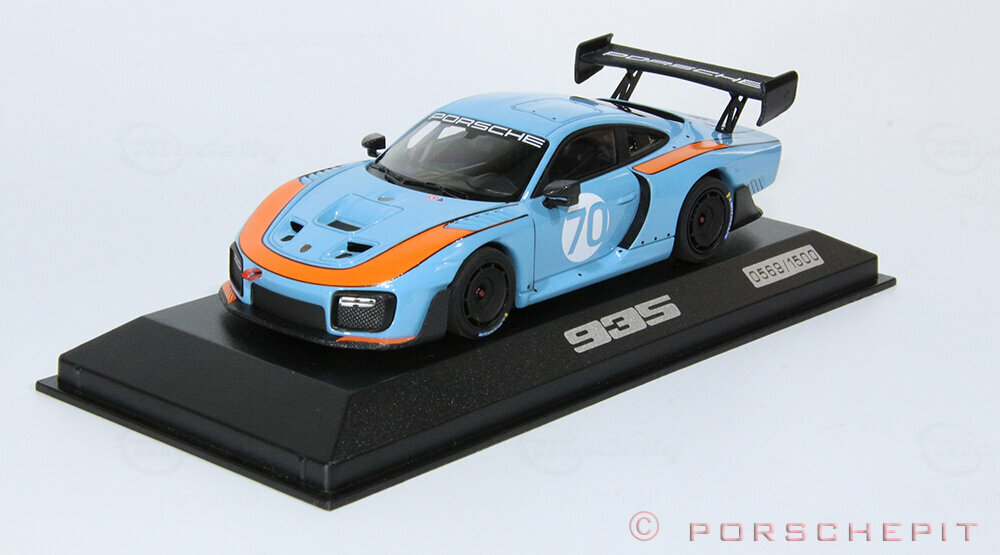 The showcased miniature model in the 1/43 scale by SPARK is an exact replica of the Porsche 935 in the iconic Gulf livery. This livery is famous for its light blue base color with orange accents, making the model visually striking. The starting number "70" is printed on the hood and side doors. The model also features the prominent Porsche and Gulf sponsor logos, making this version of the Porsche 935 unmistakably associated with motorsport.