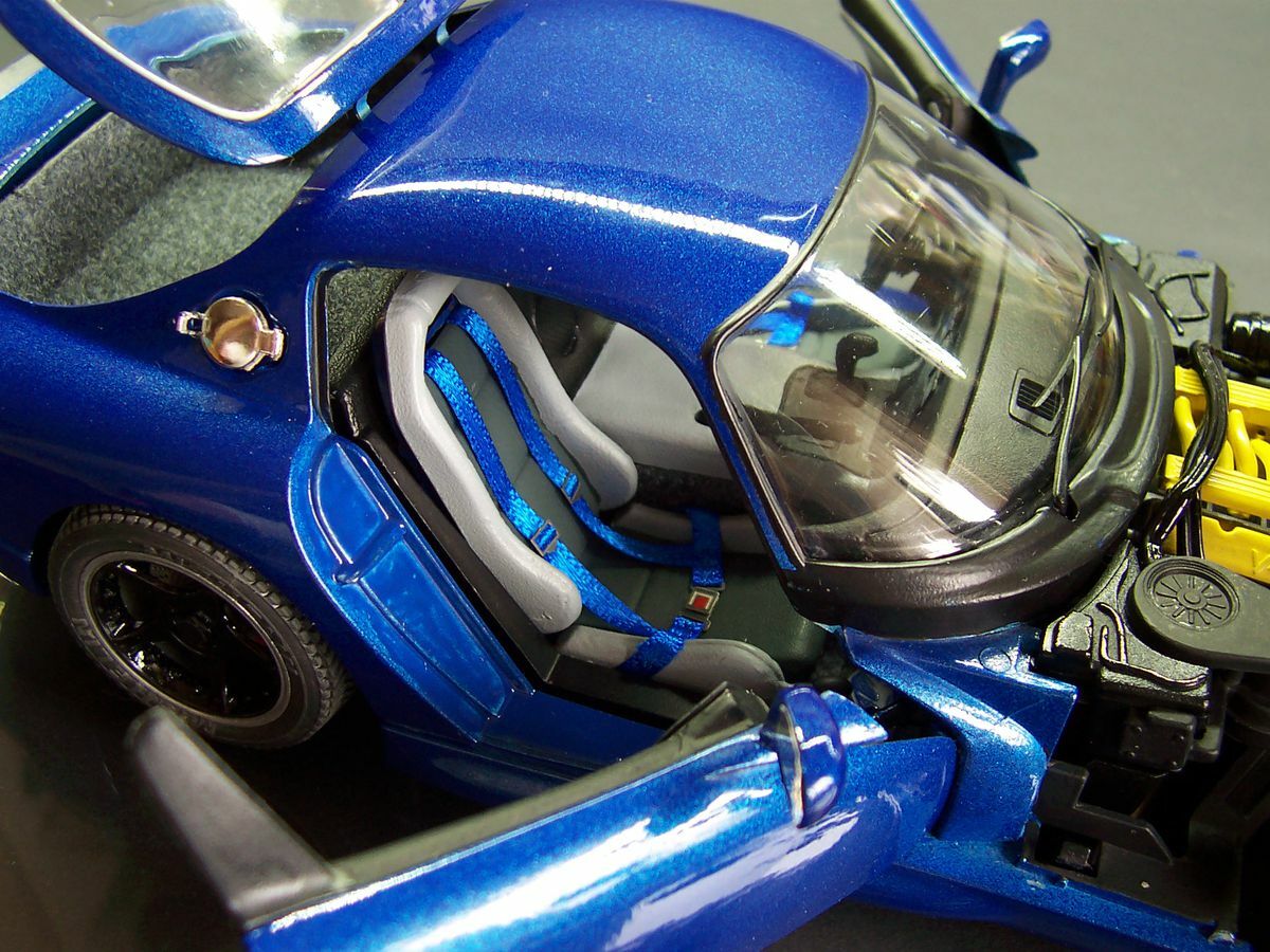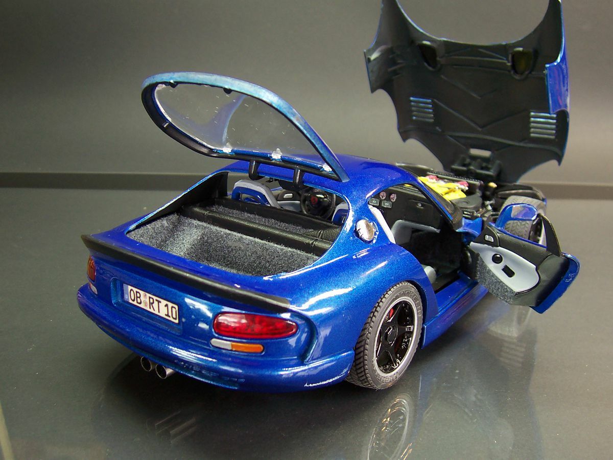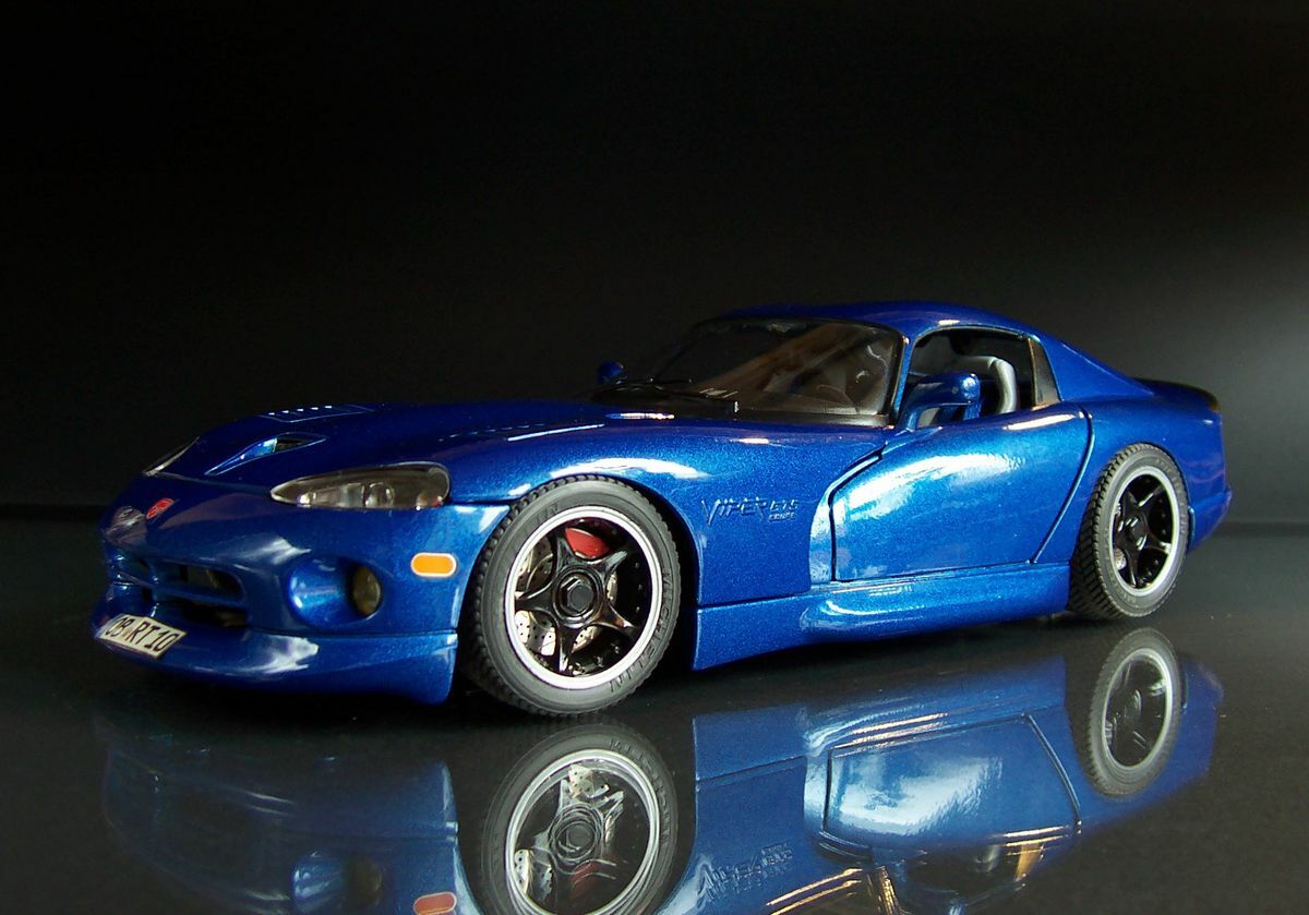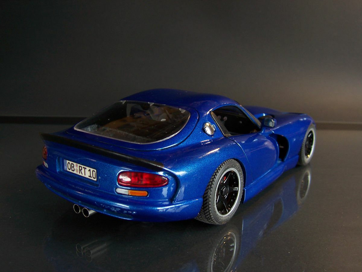 The 1/18 scale model car by Bburago is a faithful replica of the Dodge Viper GTS. Particularly noteworthy is that the model showcase object is made of die-cast, a material known for its durability and resistance. The detailed metallic blue paint job and the intricate details like the air intakes and the front headlights reflect the aggressive design of the original. Please note that this model is from the collection of "Schraubaer61" and has been modified. It does not represent the standard original product from Bburago. The vehicle in the photos has a unique touch with tuned elements that give the collector's piece a distinct personality.